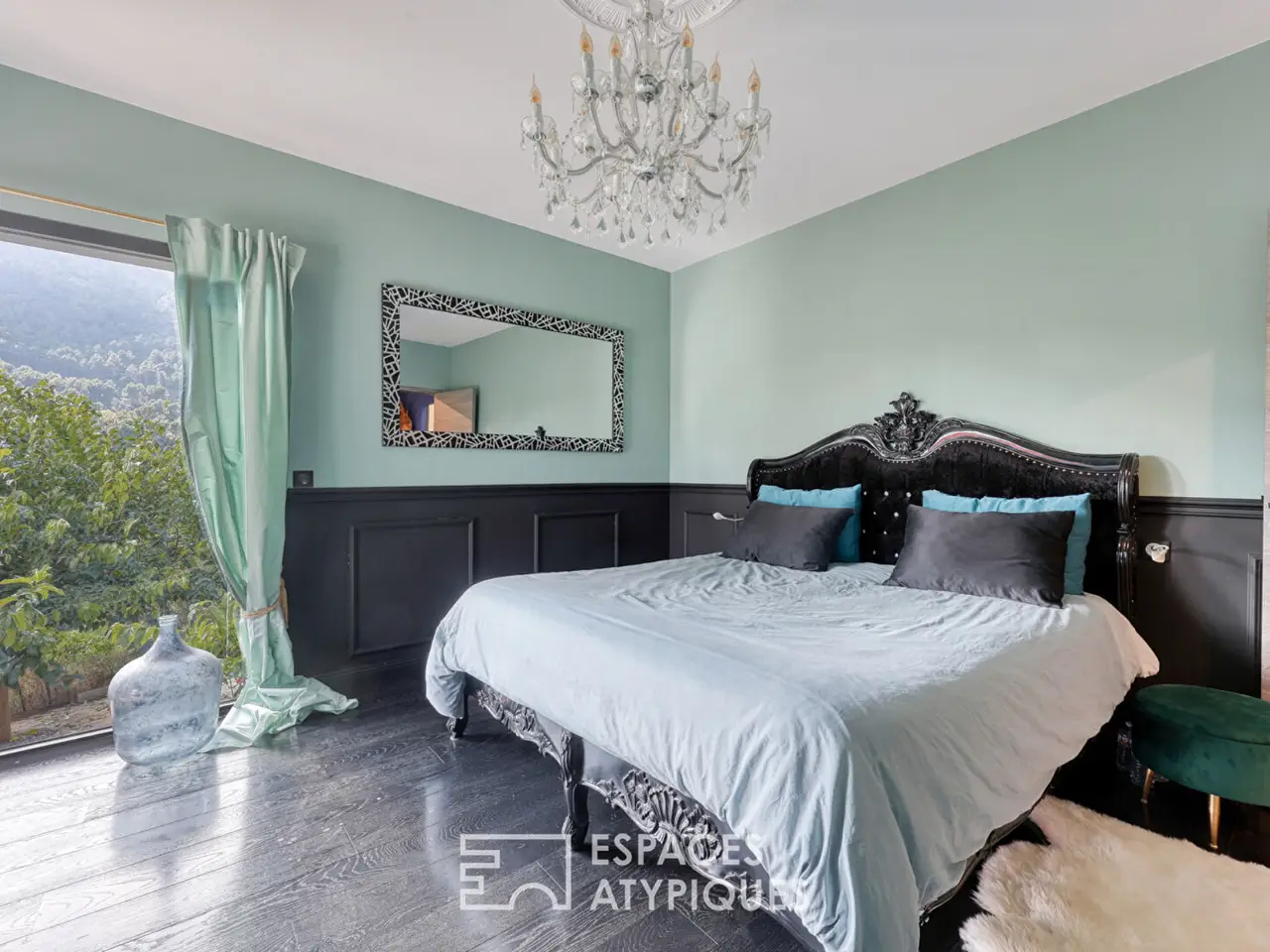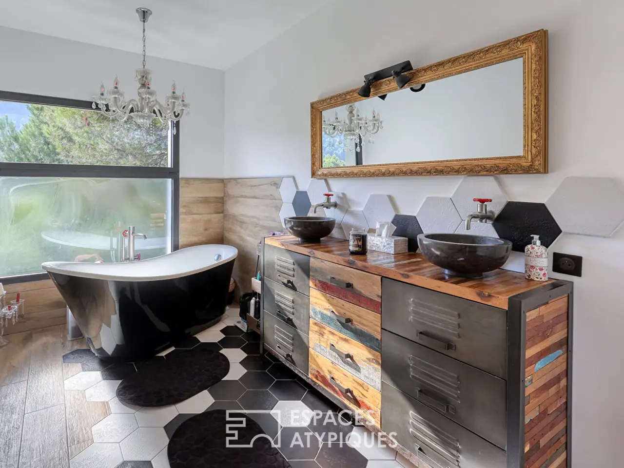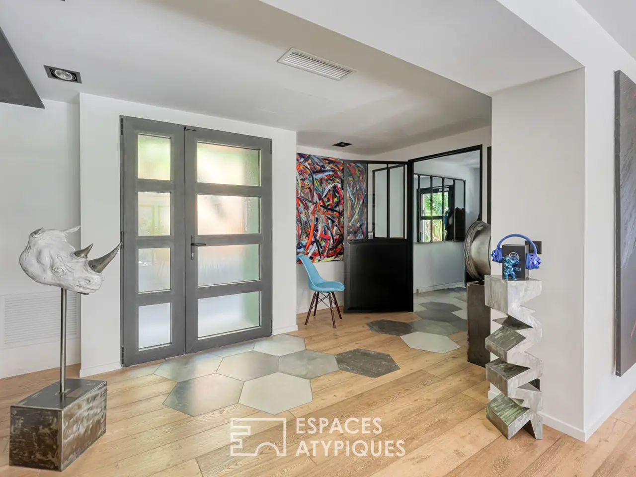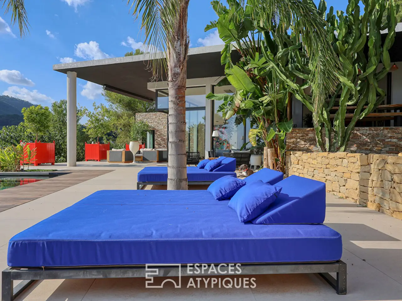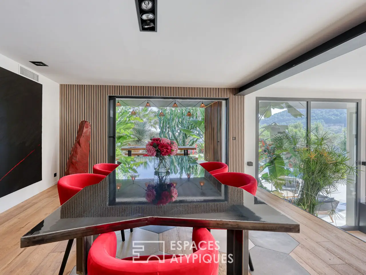 Villa contemporaineIn a green setting just 10 minutes from the sea between Toulon and Hyeres in the Var region, this modern contemporary architecture house skillfully unfolds over 345 sqm offering a unique living experience, combining spectacular volumes, natural light, and design.Upon entering, the eye is drawn to the immense bay windows and high ceilings that give the whole an impression of space and elegance.The architecture plays with the inside-outside boundary, letting nature generously invite itself thanks to large sliding windows and concrete caps. Perspectives, materials, and colors respond to each other in a bold harmony.The large-format villa extends over a fully landscaped and automated plot of approximately 2,000 sqm, where each space has been designed to offer a rare and convivial quality of life. As if taken from a Kubrick film, the sunken living room offers a panoramic view of the exterior and stands out as a unique living space.The theatrical dining room harmoniously complements the living room, connected to a fitted and equipped kitchen, ingeniously designed for entertaining with its counter.The true heart of the house, this ensemble creates a warm and unique atmosphere. It opens widely onto an elegant set of sheltered terraces and a heated infinity pool, facing the hills and the sea. The serenity of the place is reinforced by lush, carefully maintained vegetation, which envelops the property in a feeling of intimacy and well-being. On the night side, the villa offers five bedrooms, including two suites, all designed with noble and custom-made materials.he generous volumes and numerous storage spaces testify to a successful design.On the lower floor, an art gallery-style home office reveals itself as a confidential space, ideal for working. The atmosphere continues in a room dedicated to evenings, where billiards, pinball, fireplace and sofas create a convivial setting.Outside, a bowling alley in the shade of the trees evokes the Mediterranean art of living.Fully controlled by home automation, it combines modernity, comfort and current standards. A wine cellar, annexes, a garage and parking for several vehicles complete this free-form property.A rare architectural work in the Var, designed for lovers of atypical spaces where design, conviviality and nature meet near the sea.ENERGY CLASS: A / CLIMATE CLASS: A Estimated amount of annual energy expenditure: between EUR1,207 and EUR1,392 (2021 price reference)Information on the risks to which this property is exposed is available on the Georisques website: www.georisques.gouv.frEspaces AtypiquesREF. 13327Additional information* 8 rooms* 5 bedrooms* 3 shower rooms* 4 floors in the building* Outdoor space : 2000 SQM* Parking : 5 parking spaces* Property tax : 4 000 €Energy Performance CertificatePrimary energy consumptiona : 47 kWh/m2.yearHigh performance housing*47kWh/m2.year1*kg CO2/m2.yearA*B*C*D*E*F*GExtremely poor housing performance* Of which greenhouse gas emissionsa : 1 kg CO2/m2.yearLow CO2 emissions*1kg CO2/m2.yearA*B*C*D*E*F*GVery high CO2 emissionsEstimated average annual energy costs for standard use, indexed to specific years 2021, 2022, 2023 : between 1289 € and 1745 € Subscription IncludedAgency feesThe fees include VAT and are payable by the vendorMediatorMediation Franchise-Consommateurswww.mediation-franchise.com29 Boulevard de Courcelles 75008 Paris
