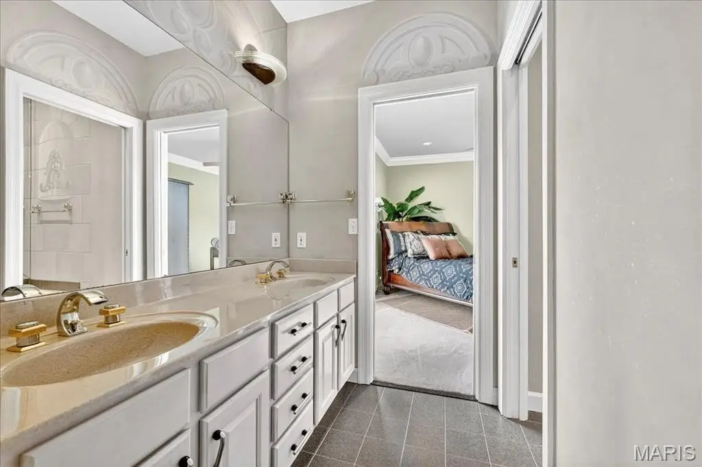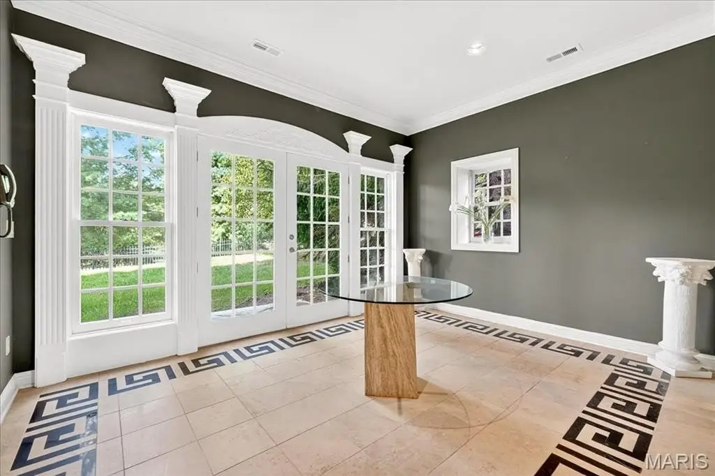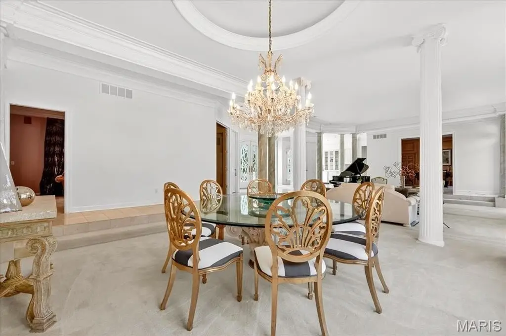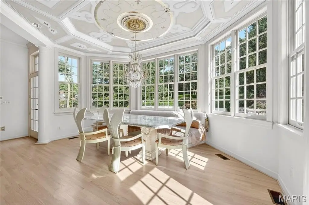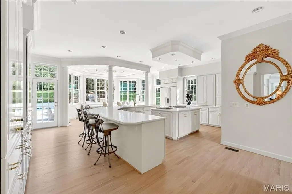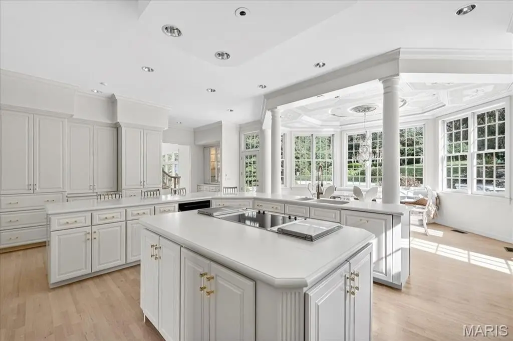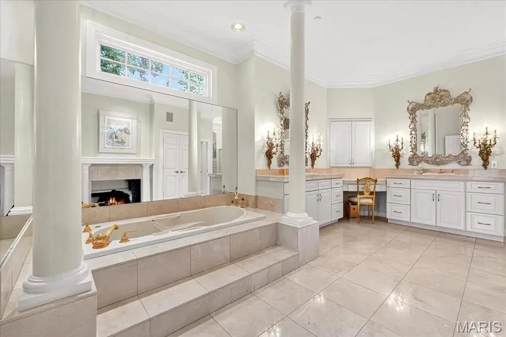 Poised for transformation, this Town & Country estate rests on nearly two beautifully landscaped acres in an exclusive gated enclave. Surrounded by trees, the lot provides unparalleled privacy, while the home’s generous square footage, resort-style amenities, and thoughtfully designed layout provide a perfect personalization opportunity. Designed for entertaining, the gracious foyer invites you into the expansive living room and dining room with floor-to-ceiling windows overlooking the stunning backyard—complete with a pool with waterfalls, tennis court, and lush landscaping for your personal oasis. The spacious eat-in kitchen offers abundant cabinetry, counter space, and a breakfast room with a built-in banquette. A cozy den is ideal for movie nights, while the billiards room provides a versatile space for games, an office, or library. The main-floor primary suite, with a gas fireplace offers dual walk-in closets, soaking tub, separate shower, and dual vanities. Upstairs are two bedrooms with a shared bath, one en-suite, and a flexible fourth bedroom or creative studio. The walk-out lower level checks all the boxes with a wine cellar, theater room, guest bedroom, full bath and kitchen. Additional highlights include a spacious first-floor laundry and mudroom, a secondary service entrance, and an oversized four-car garage. With its timeless setting and impressive grounds, this property provides the canvas for a new homeowner to create their own custom masterpiece.