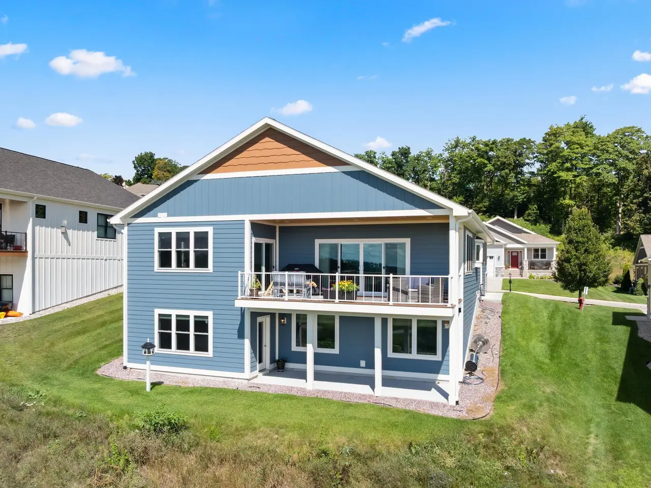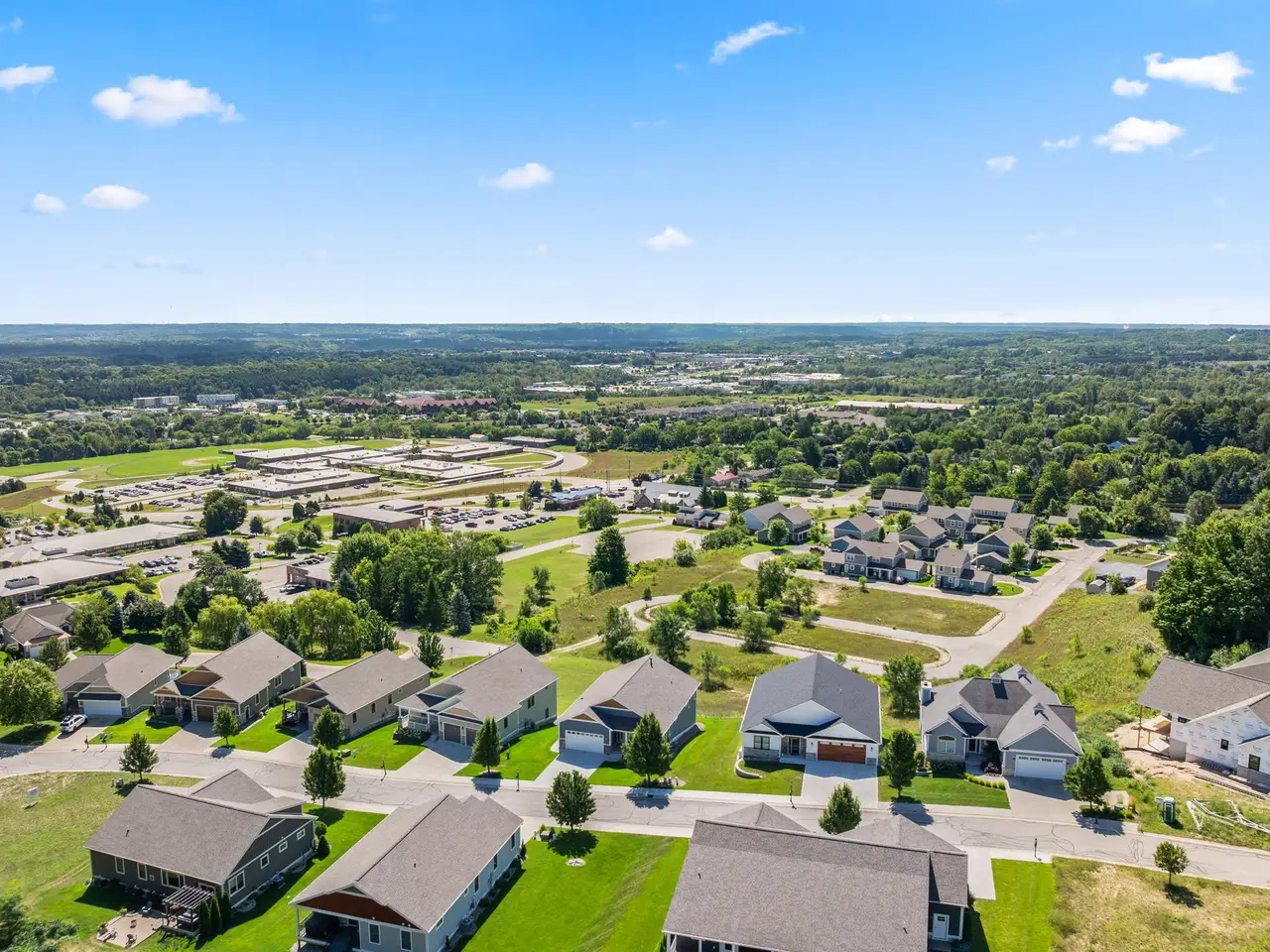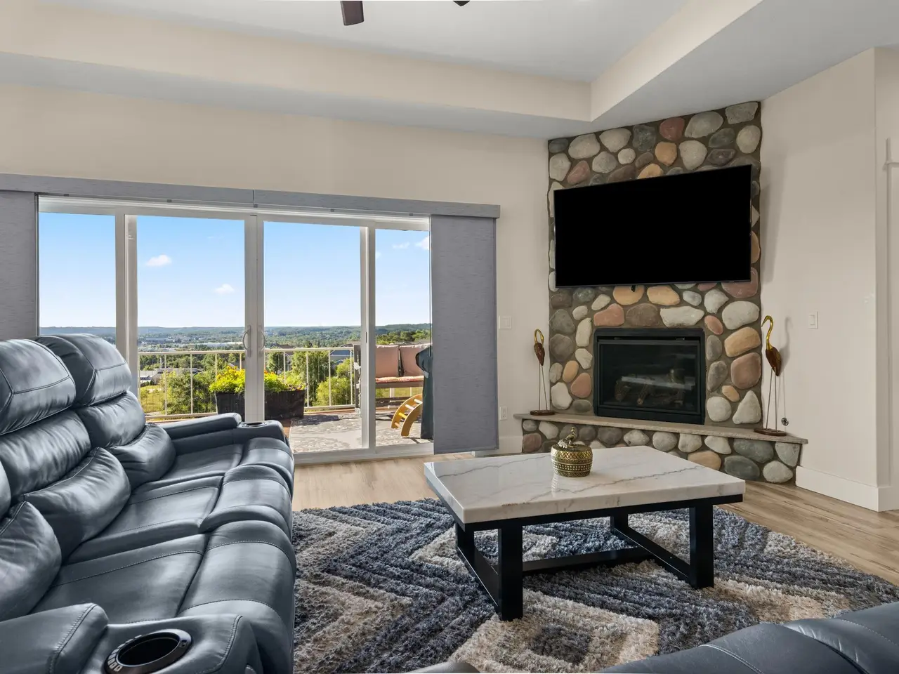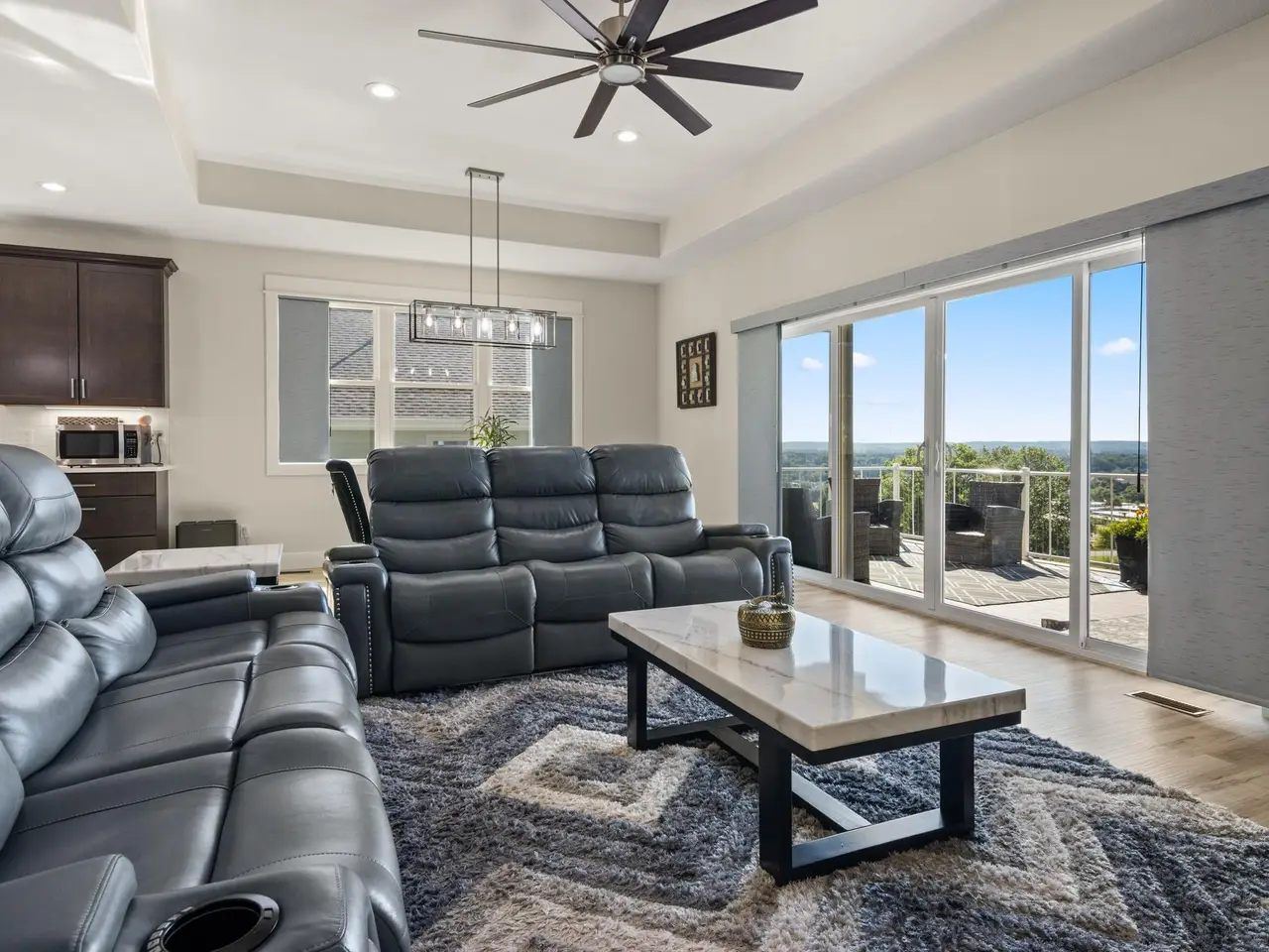 Welcome to Eagles View -- One of Traverse City's Premier Communities! This like-new, one-owner custom-built home offers the perfect blend of style, comfort, and functionality in one of Traverse City's most desirable developments. Its sweeping views make a stunning, picturesque backdrop. Thoughtfully designed with attention to detail throughout, this residence provides the ease of main-floor living in an open and inviting layout. The spacious primary suite features a private bath and a walk-in closet. The primary bedroom has a trayed ceiling to add to the luxurious look. The bright and modern kitchen is equipped with granite countertops, stainless steel appliances, a large island, a pantry, and extra shelving. The living and dining areas showcase a trayed ceiling, a stunning stone-surround gas fireplace, and double...yes, double sliding doors that open to a private rear patio -- perfect for relaxing or entertaining. Luxury vinyl plank flooring runs through the main living areas, and the home includes central air conditioning for year-round comfort. All of the bathrooms have tile flooring. The main floor also offers a convenient laundry room just off the attached two-car finished garage. The finished lower-level walk-out includes two additional bedrooms, a full bathroom, a spacious family room, a recreational area, and ample storage space. Professionally landscaped by Living Art Landscapes, the yard is equipped with irrigation and provides a serene outdoor oasis. This home is ideally located just minutes from downtown Traverse City, Munson Medical Center, shopping, schools, and numerous hiking and biking trails.