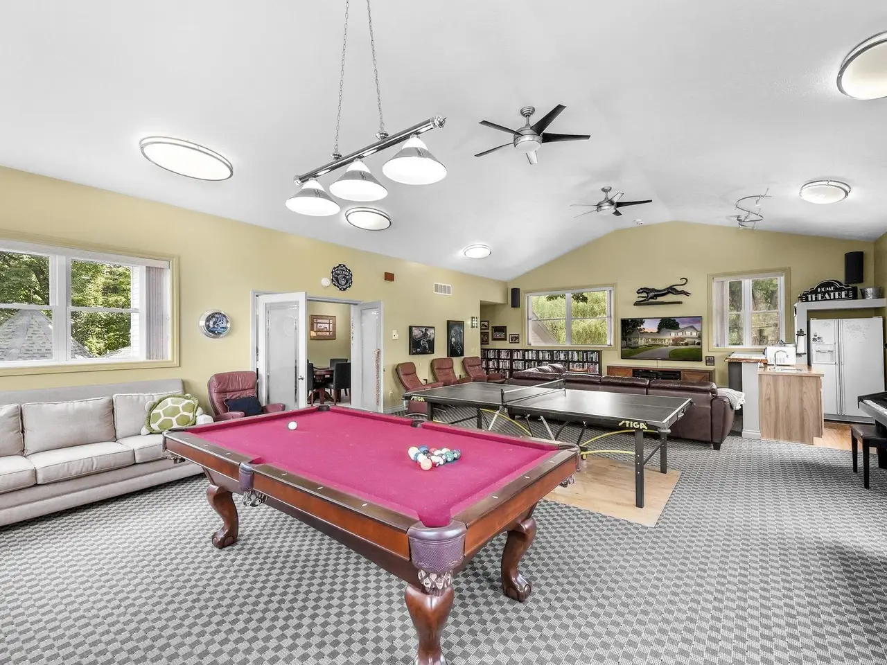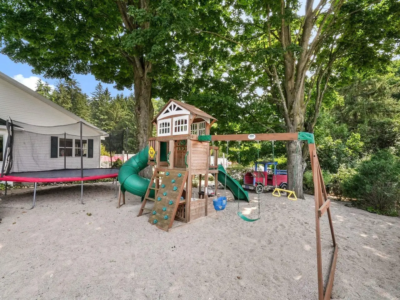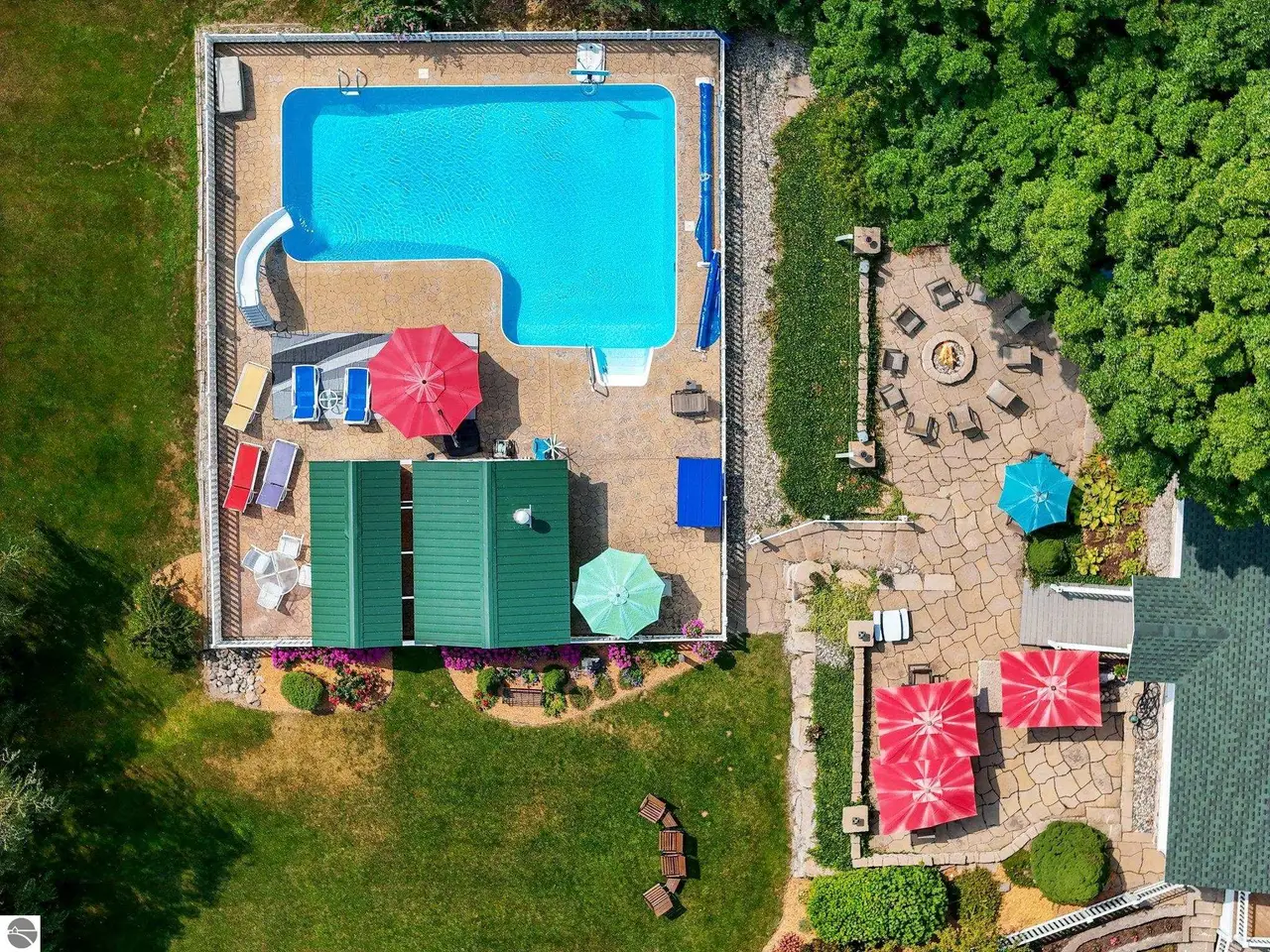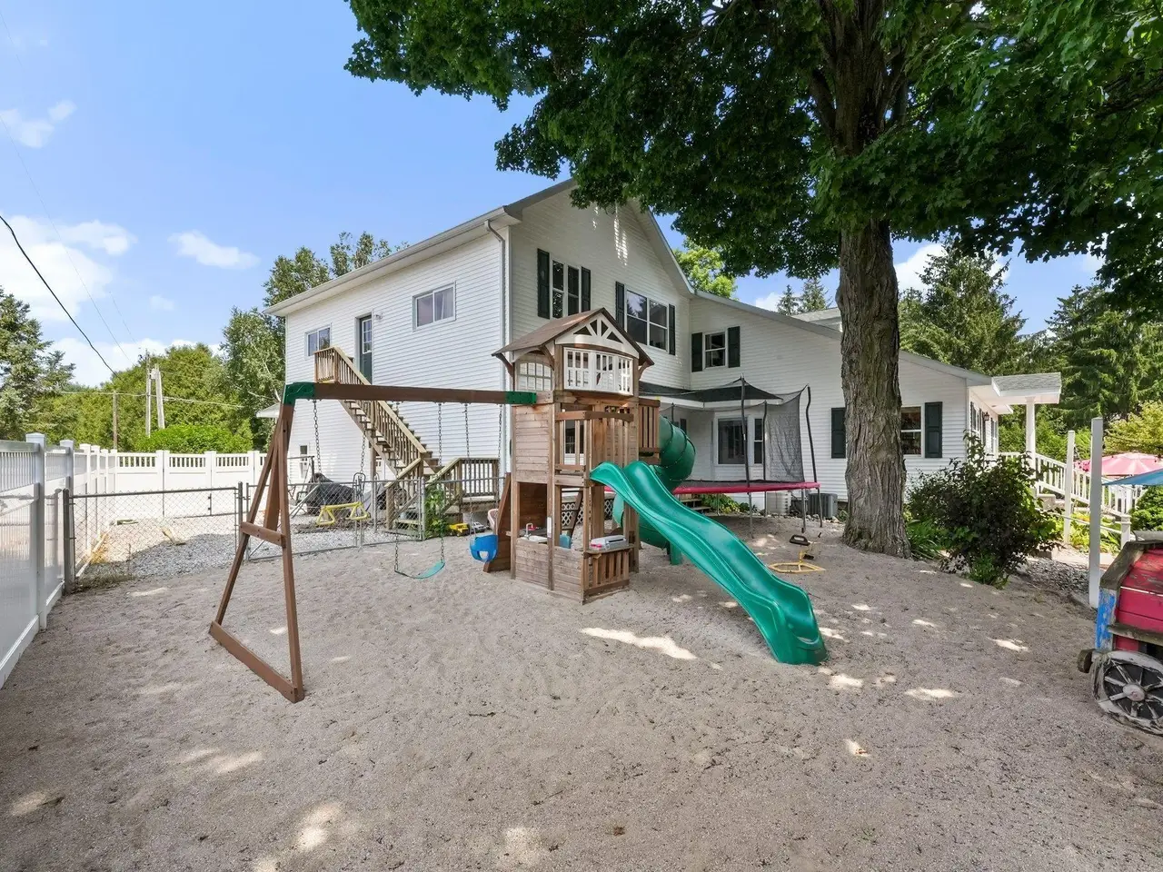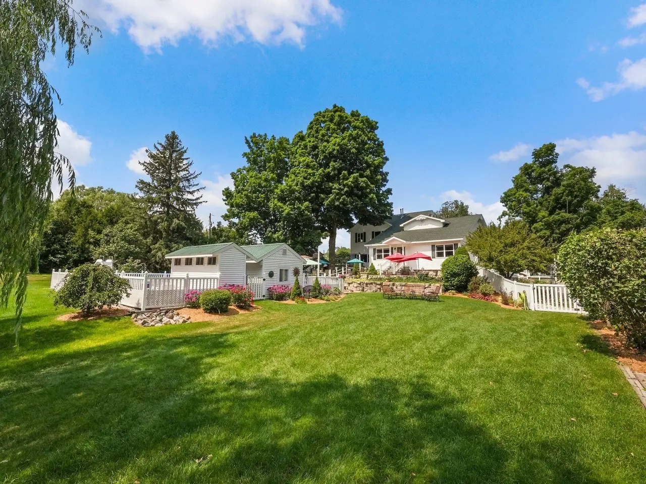 Welcome home! This is how you will feel as you enter this incredible two-story home. Designed for entertaining or lots of room to play, this home has something for everyone. Inviting foyer opens to spacious main flooring living room with gas fireplace and dining area. Gracious island kitchen with hardwood flooring, stainless appliances and solid surface counter tops. Main floor primary suite has a private bath with a jacuzzi tub and a tiled walk-in shower. Upper level features fully loaded family room with kitchenette, and room for all your guests. Full finished walkout lower level with sauna. Exceptional grounds include wrap around covered porch, in-ground heated pool, pool house, changing rooms, and playground area. There is truly something for everyone here, adult "playground" can be found in the 24 foot x 118 foot heated, insulated finished pole building, with four designated areas, last stall features raised ceiling. Secondary 16 x 36 barn with heat/ac and water. In addition to five-plus acres, home comes with shared Silver Lake access. Well maintained home ideally situated a short drive to Traverse City. Majority of home was built in 1998 small portion original to 1948.
