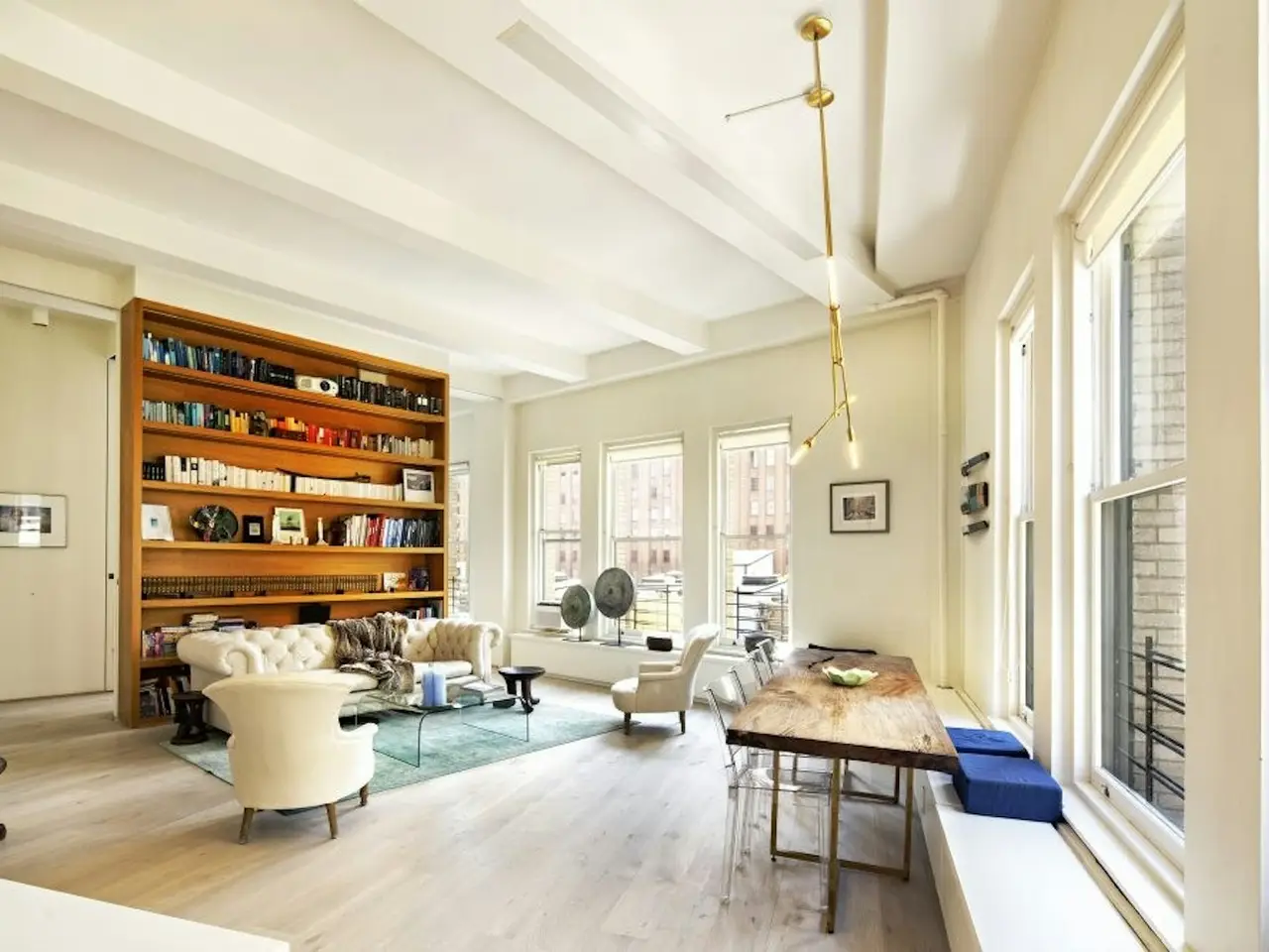 A rare opportunity to live in an EXCEPTIONAL TRIBECA LOFT!! Soaring 12 foot beamed ceilings throughout with dramatic floor-to-ceiling windows that flood every room with natural sunlight and showcase iconic open southern views of downtown Manhattan. From the moment you enter, a canvas unfolds, creating a harmonious tapestry of calm amid the energy and excitement of living perfectly positioned in the very heart of Tribeca, between Franklin and Leonard Streets. An artfully designed open-floor plan successfully integrates the living room, dining room and kitchen, all anchored by a 9.5 foot custom-designed, floor-to-ceiling oak bookcase. The ceiling in the living room cleverly conceals an electrically operated drop-down 93x39 Elite Screen for those stay-at-home immersive movie nights. The impeccably renovated open kitchen features a long center island with Corian countertops perfect for the master chef and for entertaining. Top-of-the-line appliances, include a Viking gas stove, Miele dishwasher and dryer, Gaggenau fridge and freezer, Wolf oven and range, U Line wine fridge, warming oven,pantry and an abundance of storage. An in-unit Miele washer-dryer of course! The adjacent dining area is as functional as it is beautiful, easily accommodating a 10-person table beneath striking designer lighting. It is ideal for intimate dinners or larger gatherings surrounded by picture postcard views of some of Tribeca's great architectural buildings. The primary bedroom is awash with its open southern exposure, accommodates a king-size bed and custom closets. The second bedroom enjoys the same radiant natural light and is perfect as a child's room, den, office or for your guest. The bathroom is nothing short of spa-worthy. Artfully designed to include double sinks and an oversized walk-in shower with dual large shower heads. This architect who created this beautiful apartment is Dieter Vander Velpen and was featured in the Belgian Financial Times as well as in the interior design book The Ultimate Guide to Apartments by Beta Plus. 100 Hudson Street is one of Tribeca's iconic boutique Loft buildings. With just a handful of residences, it offers quiet privacy, exceptional architectural character and a roof terrace with skyline views that stretch across the city. The very soul of TRIBECA is just outside your door cobblestone streets, Michelin-star dining, land-marked architecture, world-renown art galleries, and Hudson River park just a stone's throw away. Whether it's morning espresso at Bluestone Lane, brunch at Bubby's, dinner at Locanda Verde or a delightful stroll through Duane park, this is downtown living at its very best!! Offered furnished or unfurnished By Appointment. Welcome Home!!