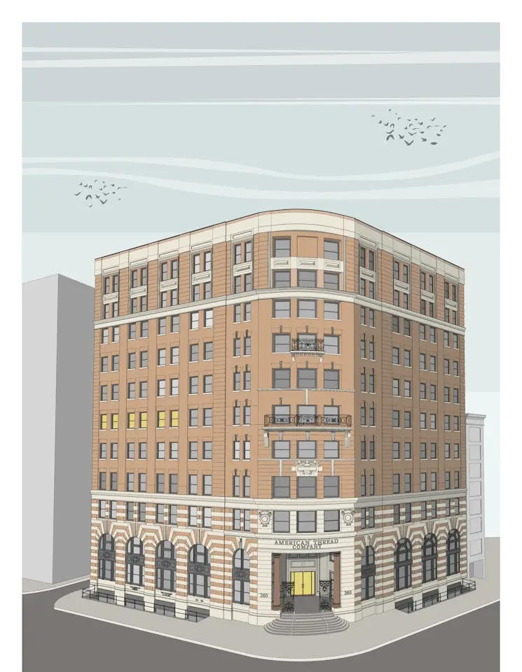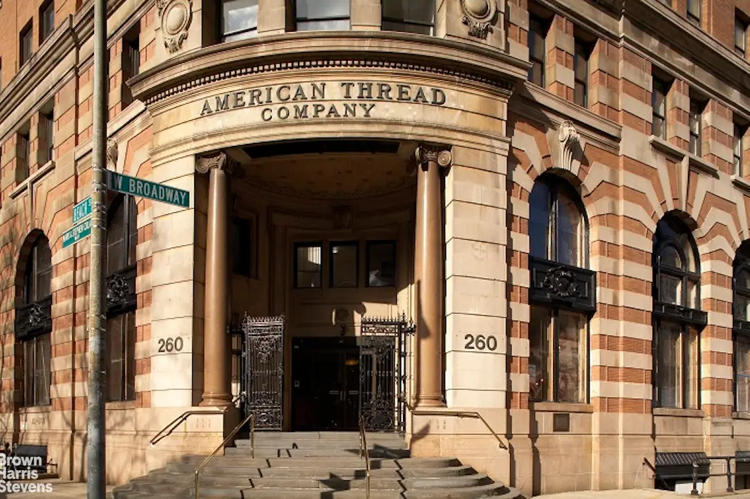 Live in light, luxury and landmarked history in a beautiful, sun-filled home at the iconic American Thread Building where timeless architecture meets modern sophistication . . . in the heart of Northern Tribeca. This expansive loft offers three bedrooms and two baths, reimagined through a meticulous renovation. Thoughtfully designed and elegantly finished, it features a spacious corner layout, warm hardwood floors and twelve double-glazed windows showcasing Southern and Western views. The open concept kitchen is seamlessly integrated into the living space. Sleek granite-topped white lacquer cabinetry surrounds top-of-the-line Miele appliances. Framing views over Tribeca Park, the living area spans 40 feet, an open, airy space ideal for formal entertaining or quiet relaxation. The primary suite is private and tranquil with a custom-milled walk-in closet and dressing room. its luxurious en-suite bath features imported marble, a vintage pedestal sink, deep soaking tub with rain shower and radiant heated floors. The second bedroom is roomy and includes fitted double closets, while the versatile third bedroom (or home office), enclosed by sliding French doors, has wall-to-wall built in storage. The second bath is crisply tiled and replete with a marble pedestal sink and glass-walled walk-in shower. Additional conveniences include dual-zone central air conditioning, side-by-side washer and dryer, recessed low-voltage LED lighting and secure private storage. The American Thread Building was designed by architect R.W. Tubby in the Renaissance Revival style, and built in 1896 as the original home of the New York Wool Exchange. Residents enjoy a dramatic terrazzo-tiled lobby, 24-hour doorman, full-time superintendent, and rooftop amenities including a fully-equipped fitness center and furnished sundeck with panoramic views across Tribeca and beyond. There is a Capital Assessment of $588.