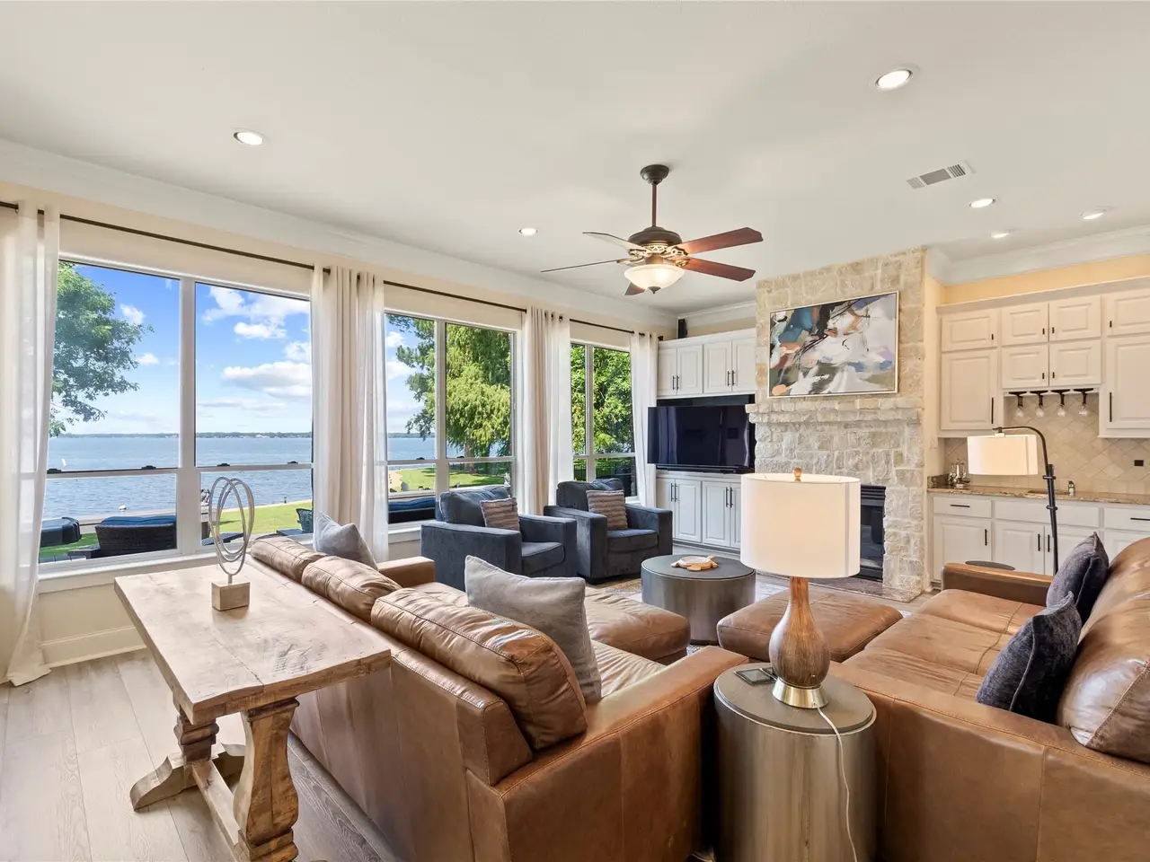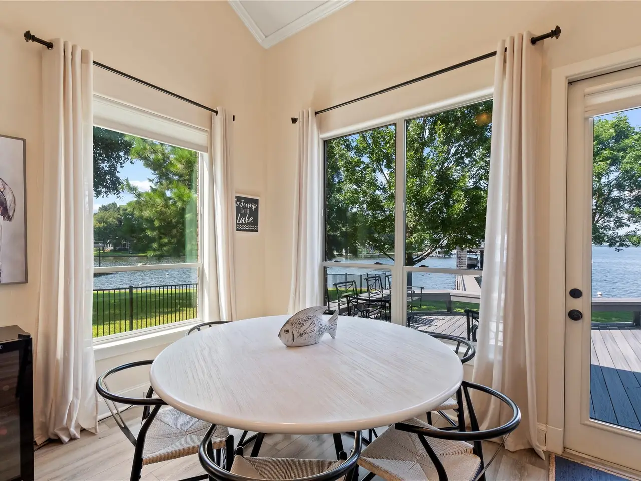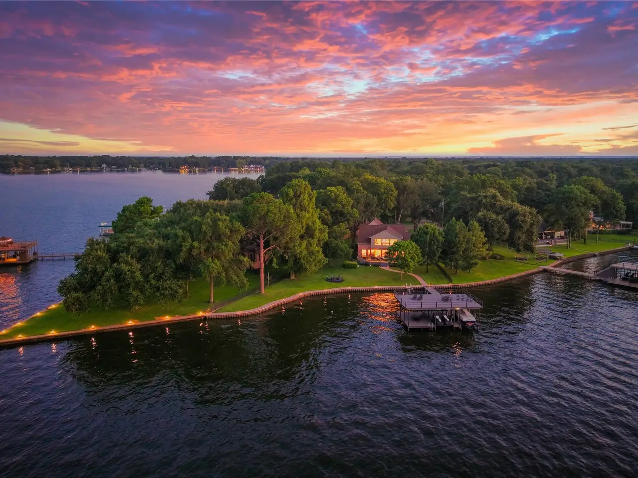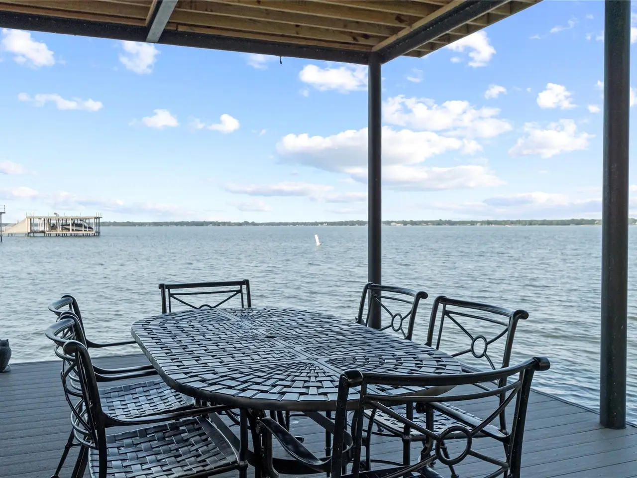 Situated on a stunning half-acre waterfront lot with an impressive 198 feet of shoreline, this expansive five bedroom, 3.5-bath home offers breathtaking open water views and deep water access in one of Cedar Creek Lakes most desirable subdivisions. Perfect as a full-time residence, vacation retreat, or short-term rental, this home is designed for hosting and entertaining. Inside, the living room boasts luxury vinyl plank flooring, a gas fireplace, a wet bar, and panoramic views of the lake. The kitchen features granite countertops, a built-in refrigerator, and an abundance of cabinet and counter space, complemented by a cozy breakfast area and formal dining room ideal for holiday gatherings. The primary suite offers lake views, a spacious ensuite with double vanities, a soaking tub, walk-in shower, and a large walk-in closet, as well as a private waterside sitting area perfect for a home office or peaceful retreat. Upstairs includes three additional bedrooms, two more bathrooms, a generously sized bunk room with a second wet bar, and a large game room with expansive picture windows showcasing unobstructed water views. Outdoor living is elevated with a wraparound deck composite deck overlooking a beautifully landscaped yard, complete with a fire pit, hot tub, and a massive composite-deck 1,337 square foot boathouse featuring a boat slip, dual jet ski platform, covered sitting area, and a party deck with miles of open water vistas. Oversized three-car garage accommodates two vehicles plus room for a golf cart and storing all those water toys. Circle drive and large driveway accommodate several vehicles. The home is sold fully furnished with limited exclusions, making it truly turnkey and ready for immediate enjoyment. Proven short-term rental history available.