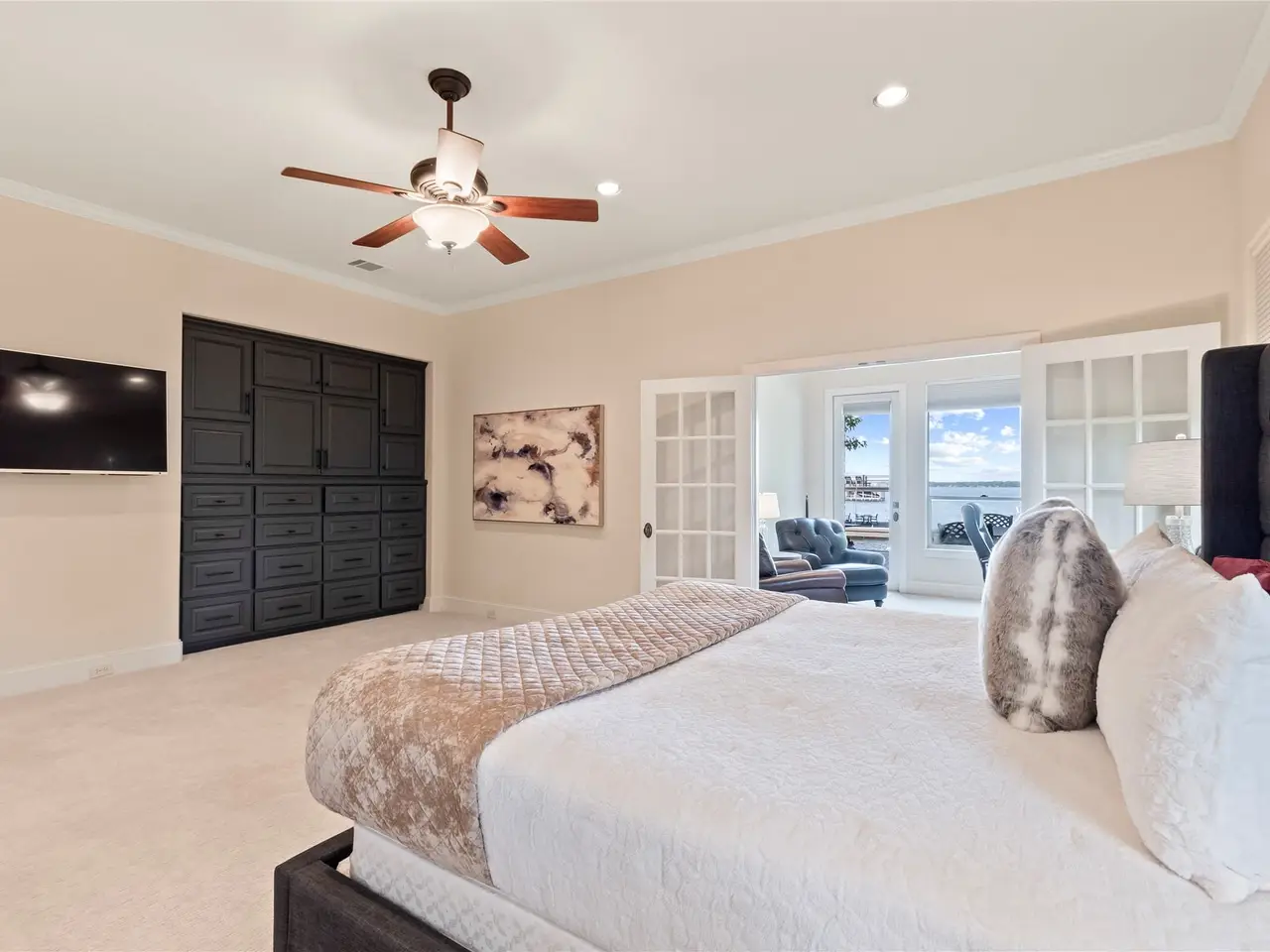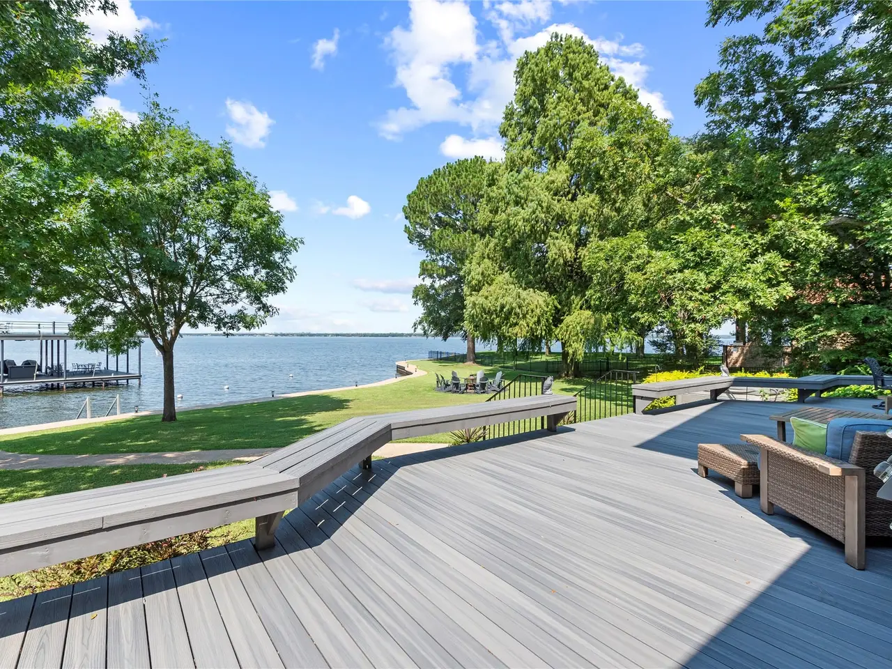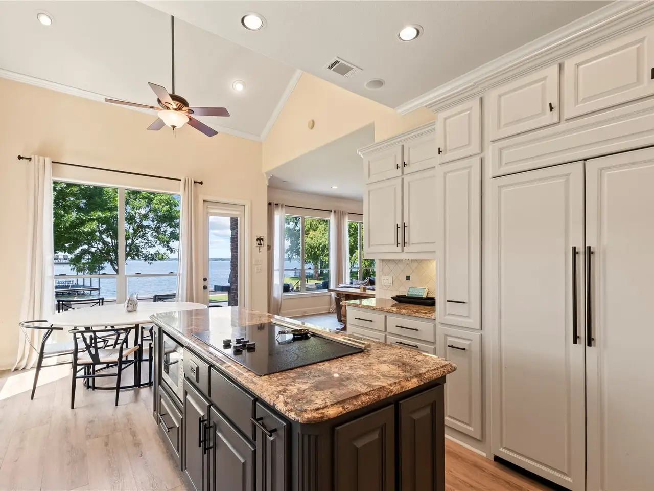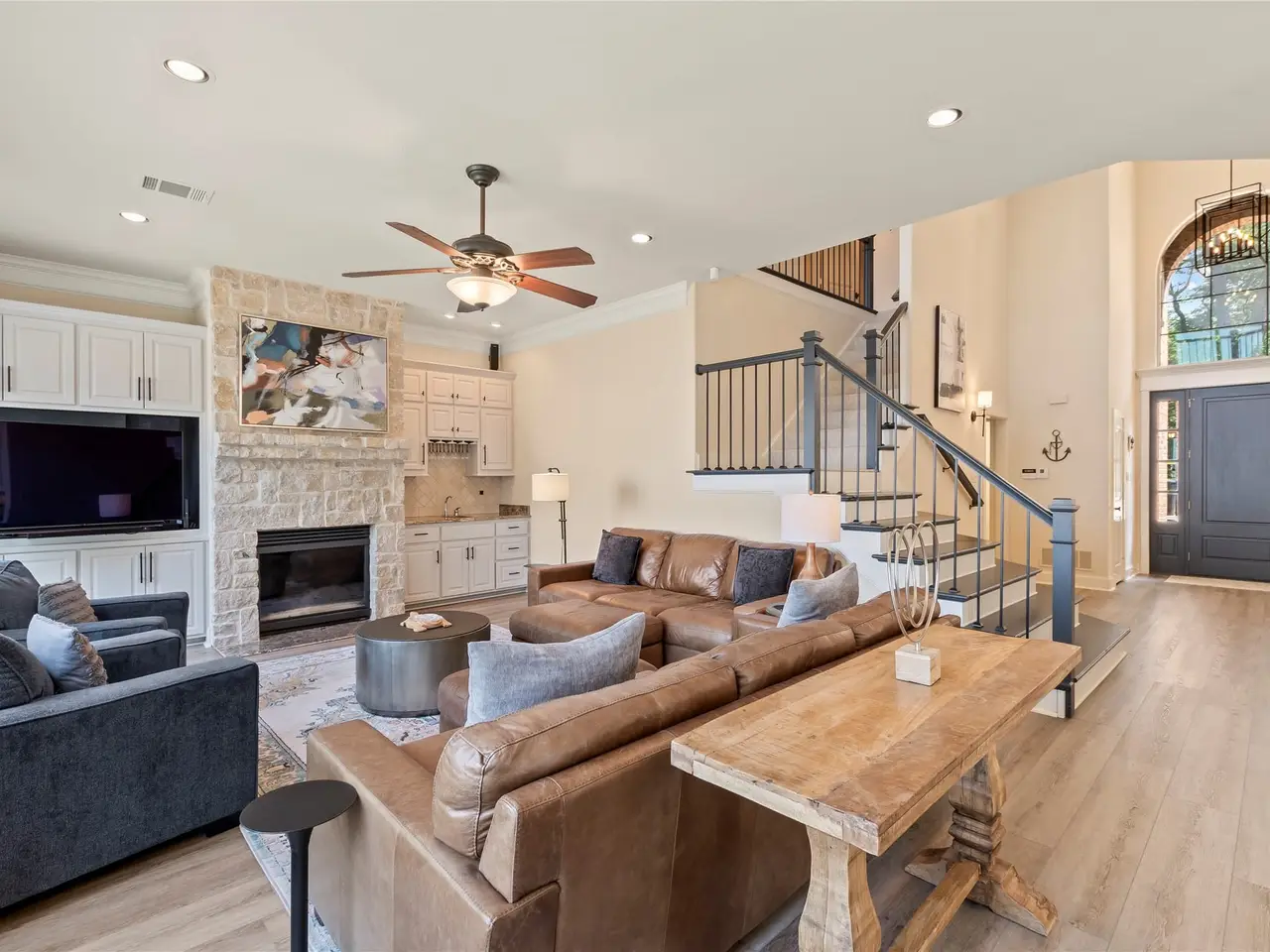 Situated on a stunning half-acre waterfront lot with an impressive 198 feet of shoreline, this expansive five bedroom, 3.5-bath home offers breathtaking open water views and deep water access in one of Cedar Creek Lakes most desirable subdivisions. Perfect as a full-time residence, vacation retreat, or short-term rental, this home is designed for hosting and entertaining. Inside, the living room boasts luxury vinyl plank flooring, a gas fireplace, a wet bar, and panoramic views of the lake. The kitchen features granite countertops, a built-in refrigerator, and an abundance of cabinet and counter space, complemented by a cozy breakfast area and formal dining room ideal for holiday gatherings. The primary suite offers lake views, a spacious ensuite with double vanities, a soaking tub, walk-in shower, and a large walk-in closet, as well as a private waterside sitting area perfect for a home office or peaceful retreat. Upstairs includes three additional bedrooms, two more bathrooms, a generously sized bunk room with a second wet bar, and a large game room with expansive picture windows showcasing unobstructed water views. Outdoor living is elevated with a wraparound deck composite deck overlooking a beautifully landscaped yard, complete with a fire pit, hot tub, and a massive composite-deck 1,337 square foot boathouse featuring a boat slip, dual jet ski platform, covered sitting area, and a party deck with miles of open water vistas. Oversized three-car garage accommodates two vehicles plus room for a golf cart and storing all those water toys. Circle drive and large driveway accommodate several vehicles. The home is sold fully furnished with limited exclusions, making it truly turnkey and ready for immediate enjoyment. Proven short-term rental history available.