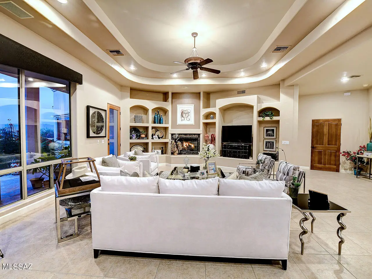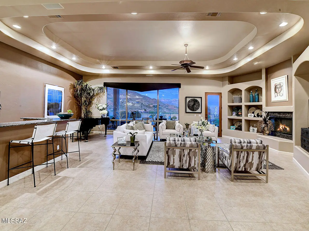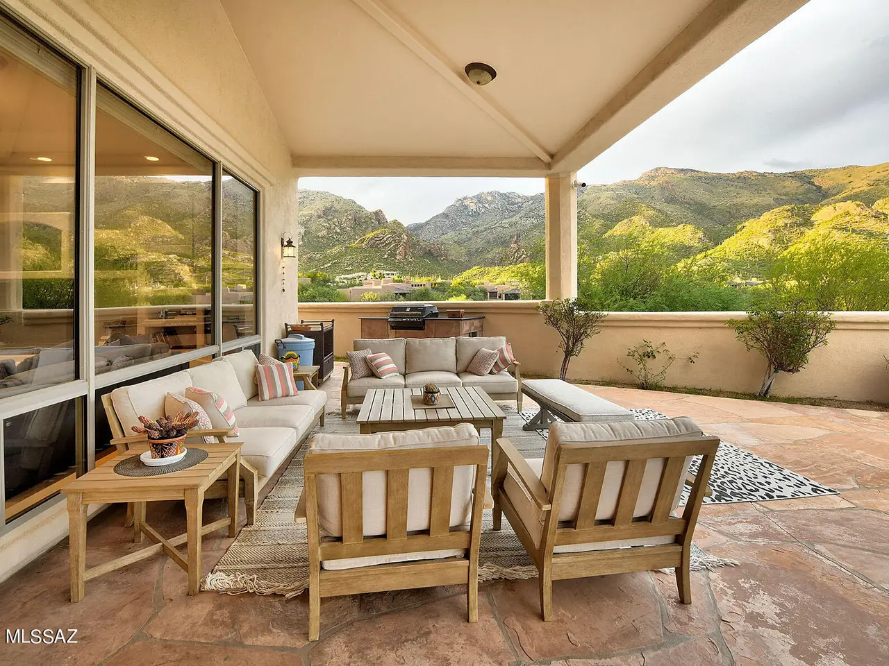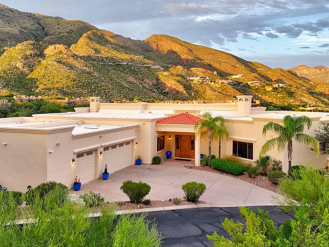 Stunning Mediterranean/contemporary in prestigious, gated Miramist at Ventana in the Catalina Foothills high above Tucson. Located on a cul-de-sac on a 1.45 acre hilltop lot, this 5,735 sq. ft., 5-bedroom, 5 1/2-bath home offers breathtaking views . . . picture windows focus on the center of Ventana Canyon itself, with views from the Catalina to the Rincon Mountains, of Sabino Canyon and city light views of Tucson. With no interior steps, enter into living room with soaring ceilings, walls of windows, formal dining room, fireplace and wet bar, leading into expansive family room/gourmet kitchen with fireplace, kitchen island granite counters and stainless steel appliances. Gracious primary suite is 17'7'' x 31'11'' with fireplace, dual vanities, generous primary closet and spa tub.