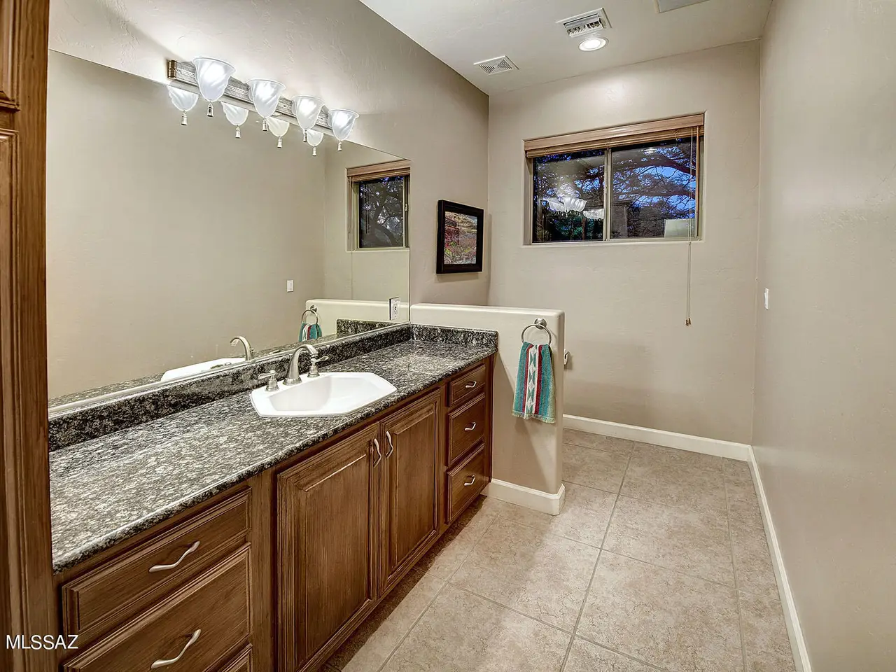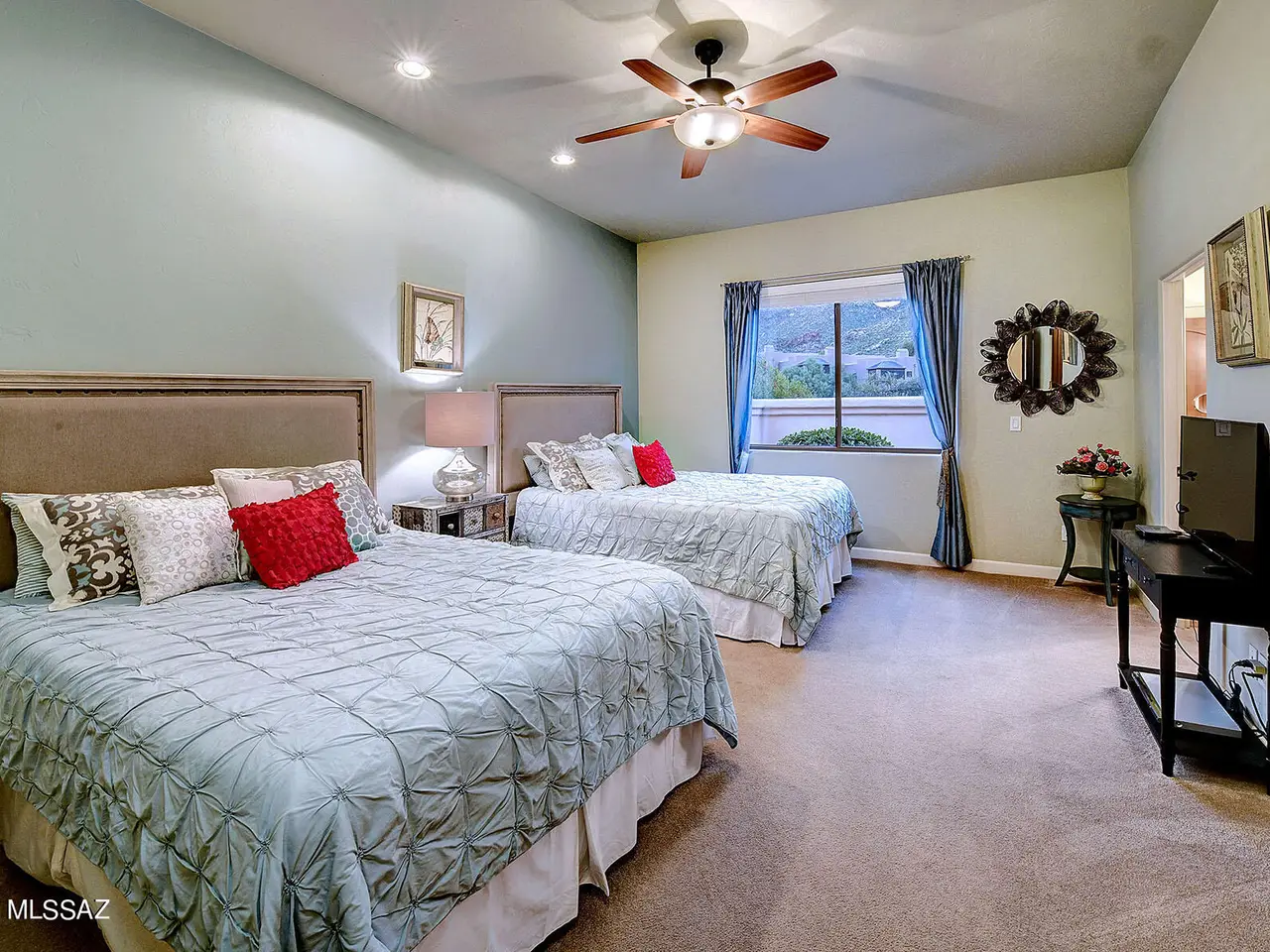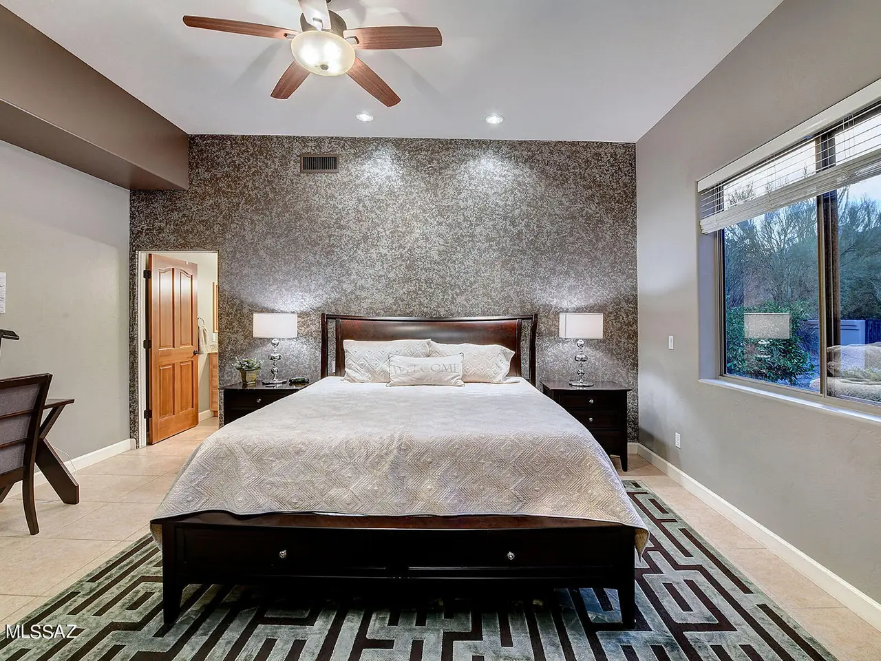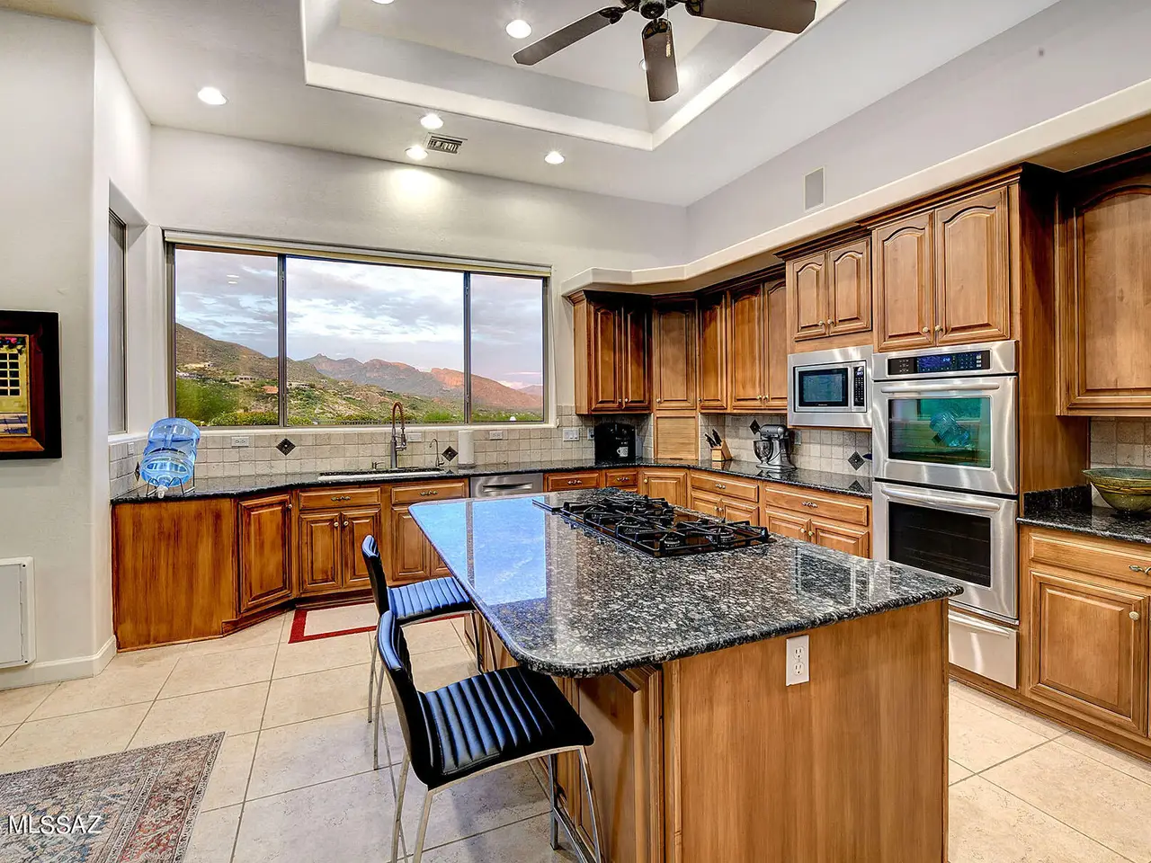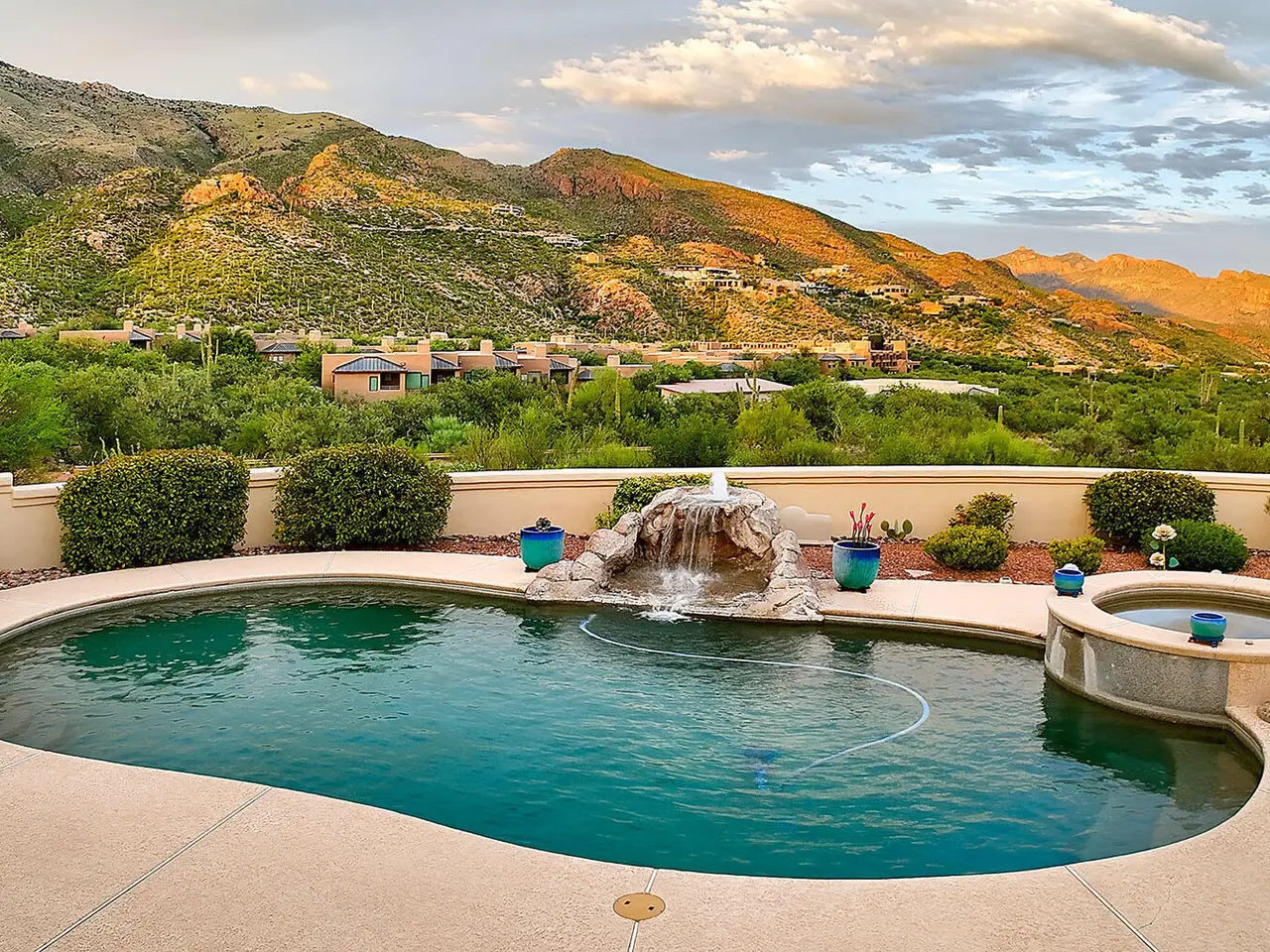 Stunning Mediterranean/contemporary in prestigious, gated Miramist at Ventana in the Catalina Foothills high above Tucson. Located on a cul-de-sac on a 1.45 acre hilltop lot, this 5,735 sq. ft., 5-bedroom, 5 1/2-bath home offers breathtaking views . . . picture windows focus on the center of Ventana Canyon itself, with views from the Catalina to the Rincon Mountains, of Sabino Canyon and city light views of Tucson. With no interior steps, enter into living room with soaring ceilings, walls of windows, formal dining room, fireplace and wet bar, leading into expansive family room/gourmet kitchen with fireplace, kitchen island granite counters and stainless steel appliances. Gracious primary suite is 17'7'' x 31'11'' with fireplace, dual vanities, generous primary closet and spa tub.