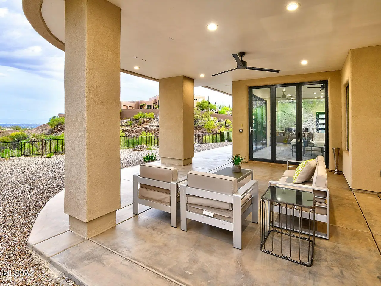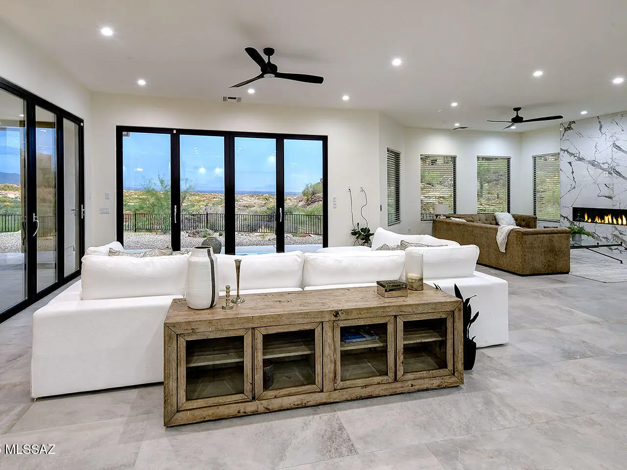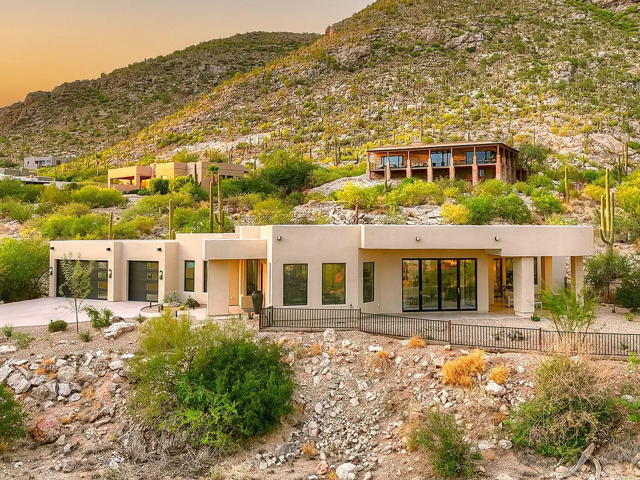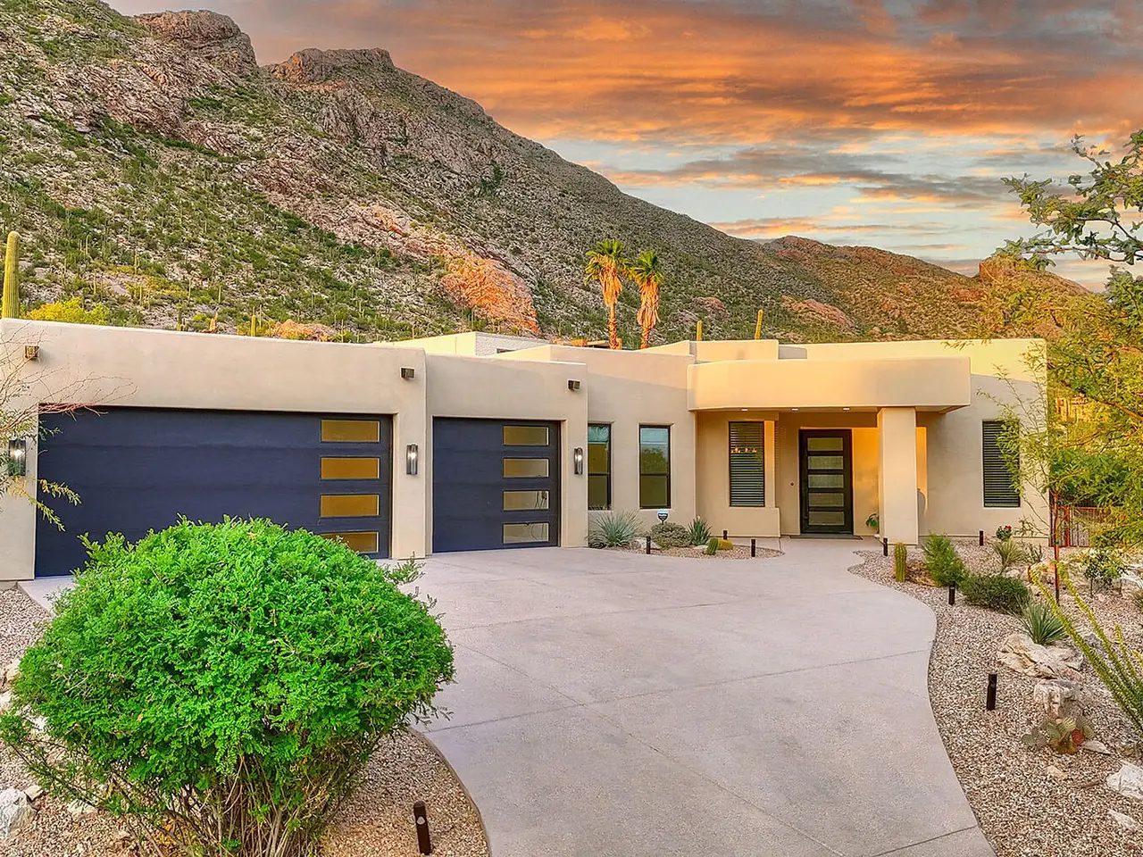 Stunning, like-new 2023 contemporary perched on La Paloma Drive, the highest street in the coveted Coronado Foothills Estates of Tucson's Catalina Foothills. Set on a glorious one-acre lot embraced by the Catalina Mountains and Coronado National Forest, this 3, 605 sq. ft. residence offers 4 bedrooms, 4.5 baths, and a 3-car garage--designed to showcase sweeping city lights, mountain vistas, and dramatic sunrise and sunset views from every room. Built by renowned master builder Paul Rondelli, the home welcomes you into a striking great room with soaring ceilings, walls of glass, porcelain tile flooring, a sleek fireplace, and an open dining area--perfect for entertaining. The chef's kitchen is both functional and modern, featuring stainless steel appliances, a spacious center island with a breakfast bar, abundant counter space, and a walk-in pantry. The luxurious primary suite is a private retreat with a fireplace, direct access to the covered patio, and a spa-inspired bathroom boasting quartz finishes, a walk-in glass shower, a soaking tub, and a generous walk-in closet with custom built-ins. Each bedroom has an en-suite bath and a walk-in closet. Additional highlights include a large laundry room with a sink, and a light-filled garage with windows and epoxy coated floors. Located within the Catalina Foothills School District #16, this home offers the perfect blend of contemporary style, move-in-ready convenience, and unrivaled views, all just minutes from shopping, dining, and city amenities, yet peacefully above the bustle of daily life.