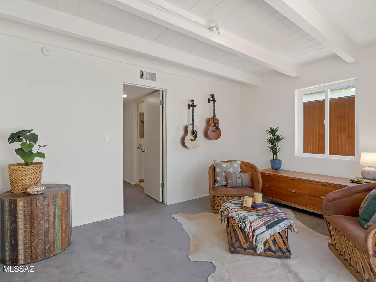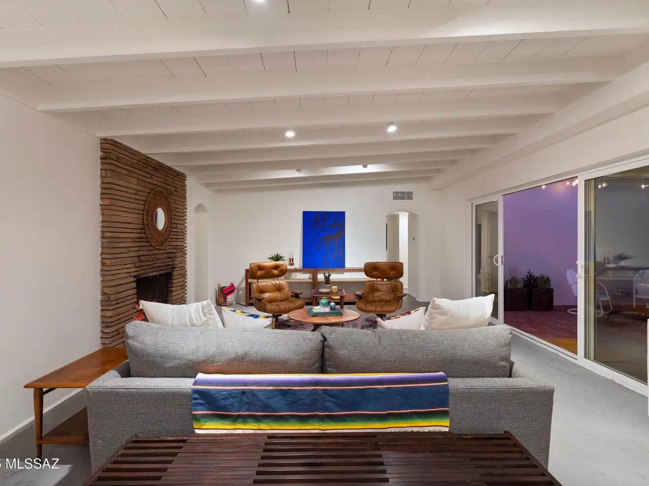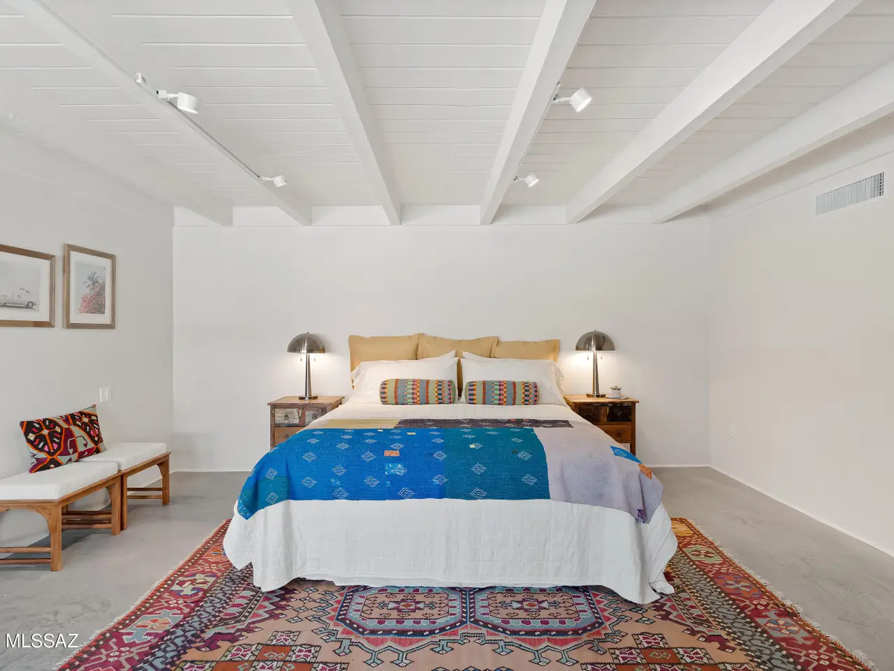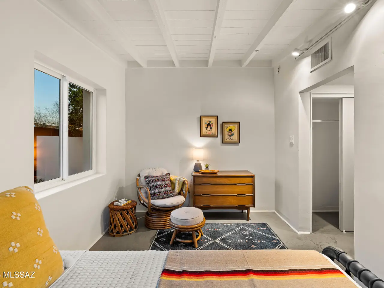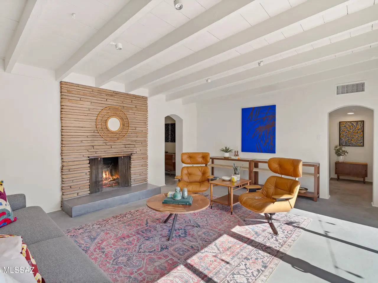 This stunningly reimagined home in coveted Catalina Vista exhibits a beautiful balance of its historic architectural roots and the modern amenities. Each space is infused with era-sensitive materials and functional upgrades. With great care the current owners have replaced systems and refurbished character-rich details. New roof, HVAC units, water heaters, lighting, landscaping, windows, insulation, concrete floors, premium smooth stucco, and both interior and exterior paint to name just a few. The main home centers around a new kitchen with high-end appliances, honed quartz counters, seating for eight, and a spacious pantry/laundry room adjacent. Wood beamed ceilings, expansive natural light through the many sliding glass doors, and period lighting exude the Mid-Century modern aesthetic classic to the 1950's era of this home. The primary suite has two walk-in closets, a private patio and spa retreat style bathroom with a dual sinks and a private commode. Three additional bedrooms and a den/office complete the main home. Across the brick patio or conveniently through the foyer the uncommonly spacious guest quarters feature one bedroom, a walk-in closet and kitchenette in the living room. All this just a short distance to the University of Arizona, Banner Hospital, Tahoe Park, and the Arizona Inn.