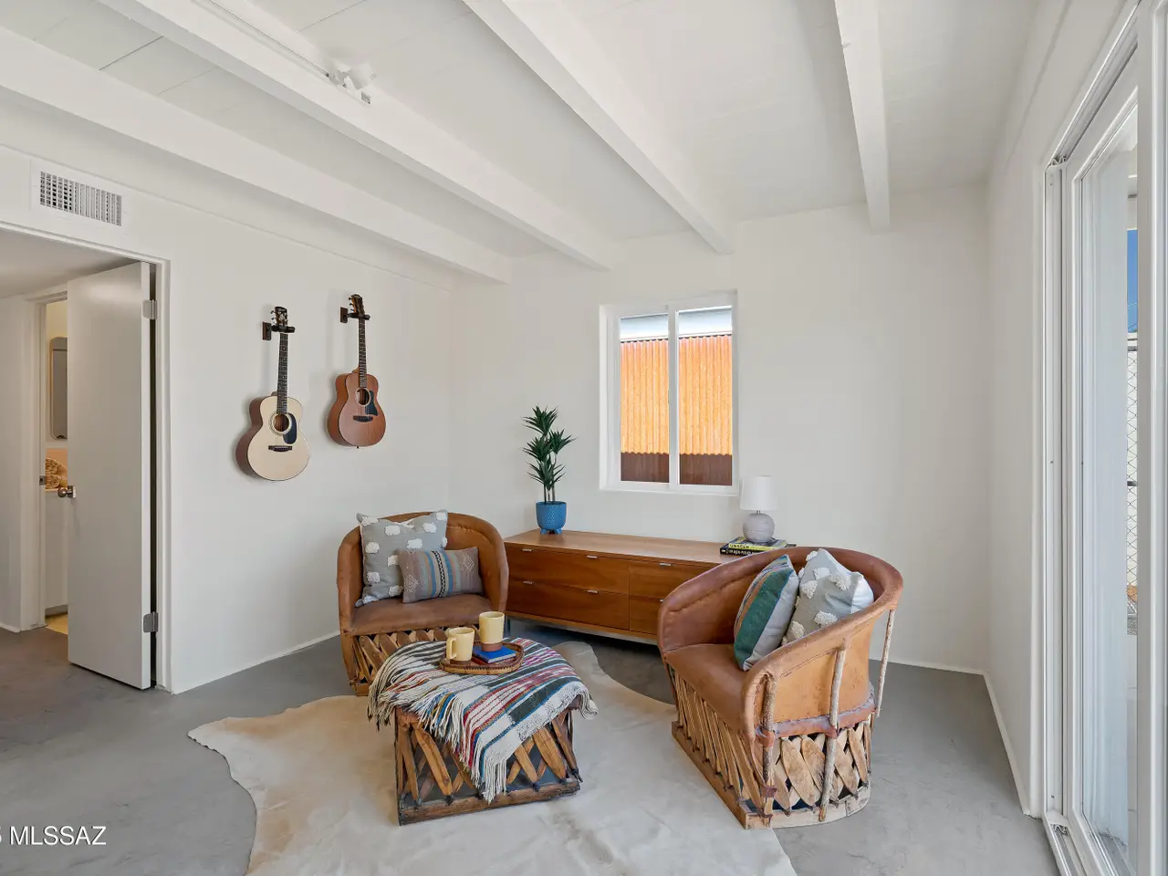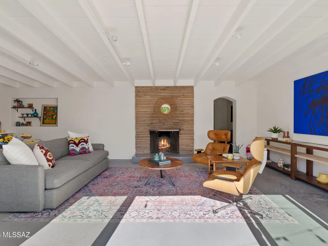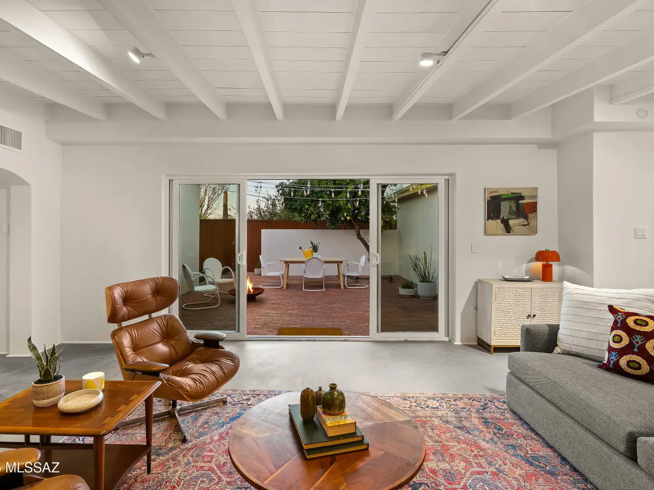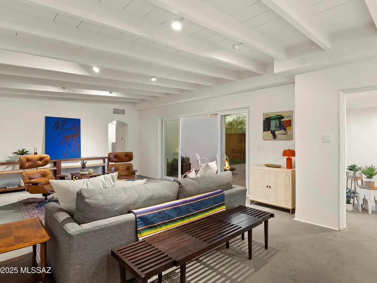 This stunningly reimagined home in coveted Catalina Vista exhibits a beautiful balance of its historic architectural roots and the modern amenities. Each space is infused with era-sensitive materials and functional upgrades. With great care the current owners have replaced systems and refurbished character-rich details. New roof, HVAC units, water heaters, lighting, landscaping, windows, insulation, concrete floors, premium smooth stucco, and both interior and exterior paint to name just a few. The main home centers around a new kitchen with high-end appliances, honed quartz counters, seating for eight, and a spacious pantry/laundry room adjacent. Wood beamed ceilings, expansive natural light through the many sliding glass doors, and period lighting exude the Mid-Century modern aesthetic classic to the 1950's era of this home. The primary suite has two walk-in closets, a private patio and spa retreat style bathroom with a dual sinks and a private commode. Three additional bedrooms and a den/office complete the main home. Across the brick patio or conveniently through the foyer the uncommonly spacious guest quarters feature one bedroom, a walk-in closet and kitchenette in the living room. All this just a short distance to the University of Arizona, Banner Hospital, Tahoe Park, and the Arizona Inn.