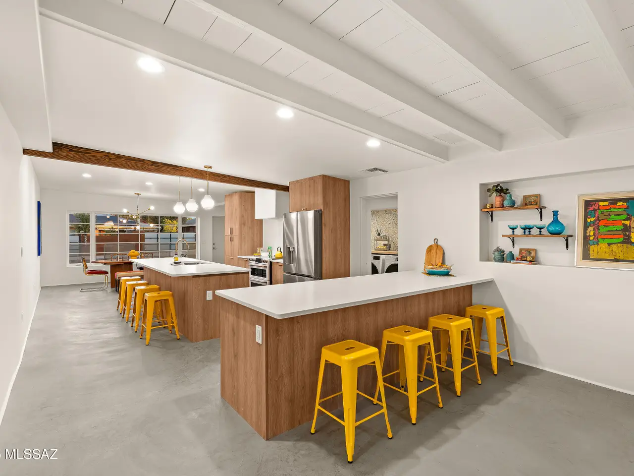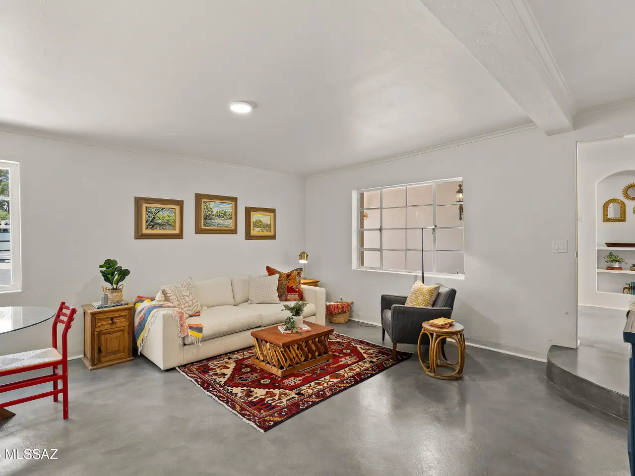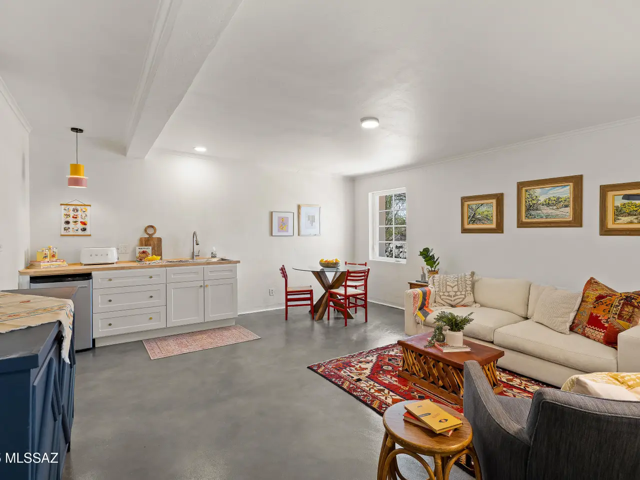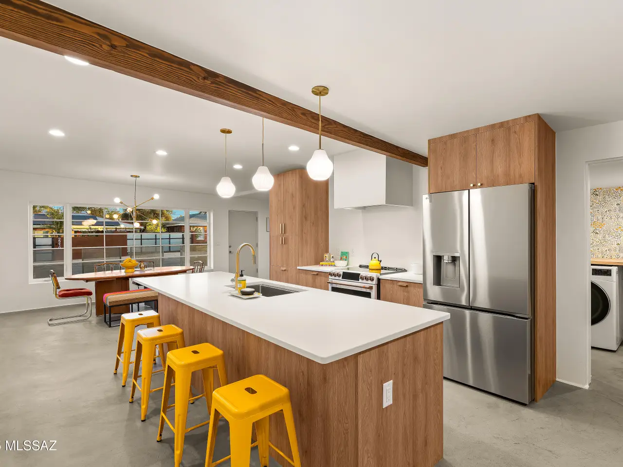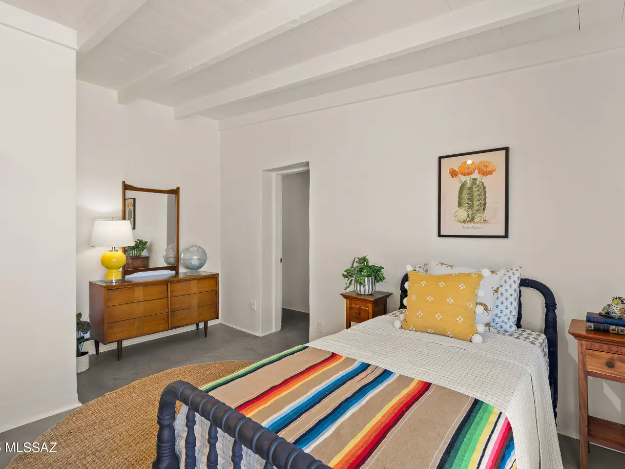 This stunningly reimagined home in coveted Catalina Vista exhibits a beautiful balance of its historic architectural roots and the modern amenities. Each space is infused with era-sensitive materials and functional upgrades. With great care the current owners have replaced systems and refurbished character-rich details. New roof, HVAC units, water heaters, lighting, landscaping, windows, insulation, concrete floors, premium smooth stucco, and both interior and exterior paint to name just a few. The main home centers around a new kitchen with high-end appliances, honed quartz counters, seating for eight, and a spacious pantry/laundry room adjacent. Wood beamed ceilings, expansive natural light through the many sliding glass doors, and period lighting exude the Mid-Century modern aesthetic classic to the 1950's era of this home. The primary suite has two walk-in closets, a private patio and spa retreat style bathroom with a dual sinks and a private commode. Three additional bedrooms and a den/office complete the main home. Across the brick patio or conveniently through the foyer the uncommonly spacious guest quarters feature one bedroom, a walk-in closet and kitchenette in the living room. All this just a short distance to the University of Arizona, Banner Hospital, Tahoe Park, and the Arizona Inn.