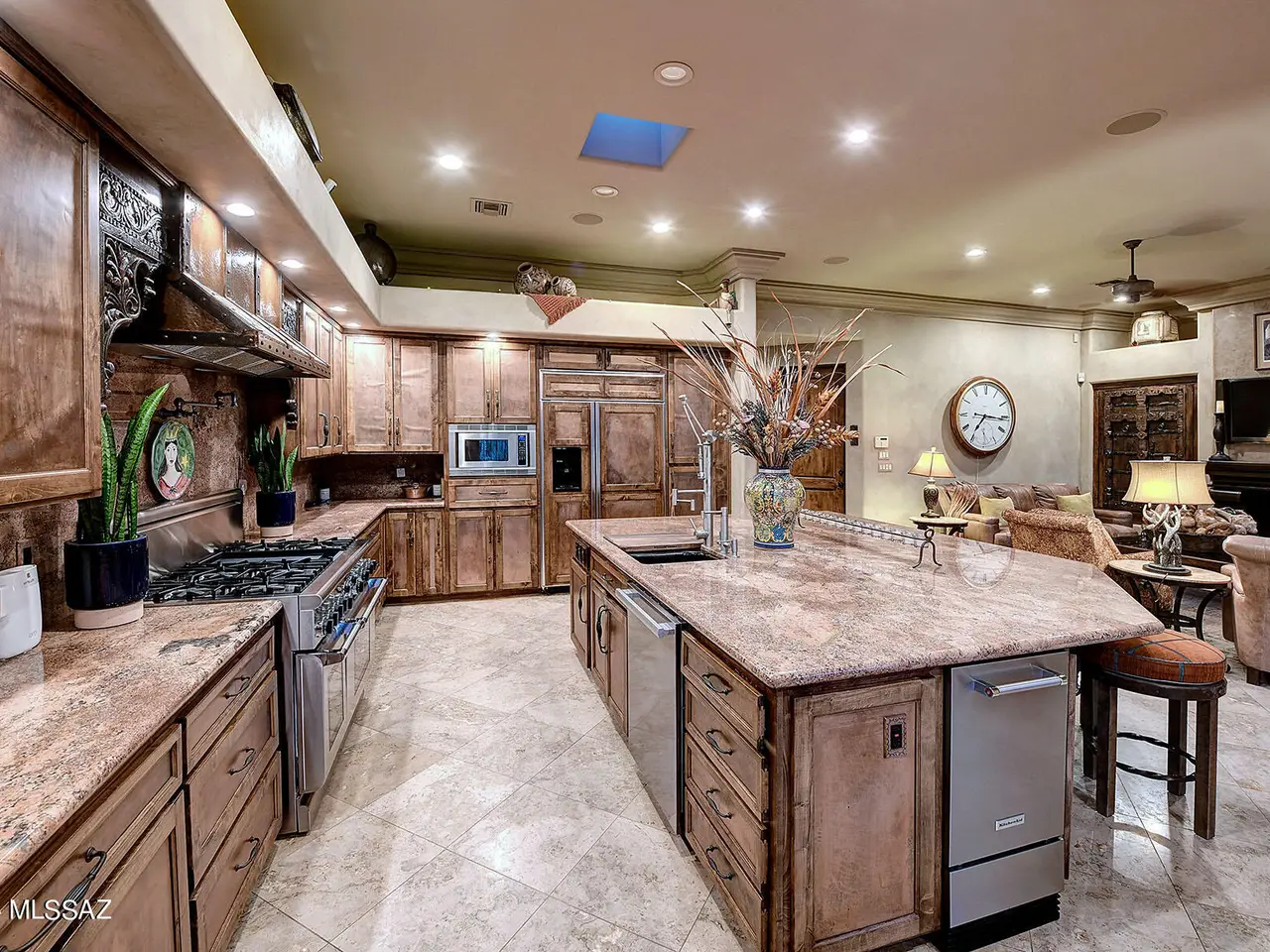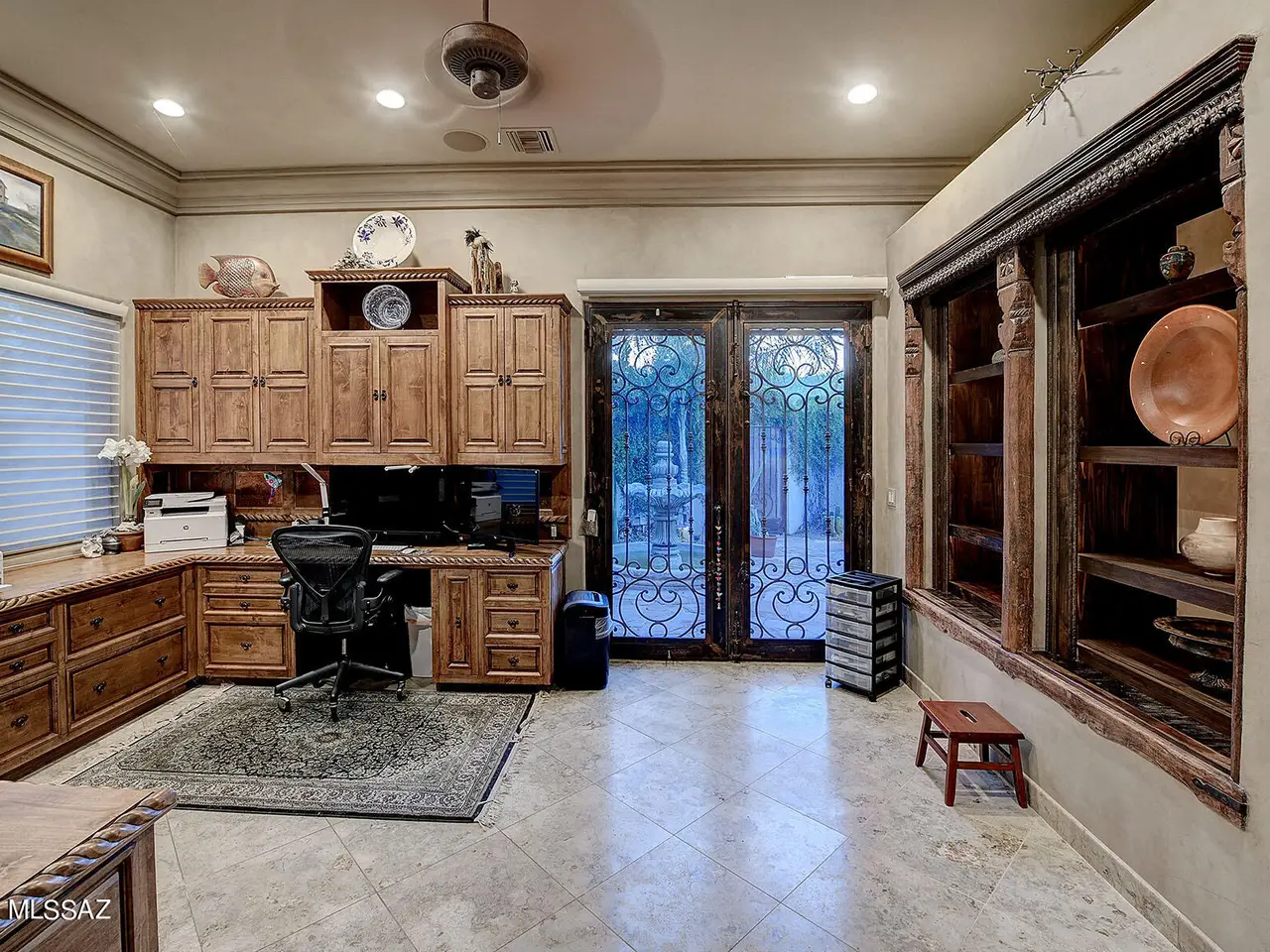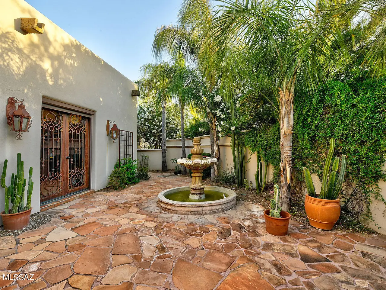 This stunning Spanish Colonial masterpiece by Doug Nelson of Nelson Builders is nestled in prestigious, guard-gated Hacienda Del Sol Estates in the Catalina Foothills. Located on a 1.3-acre interior lot away from traffic noise, this four bedroom plus office and media room (that could be a 5th bedroom) home features quality construction and ''Old World'' charm throughout. Highlights include hand-built, one-of-a kind, exterior wrought iron and interior antique doors & pillars. Additional features include custom cabinetry handmade in Mexico, faux painting, crown molding, custom fireplace mantel, historic finishes not seen in today's contemporary style homes, Fortuny and Scudo Saraceno Glass Pendant light fixtures, custom lighted bookshelves, formal dining room with custom tile ceiling, and more