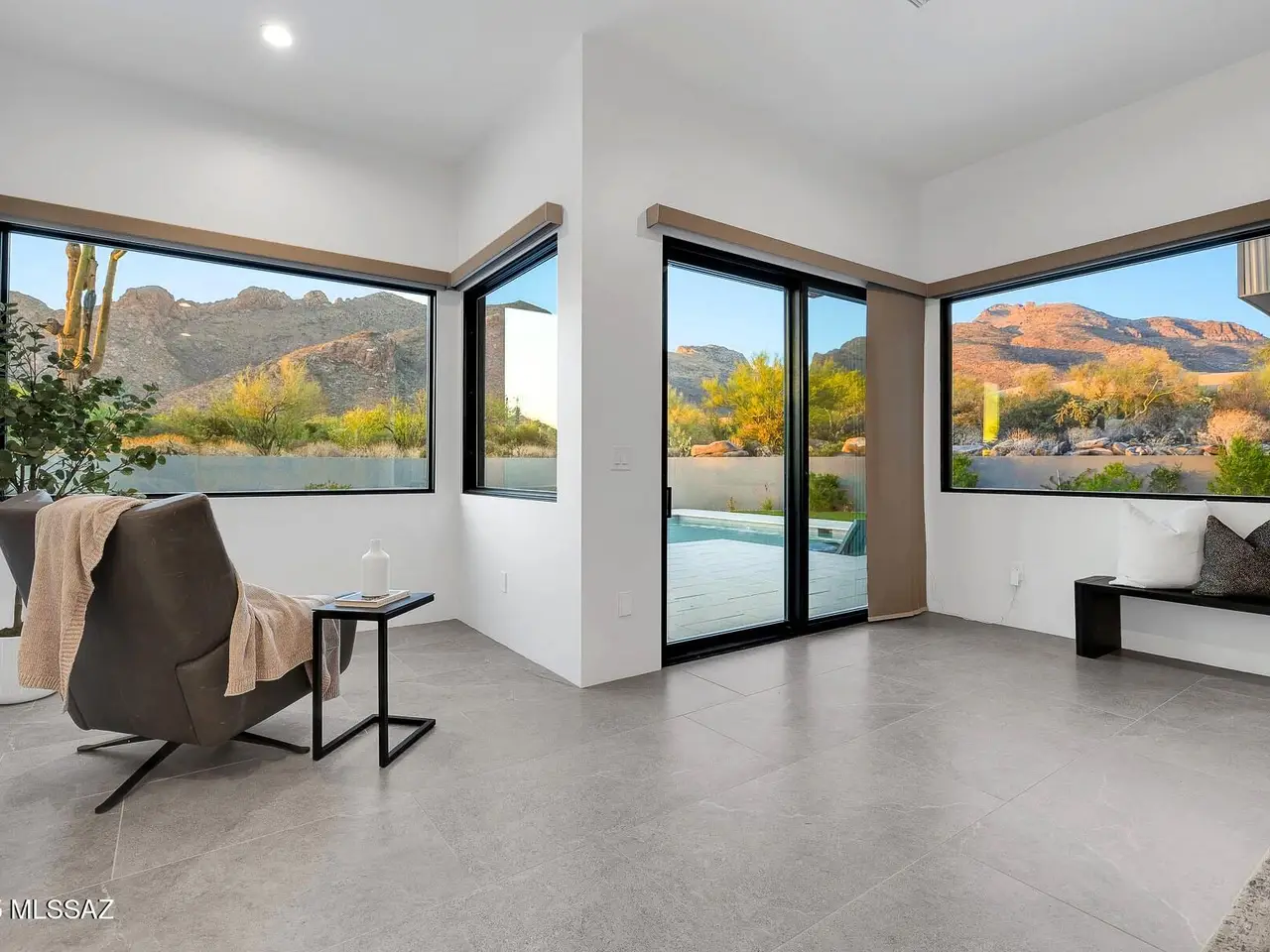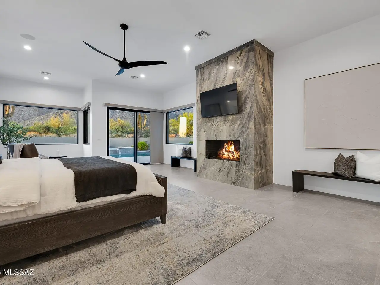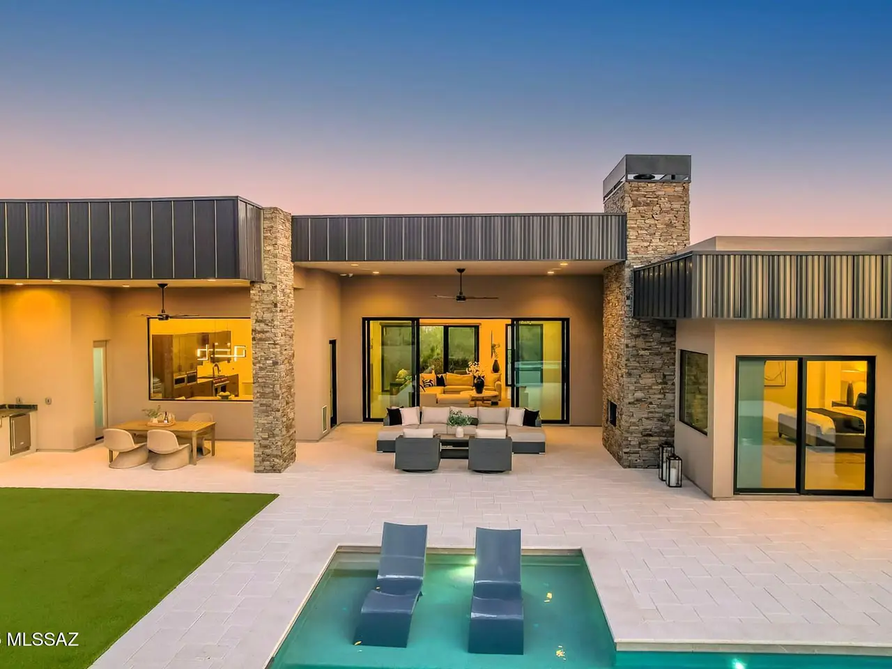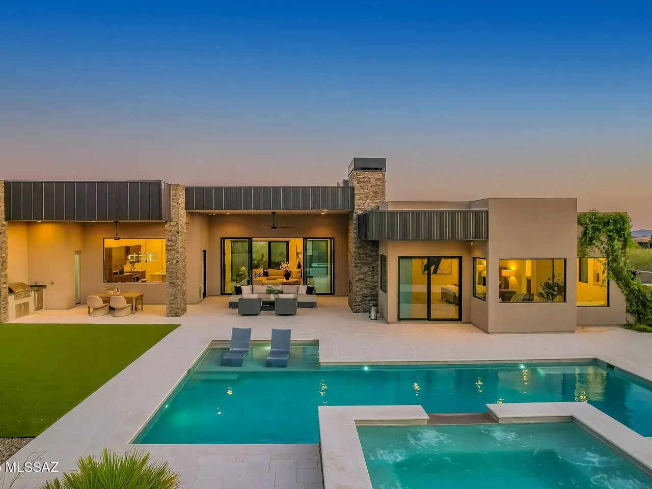 Welcome to the epitome of luxury living in the prestigious, double-gated Sunset Gardens enclave of Pima Canyon Estates. Designed by the renowned Simmons Design Group and completed in 2023, this striking modern residence offers 5189 square feet of masterfully crafted space with breathtaking north-facing views into majestic Pima Canyon. Step inside to find an open-concept layout with high-end finishes, soaring ceilings and brilliant window design providing elegant natural lighting. Four spacious, en-suite bedrooms plus a built-in office and fully equipped home gym, perfect for today's modern lifestyle. Outdoors, enjoy the generously sized Pebble Sheen pool and spa, massive north-facing rear patio and glorious desert sunsets. Auto enthusiasts will appreciate the oversized four-car garage.