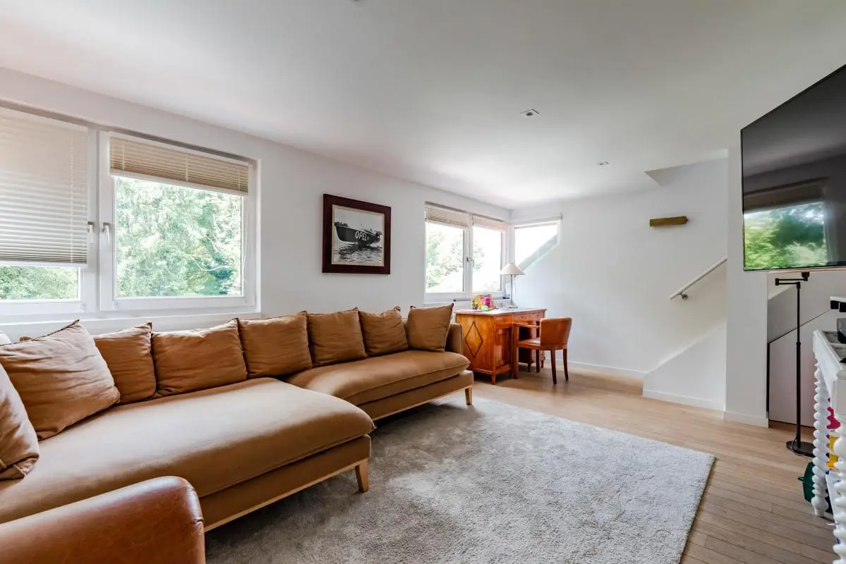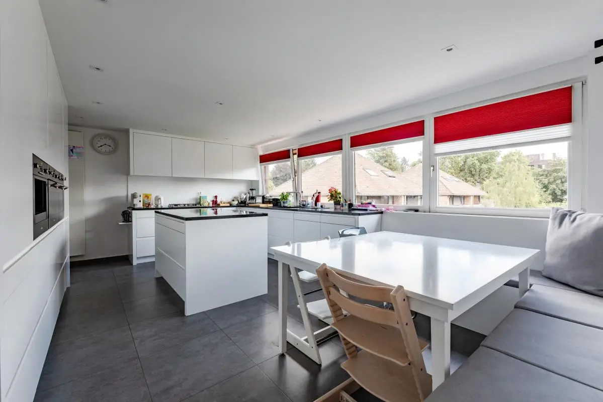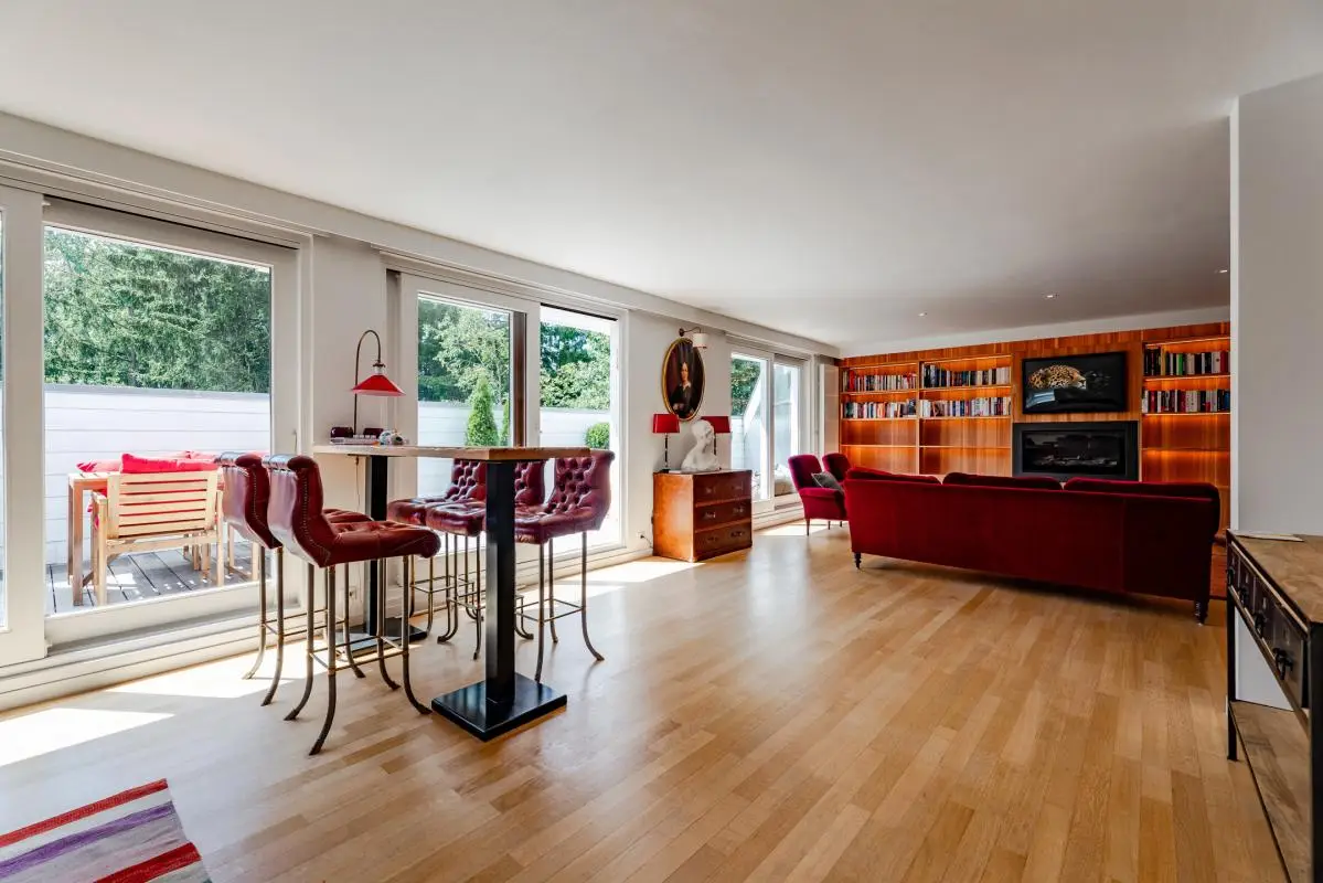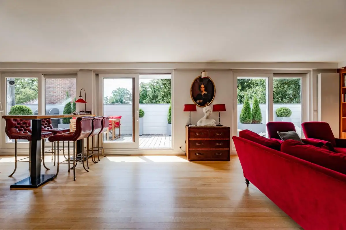 In a small, very quiet enclosed area, close to all Fort Jaco amenities, very attractive penthouse flat (+/- 295 m²) + beautiful terraces (30 and 10 m²) in a small co-ownership built in 1988 on the 2nd and 3rd floors. Private garden next to the building (125 m²). Beautiful, bright reception rooms, study, fully-equipped kitchen, 3 bedrooms, 3 bathrooms. 2 cellars and garage. PEB D