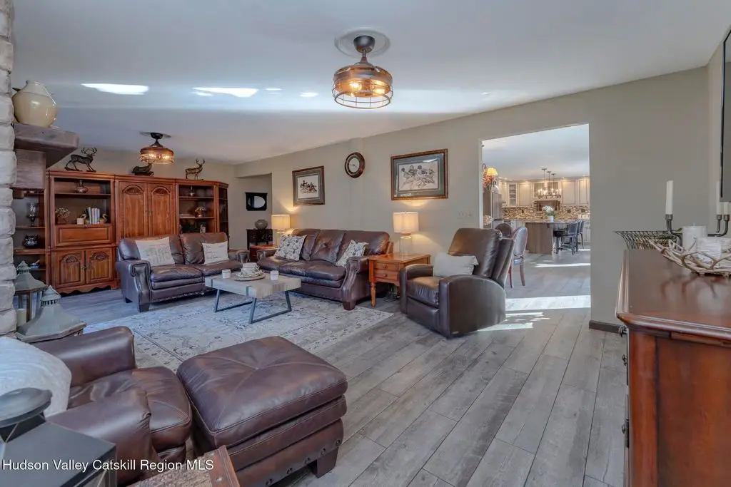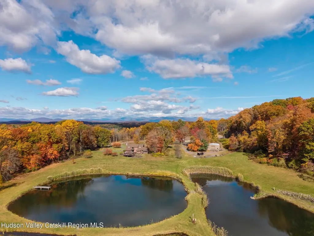 Escape to your own private retreat nestled in the woods! This 3-bedroom, 1.5 bath home offers the perfect blend of comfort and country charm. The spacious kitchen is designed for entertaining, with ample counter space and room for gathering both indoors as well as flowing out onto the two tiered deck overlooking the ponds and a waterfall that can be turned on simply by a switch in the home. Work from home or host extended family or friends with an additional flex room on the first floor. Unwind by the cozy fireplace in the living room on crisp winter evenings, or step outside and experience the serenity of the forest, open meadows, and water views. Upstairs, you will find 3 spacious bedrooms and an open sitting area complete with gorgeous views. Enjoy 18.3 secluded acres featuring 4 stocked ponds, ideal for fishing, reflection, and quiet afternoons outdoors. A 3-stall barn with tack room electric and water provides space for horses, hobbies, or storage, while the large detached garage adds even more room for vehicles and equipment. Whether you're looking for a peaceful year-round residence or a secluded getaway, this hidden gem is perfect for those seeking privacy, adventure, and a connection to the outdoors. Located 80 miles from NYC and close and convenient to historic Kingston, your peaceful retreat awaits in the heart of the Hudson Valley.