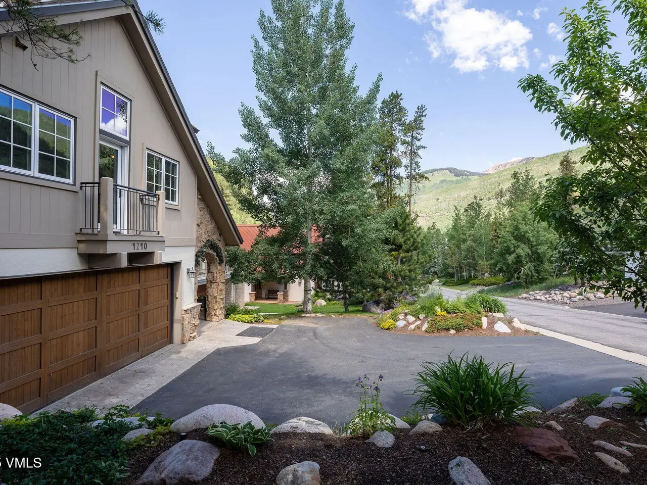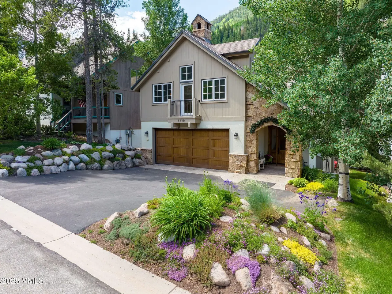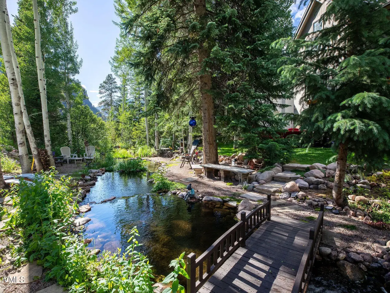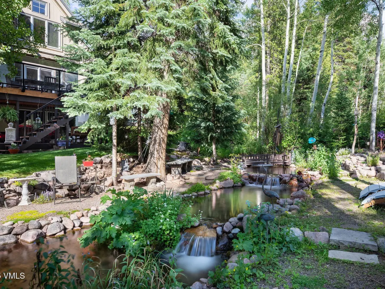 One of the most unique homesites in all of Vail, with a natural water feature running through the property. Expansive outdoor spaces feature a new deck, covered patio, fire pit area, and a beautifully landscaped and manicured backyard. Located on the quiet Spruce Way with sunny, southern exposure, enjoy proximity to the bus stop and just minutes to town for skiing and all that the village has to offer. This turnkey single-family home boasts five bedrooms, perfect for vacationing or full-time residency. Main level has an open floorplan with adjoining great room, kitchen and dining room with a nearby built-in climate-controlled wine cave and access to the upper level deck with an electric awning for sun coverage if necessary. The expansive master suite features vaulted ceilings, a deck, a large walk-in closet with laundry facilities, a double-sided fireplace, and an oversized bathroom with a jacuzzi tub and steam shower. The upper level includes three additional guest rooms. For overflow entertaining or relaxing, there is a family room on the lower level with a wet bar and access to the outdoors, a second laundry, as well as one additional bedroom with an en-suite bathroom. Recently installed water shut-off system. 2-car garage, sold furnished.