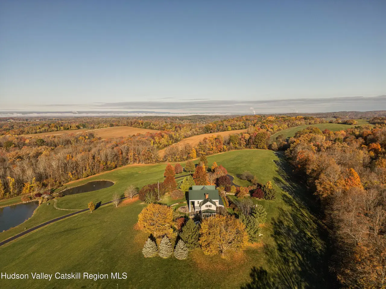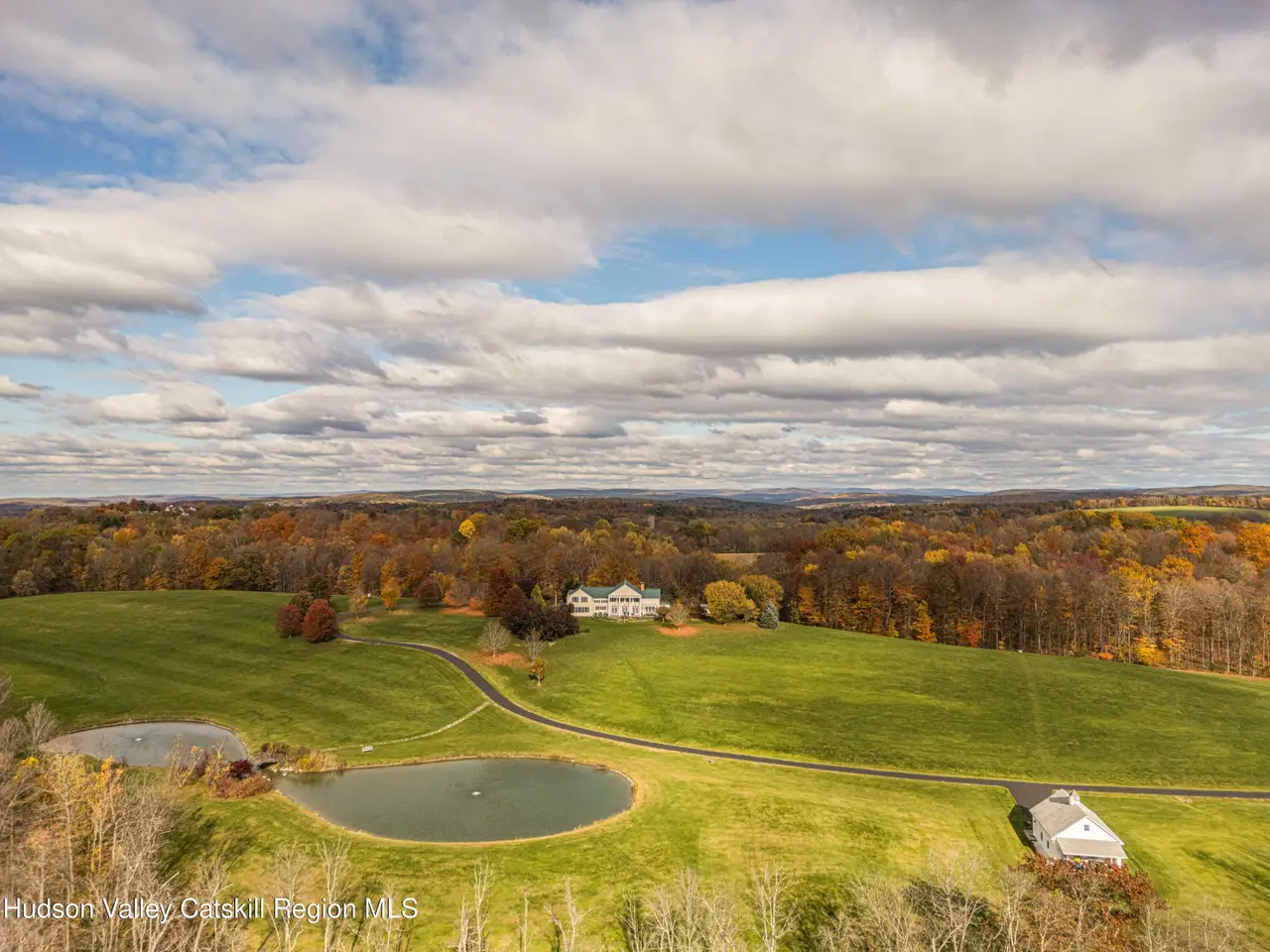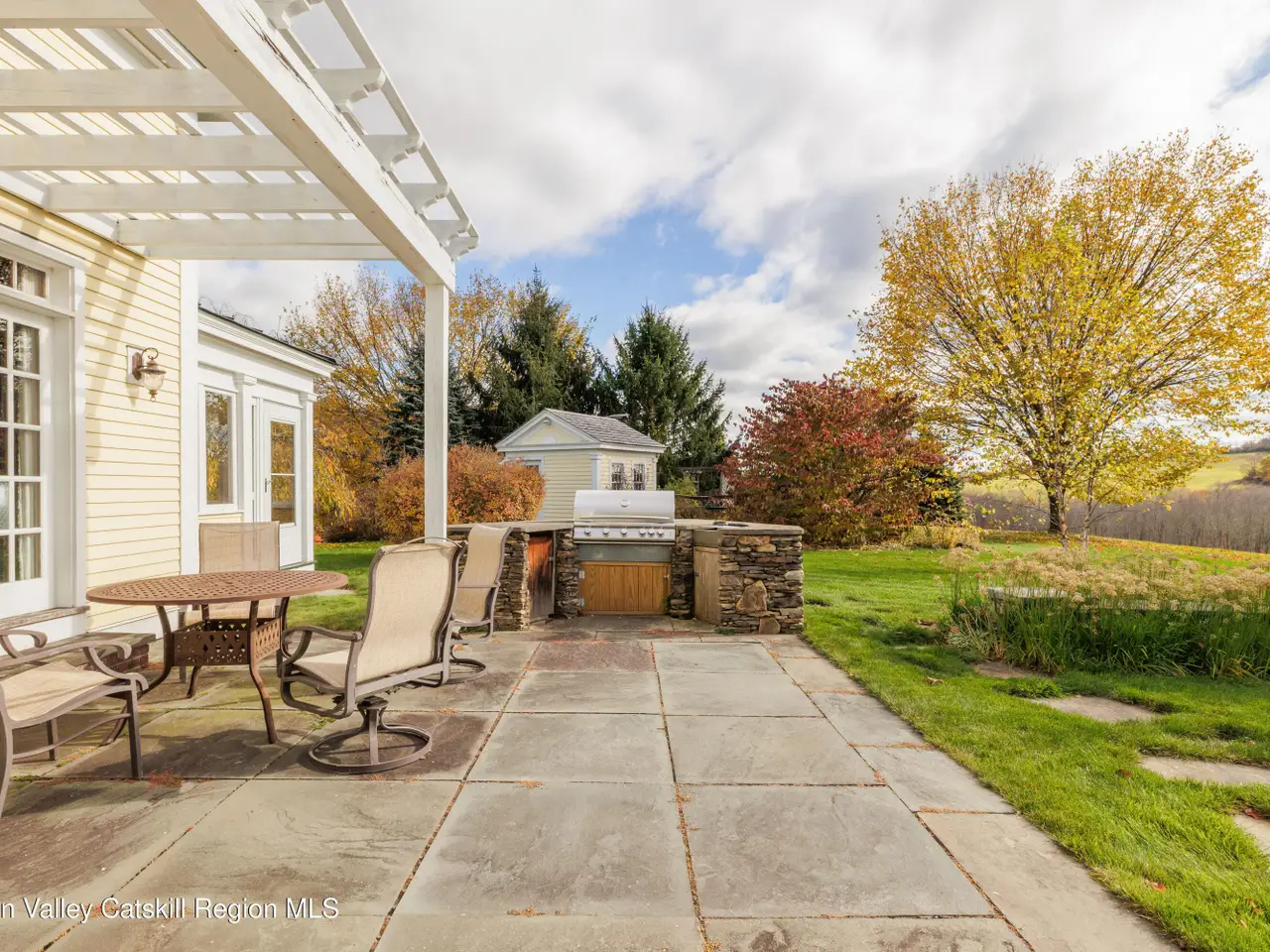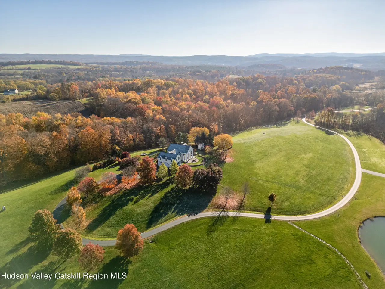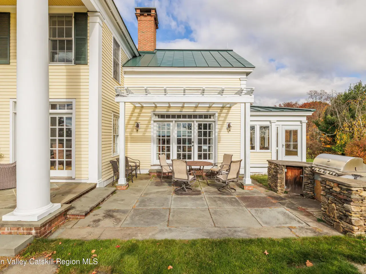 Welcome to Notre Colline Estate, a private country compound set on more than 56 acres of rolling meadows, gardens, ponds, and Catskill Mountain views. French for ''Our Hill,'' Notre Colline has an easy sense of belonging to its landscape. A long-paved drive leads to this elegantly designed 5,760 square-foot home, inspired by classic Greek Revival architecture. Built in 2005 for comfort, entertaining, and longevity, it features a standing-seam metal roof, radiant heated floors, energy-efficient heat pumps, and a fully integrated smart home system that manages lighting, temperature, security, video, and sound. The main level opens to bright, connected gathering spaces centered around a modern chef's kitchen with a large custom island, a counter depth paneled fridge, and professional-grade appliances. French doors from the dining area and breakfast nook open to a wide stone patio with an outdoor kitchen framed by landscaped gardens and open lawns, creating an easy indoor-outdoor flow. A paneled cherry wood office with built-in cabinetry and a wood-burning stove offers a quiet workspace beside a three-season sunroom, and a spacious living room with a gas fireplace invites relaxed evenings with friends and family. Upstairs, the grand primary suite feels like a private retreat, complete with a gas fireplace, two walk-in closets and a luxurious bath with a soaking tub and steam shower. Three additional bedrooms, a guest living room, two full bathrooms and a laundry room complete the second floor. The finished lower level adds generous additional living space with a recreation room, billiards area, kitchenette, sauna and full bath, ideal for guests or wellness use. An attached three-car heated garage features a porcelain tile floor and plenty of space for storage. Outdoors, a peaceful aerated pond lies at the center of the property, crossed by a charming footbridge and bordered by open lawns and walking paths. The grounds also include raised-bed gardens with irrigation, a potting shed, and a newly constructed insulated 26x34 foot outbuilding with water, electric, and space for six or more vehicles. Every detail has been considered for efficiency and ease, from spray-foam insulation and upgraded hydronic systems to improved drainage and a generator. Located minutes from Chatham village, Notre Colline Estate offers refined country living in beautiful Columbia County.