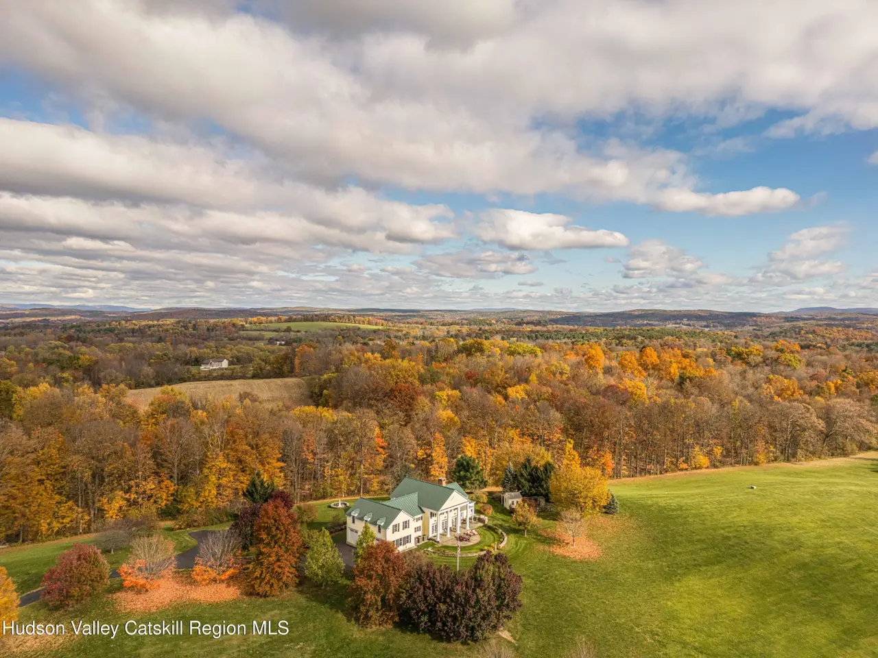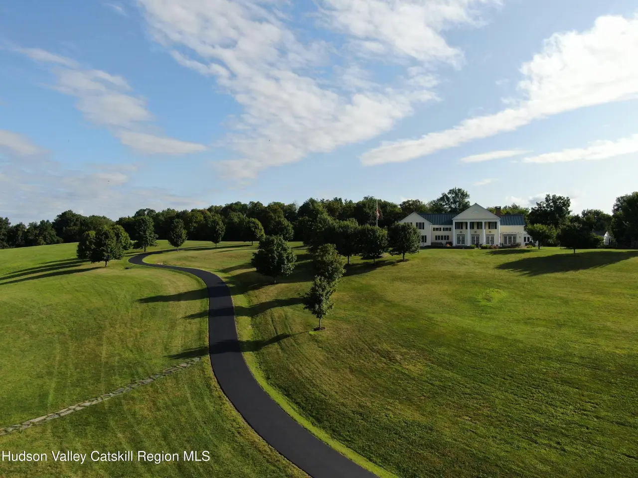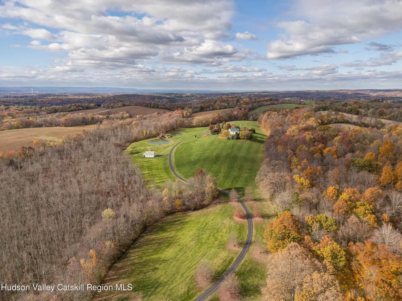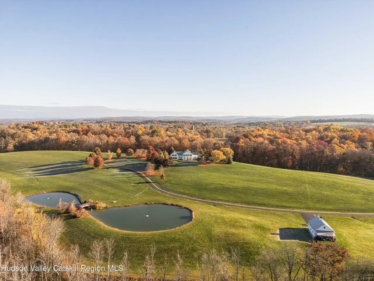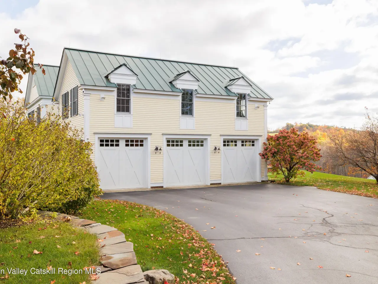 Welcome to Notre Colline Estate, a private country compound set on more than 56 acres of rolling meadows, gardens, ponds, and Catskill Mountain views. French for ''Our Hill,'' Notre Colline has an easy sense of belonging to its landscape. A long-paved drive leads to this elegantly designed 5,760 square-foot home, inspired by classic Greek Revival architecture. Built in 2005 for comfort, entertaining, and longevity, it features a standing-seam metal roof, radiant heated floors, energy-efficient heat pumps, and a fully integrated smart home system that manages lighting, temperature, security, video, and sound. The main level opens to bright, connected gathering spaces centered around a modern chef's kitchen with a large custom island, a counter depth paneled fridge, and professional-grade appliances. French doors from the dining area and breakfast nook open to a wide stone patio with an outdoor kitchen framed by landscaped gardens and open lawns, creating an easy indoor-outdoor flow. A paneled cherry wood office with built-in cabinetry and a wood-burning stove offers a quiet workspace beside a three-season sunroom, and a spacious living room with a gas fireplace invites relaxed evenings with friends and family. Upstairs, the grand primary suite feels like a private retreat, complete with a gas fireplace, two walk-in closets and a luxurious bath with a soaking tub and steam shower. Three additional bedrooms, a guest living room, two full bathrooms and a laundry room complete the second floor. The finished lower level adds generous additional living space with a recreation room, billiards area, kitchenette, sauna and full bath, ideal for guests or wellness use. An attached three-car heated garage features a porcelain tile floor and plenty of space for storage. Outdoors, a peaceful aerated pond lies at the center of the property, crossed by a charming footbridge and bordered by open lawns and walking paths. The grounds also include raised-bed gardens with irrigation, a potting shed, and a newly constructed insulated 26x34 foot outbuilding with water, electric, and space for six or more vehicles. Every detail has been considered for efficiency and ease, from spray-foam insulation and upgraded hydronic systems to improved drainage and a generator. Located minutes from Chatham village, Notre Colline Estate offers refined country living in beautiful Columbia County.