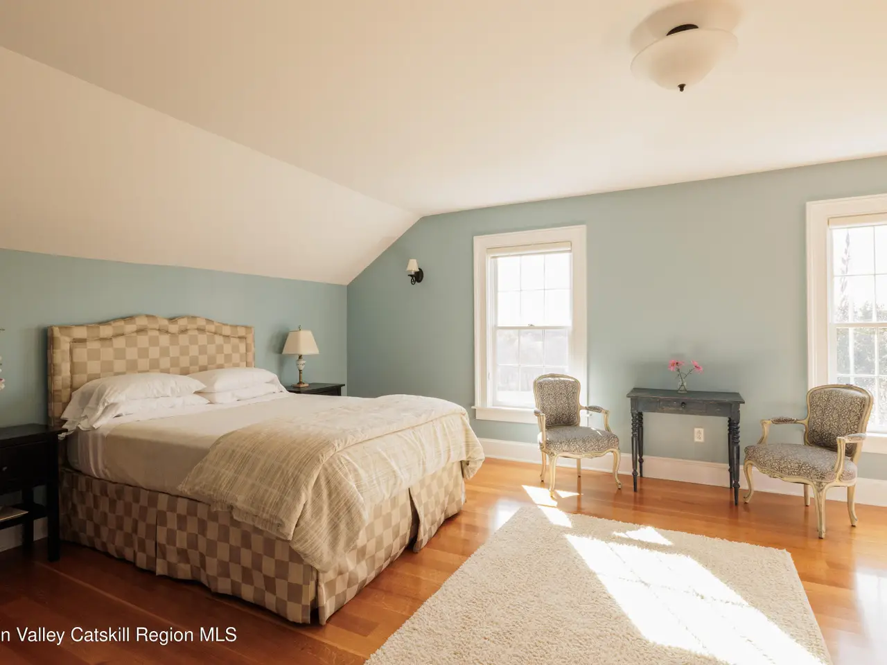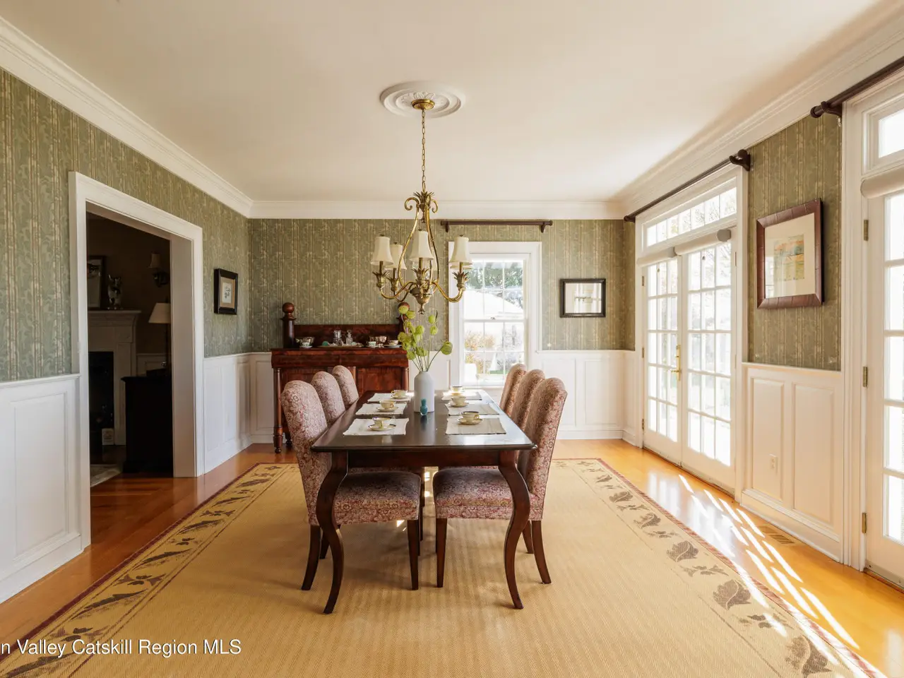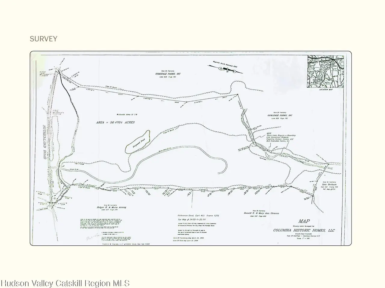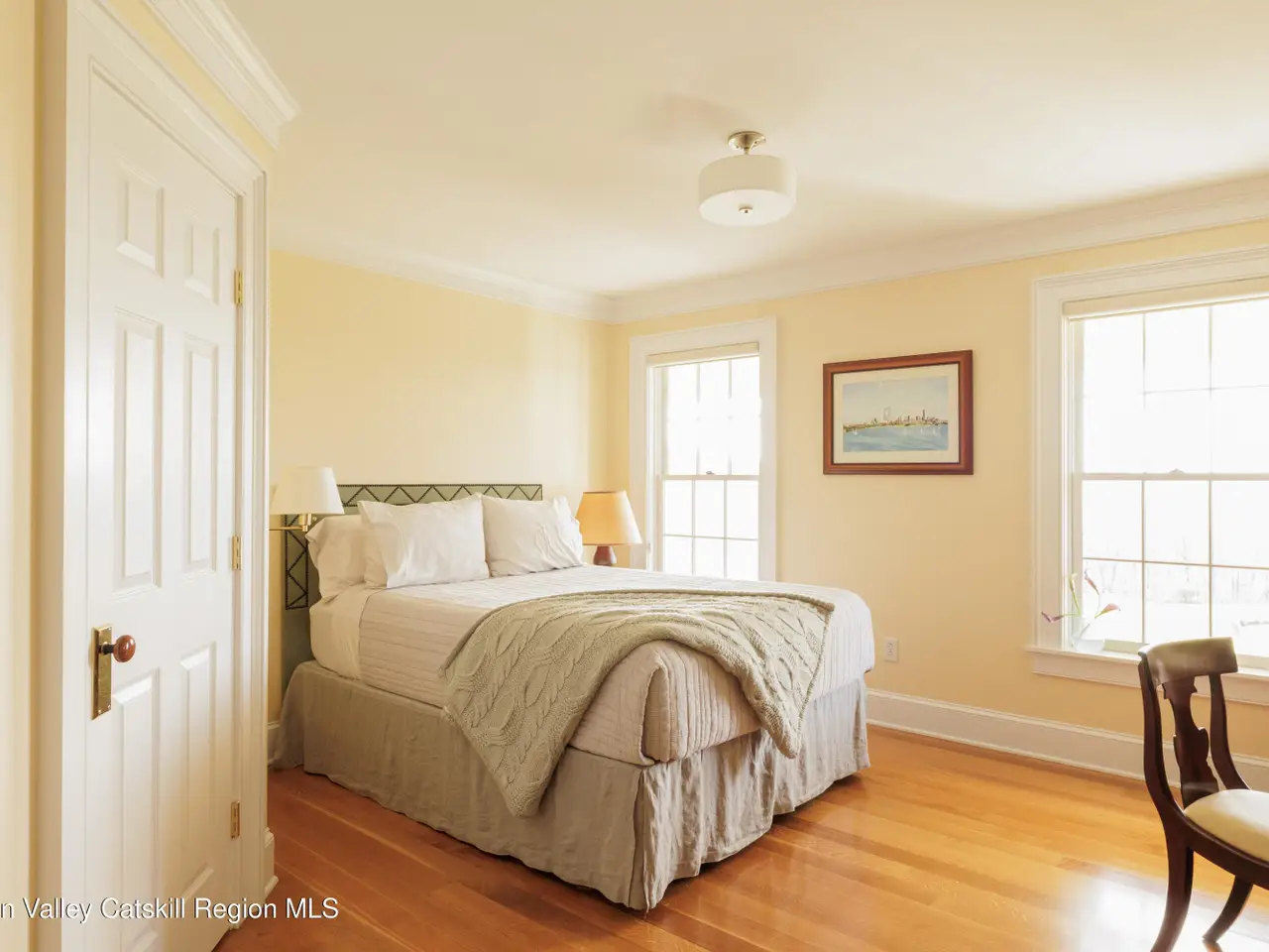 Welcome to Notre Colline Estate, a private country compound set on more than 56 acres of rolling meadows, gardens, ponds, and Catskill Mountain views. French for ''Our Hill,'' Notre Colline has an easy sense of belonging to its landscape. A long-paved drive leads to this elegantly designed 5,760 square-foot home, inspired by classic Greek Revival architecture. Built in 2005 for comfort, entertaining, and longevity, it features a standing-seam metal roof, radiant heated floors, energy-efficient heat pumps, and a fully integrated smart home system that manages lighting, temperature, security, video, and sound. The main level opens to bright, connected gathering spaces centered around a modern chef's kitchen with a large custom island, a counter depth paneled fridge, and professional-grade appliances. French doors from the dining area and breakfast nook open to a wide stone patio with an outdoor kitchen framed by landscaped gardens and open lawns, creating an easy indoor-outdoor flow. A paneled cherry wood office with built-in cabinetry and a wood-burning stove offers a quiet workspace beside a three-season sunroom, and a spacious living room with a gas fireplace invites relaxed evenings with friends and family. Upstairs, the grand primary suite feels like a private retreat, complete with a gas fireplace, two walk-in closets and a luxurious bath with a soaking tub and steam shower. Three additional bedrooms, a guest living room, two full bathrooms and a laundry room complete the second floor. The finished lower level adds generous additional living space with a recreation room, billiards area, kitchenette, sauna and full bath, ideal for guests or wellness use. An attached three-car heated garage features a porcelain tile floor and plenty of space for storage. Outdoors, a peaceful aerated pond lies at the center of the property, crossed by a charming footbridge and bordered by open lawns and walking paths. The grounds also include raised-bed gardens with irrigation, a potting shed, and a newly constructed insulated 26x34 foot outbuilding with water, electric, and space for six or more vehicles. Every detail has been considered for efficiency and ease, from spray-foam insulation and upgraded hydronic systems to improved drainage and a generator. Located minutes from Chatham village, Notre Colline Estate offers refined country living in beautiful Columbia County.
