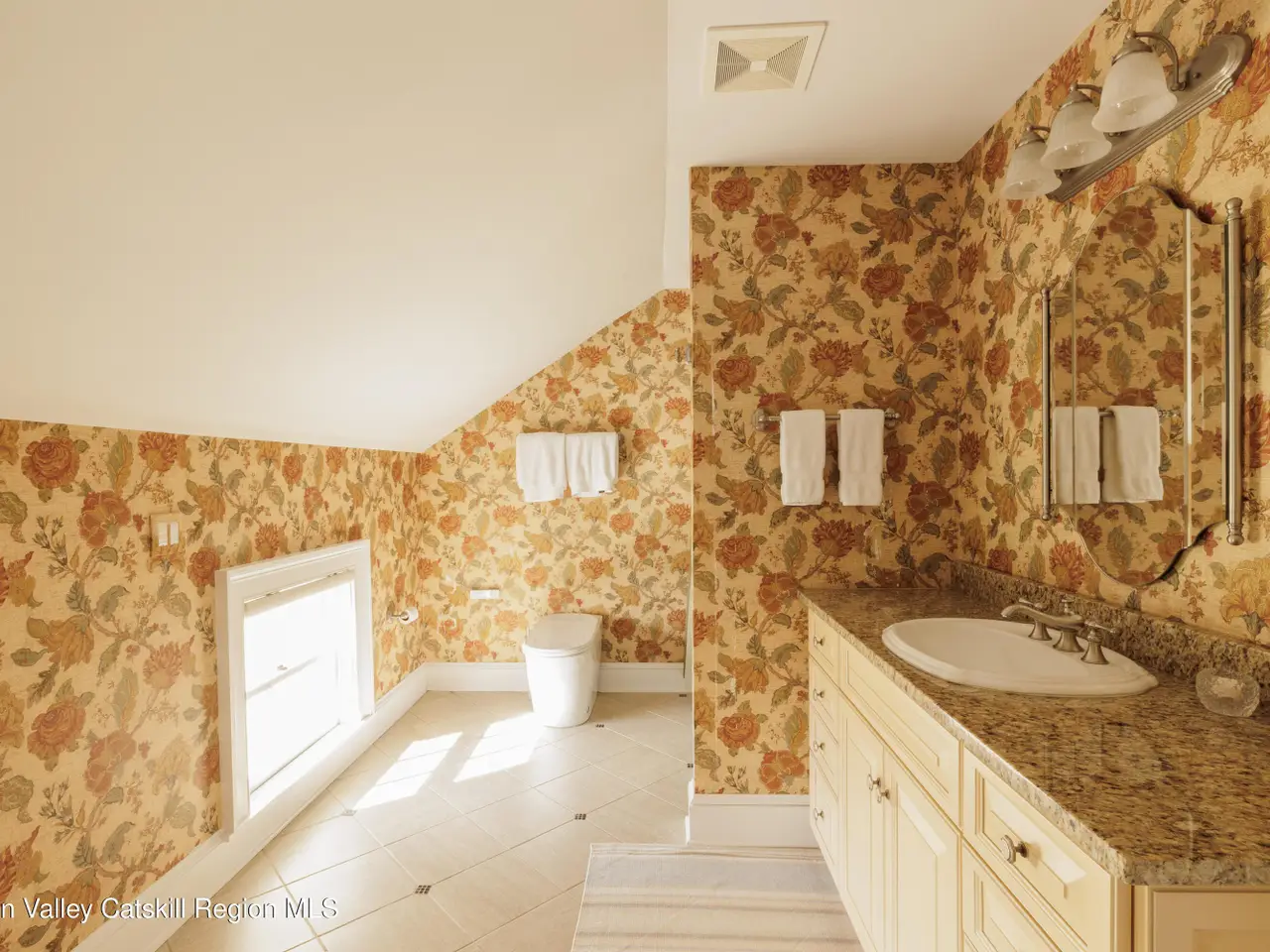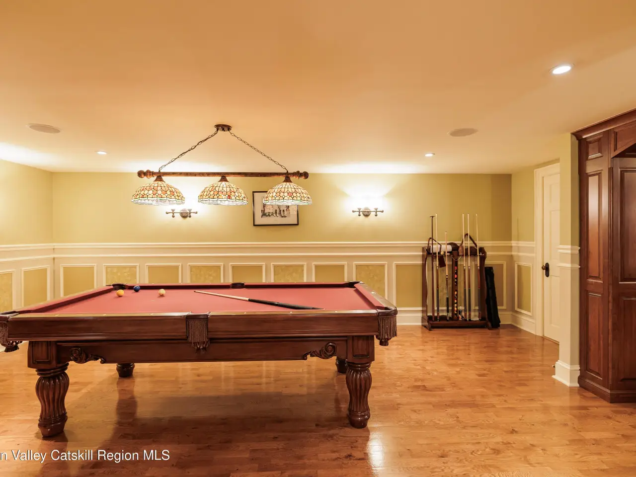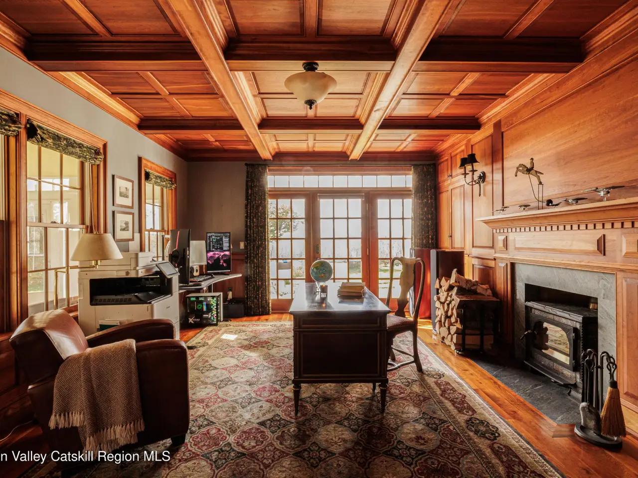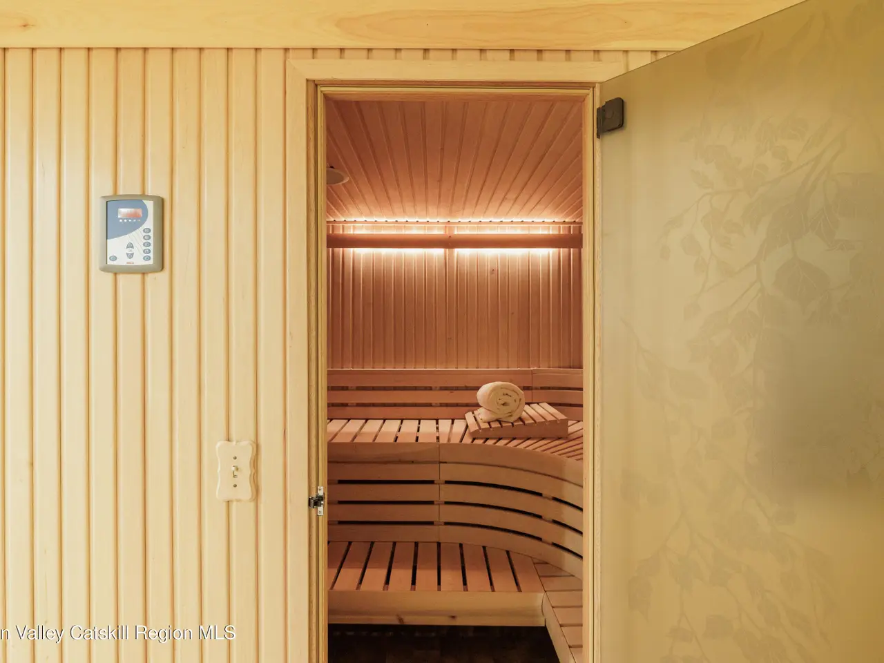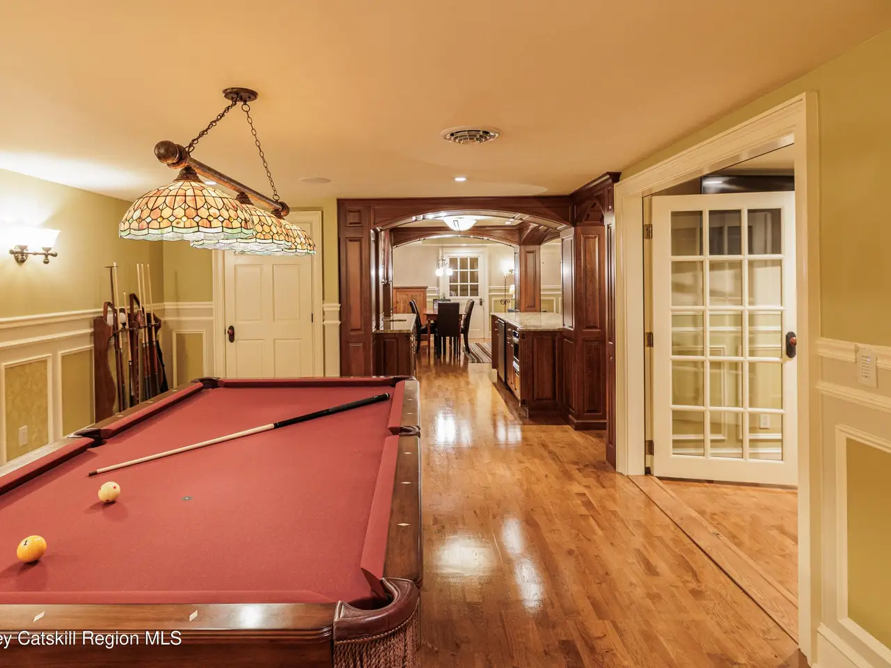 Welcome to Notre Colline Estate, a private country compound set on more than 56 acres of rolling meadows, gardens, ponds, and Catskill Mountain views. French for ''Our Hill,'' Notre Colline has an easy sense of belonging to its landscape. A long-paved drive leads to this elegantly designed 5,760 square-foot home, inspired by classic Greek Revival architecture. Built in 2005 for comfort, entertaining, and longevity, it features a standing-seam metal roof, radiant heated floors, energy-efficient heat pumps, and a fully integrated smart home system that manages lighting, temperature, security, video, and sound. The main level opens to bright, connected gathering spaces centered around a modern chef's kitchen with a large custom island, a counter depth paneled fridge, and professional-grade appliances. French doors from the dining area and breakfast nook open to a wide stone patio with an outdoor kitchen framed by landscaped gardens and open lawns, creating an easy indoor-outdoor flow. A paneled cherry wood office with built-in cabinetry and a wood-burning stove offers a quiet workspace beside a three-season sunroom, and a spacious living room with a gas fireplace invites relaxed evenings with friends and family. Upstairs, the grand primary suite feels like a private retreat, complete with a gas fireplace, two walk-in closets and a luxurious bath with a soaking tub and steam shower. Three additional bedrooms, a guest living room, two full bathrooms and a laundry room complete the second floor. The finished lower level adds generous additional living space with a recreation room, billiards area, kitchenette, sauna and full bath, ideal for guests or wellness use. An attached three-car heated garage features a porcelain tile floor and plenty of space for storage. Outdoors, a peaceful aerated pond lies at the center of the property, crossed by a charming footbridge and bordered by open lawns and walking paths. The grounds also include raised-bed gardens with irrigation, a potting shed, and a newly constructed insulated 26x34 foot outbuilding with water, electric, and space for six or more vehicles. Every detail has been considered for efficiency and ease, from spray-foam insulation and upgraded hydronic systems to improved drainage and a generator. Located minutes from Chatham village, Notre Colline Estate offers refined country living in beautiful Columbia County.