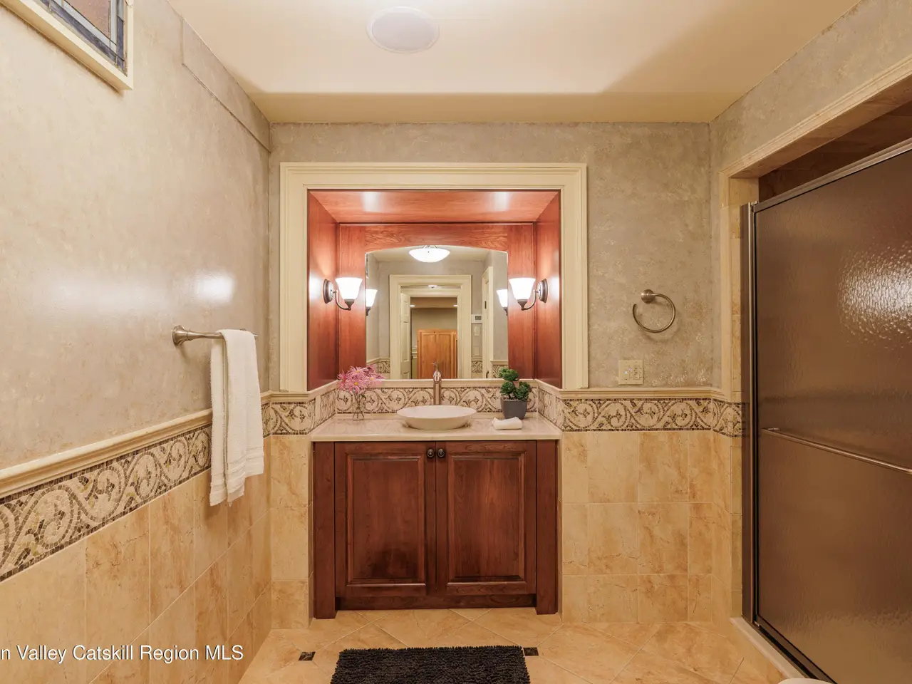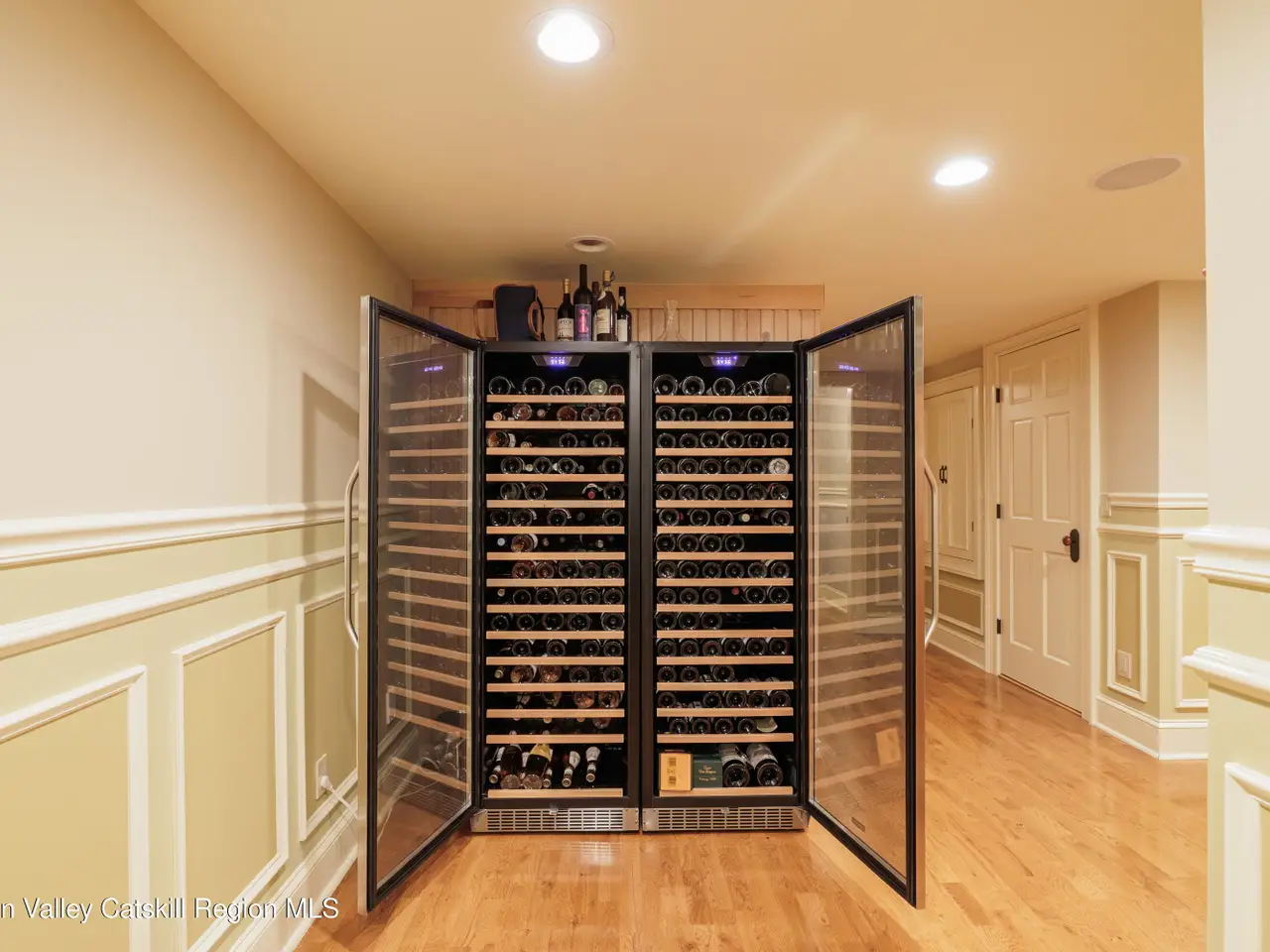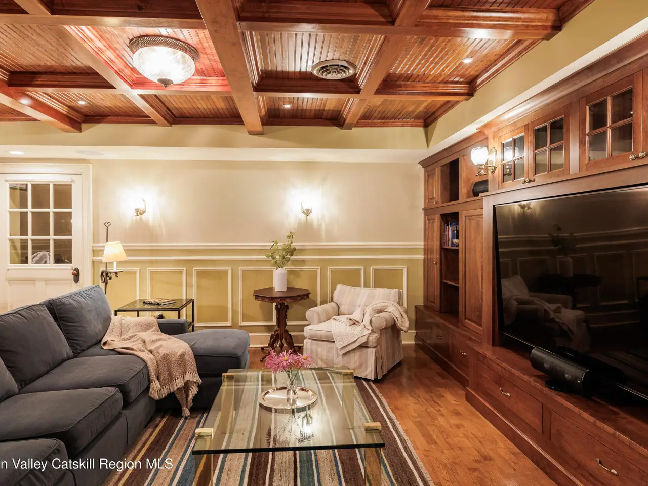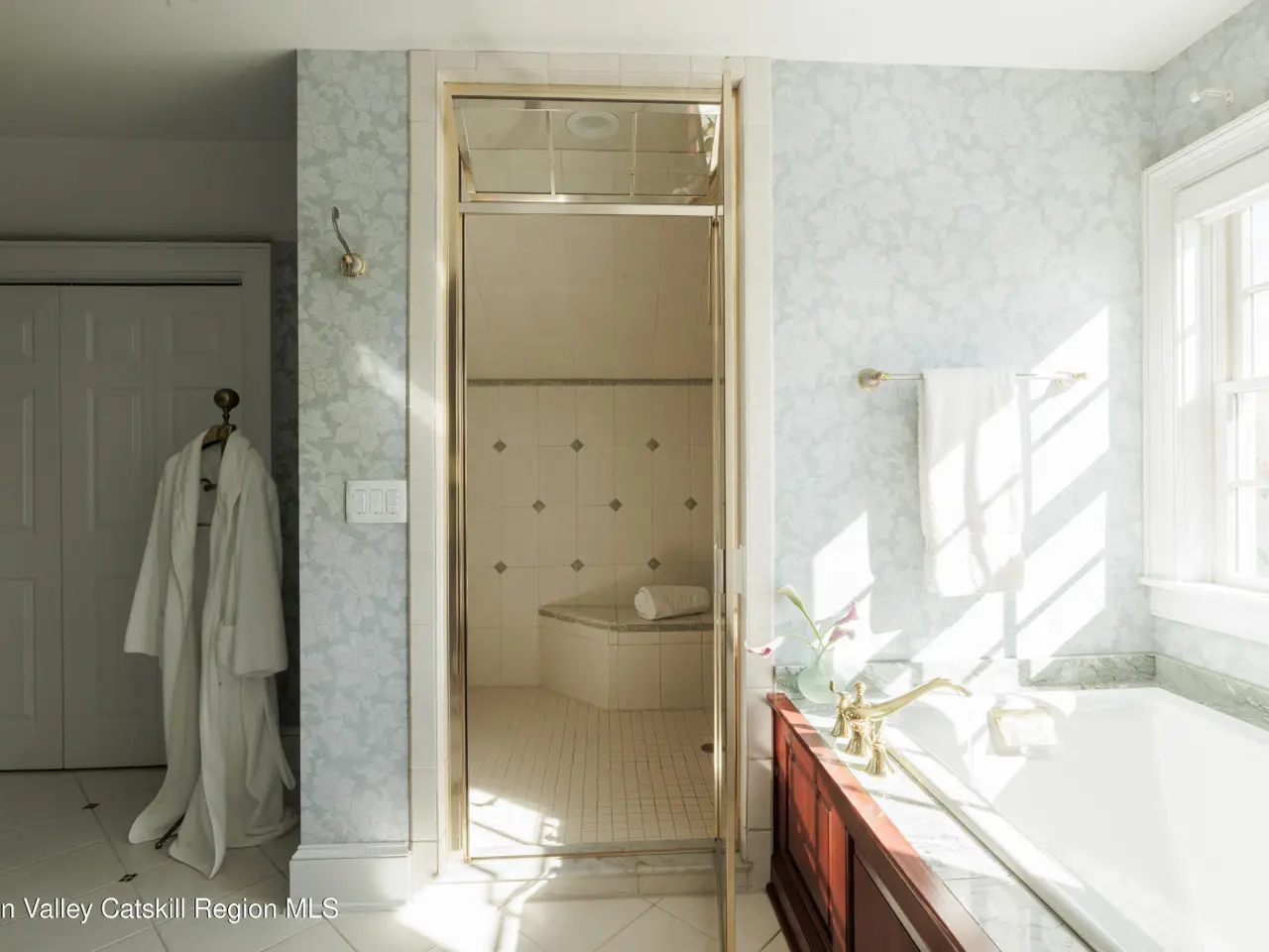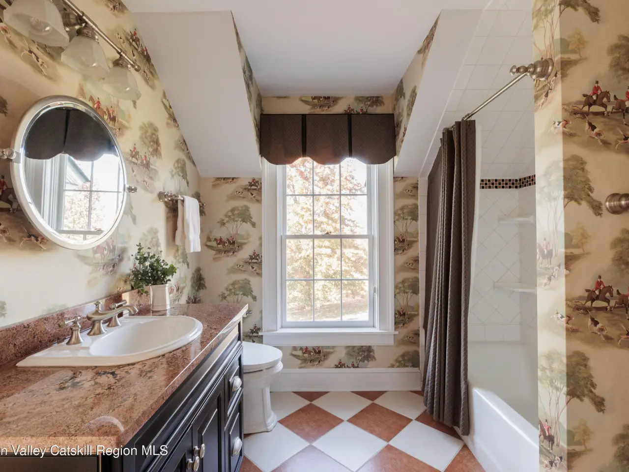 Welcome to Notre Colline Estate, a private country compound set on more than 56 acres of rolling meadows, gardens, ponds, and Catskill Mountain views. French for ''Our Hill,'' Notre Colline has an easy sense of belonging to its landscape. A long-paved drive leads to this elegantly designed 5,760 square-foot home, inspired by classic Greek Revival architecture. Built in 2005 for comfort, entertaining, and longevity, it features a standing-seam metal roof, radiant heated floors, energy-efficient heat pumps, and a fully integrated smart home system that manages lighting, temperature, security, video, and sound. The main level opens to bright, connected gathering spaces centered around a modern chef's kitchen with a large custom island, a counter depth paneled fridge, and professional-grade appliances. French doors from the dining area and breakfast nook open to a wide stone patio with an outdoor kitchen framed by landscaped gardens and open lawns, creating an easy indoor-outdoor flow. A paneled cherry wood office with built-in cabinetry and a wood-burning stove offers a quiet workspace beside a three-season sunroom, and a spacious living room with a gas fireplace invites relaxed evenings with friends and family. Upstairs, the grand primary suite feels like a private retreat, complete with a gas fireplace, two walk-in closets and a luxurious bath with a soaking tub and steam shower. Three additional bedrooms, a guest living room, two full bathrooms and a laundry room complete the second floor. The finished lower level adds generous additional living space with a recreation room, billiards area, kitchenette, sauna and full bath, ideal for guests or wellness use. An attached three-car heated garage features a porcelain tile floor and plenty of space for storage. Outdoors, a peaceful aerated pond lies at the center of the property, crossed by a charming footbridge and bordered by open lawns and walking paths. The grounds also include raised-bed gardens with irrigation, a potting shed, and a newly constructed insulated 26x34 foot outbuilding with water, electric, and space for six or more vehicles. Every detail has been considered for efficiency and ease, from spray-foam insulation and upgraded hydronic systems to improved drainage and a generator. Located minutes from Chatham village, Notre Colline Estate offers refined country living in beautiful Columbia County.