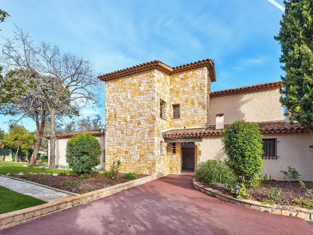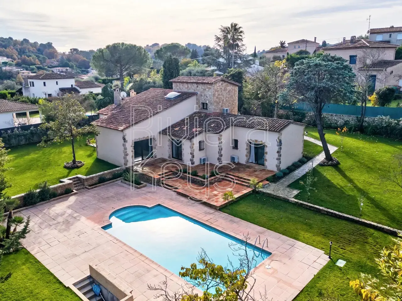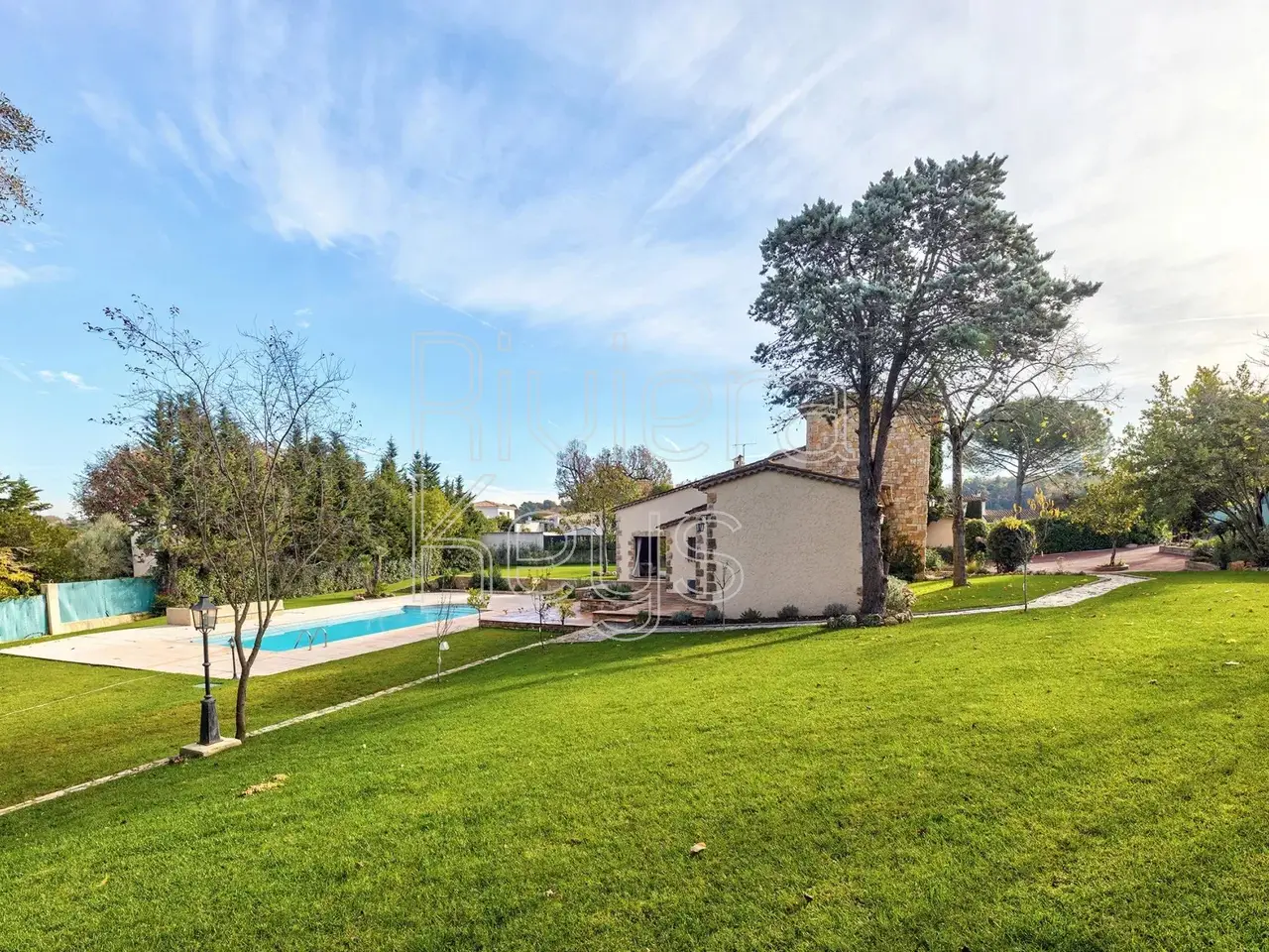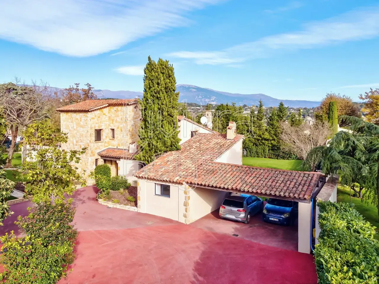Located in a peaceful area just minutes from the village of Valbonne (1 km), this charming villa is set in a sought-after residential neighbourhood. The property sits on a flat 2,528 m² plot featuring fruit trees and a swimming pool. Fully renovated and air-conditioned, the bright interior offers an entrance hall, a spacious cathedral-style living room with a fireplace, an open-plan kitchen and dining area, a laundry room, 3 ground-floor bedrooms, and a master suite. Upstairs, a large mezzanine leads to a 5th bedroom with an en-suite shower room. The property also includes a carport and multiple outdoor parking spaces.