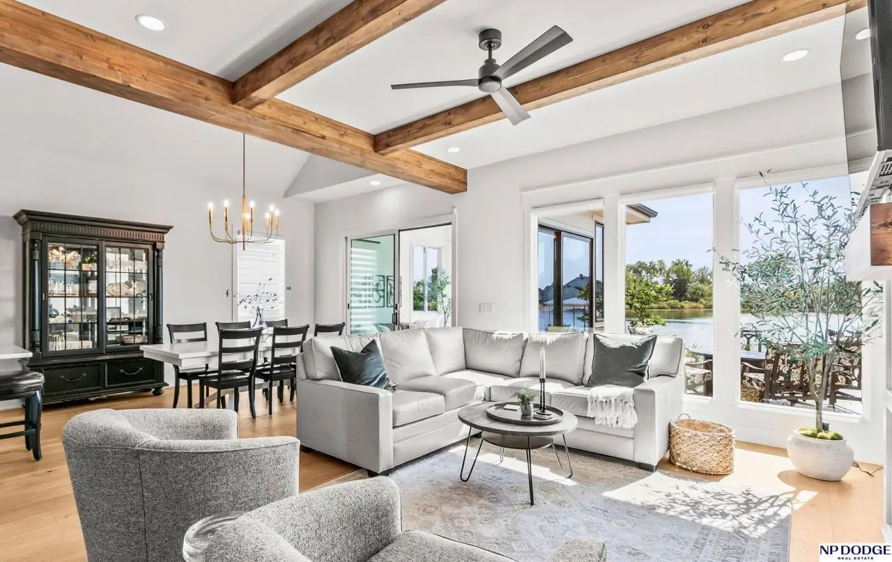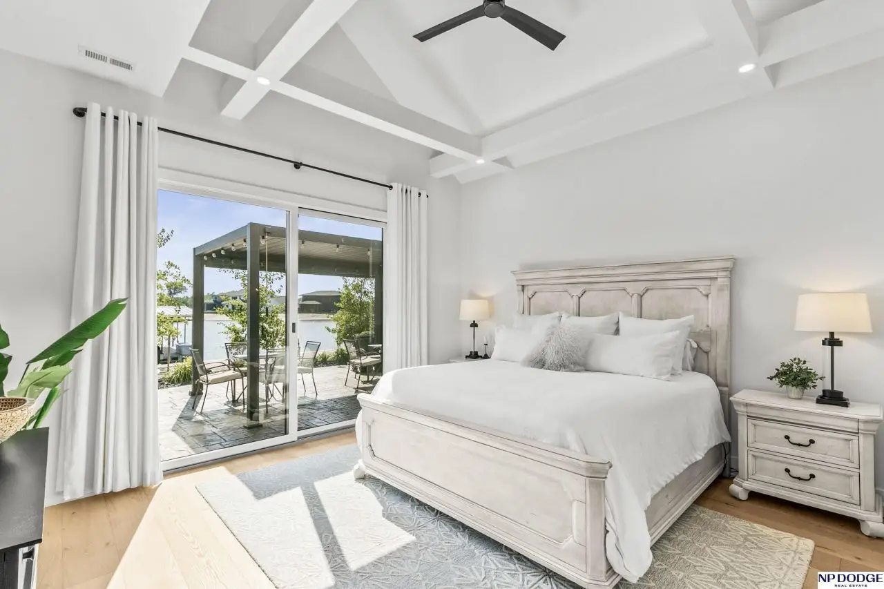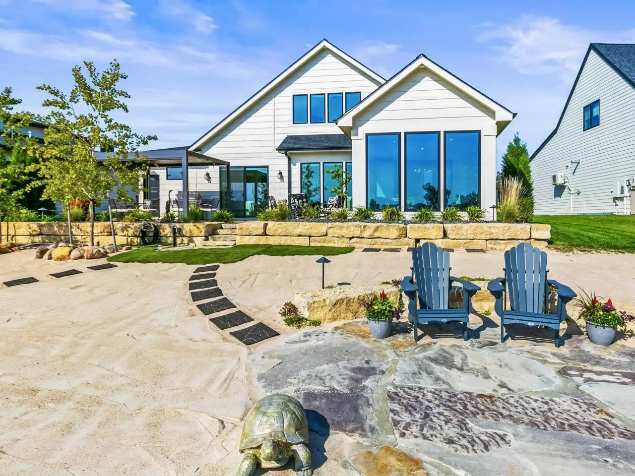 Experience the epitome of lakeside living in this former Street of Dreams custom home with sweeping views and timeless craftsmanship. A chef-inspired kitchen boasts an oversized island, hidden walk-in pantry with butcher block counter, custom hood, and coffee/wine bar with refrigerator. White oak floors, pine beams, vaulted ceilings, and a stone wall fireplace define the main living area, opening to a climate-controlled sunroom with fabulous views. The primary suite is a true retreat with lake access and a custom closet with laundry. A second main floor ensuite provides comfort and privacy for guests. Additional features include a second laundry, hidden storm shelter, outside lake bathroom, and heated garage. Outdoor living shines with a stamped patio, pergola with pull-down screens, stone fire pit landing, professional landscaping, and seawall. A Rhino Dock concrete deck and HydroHoist boat lift add seasonal enjoyment, while a gas generator provides peace of mind. AMA