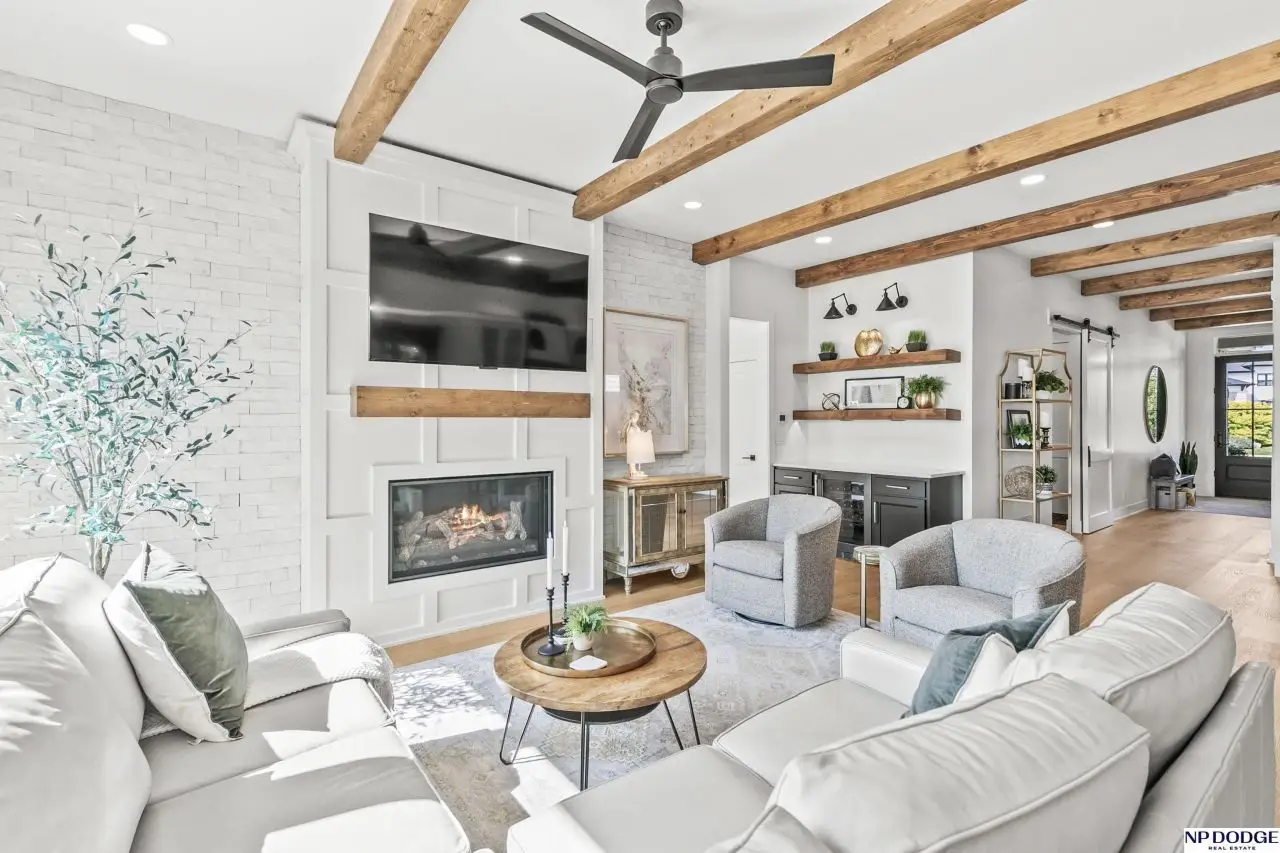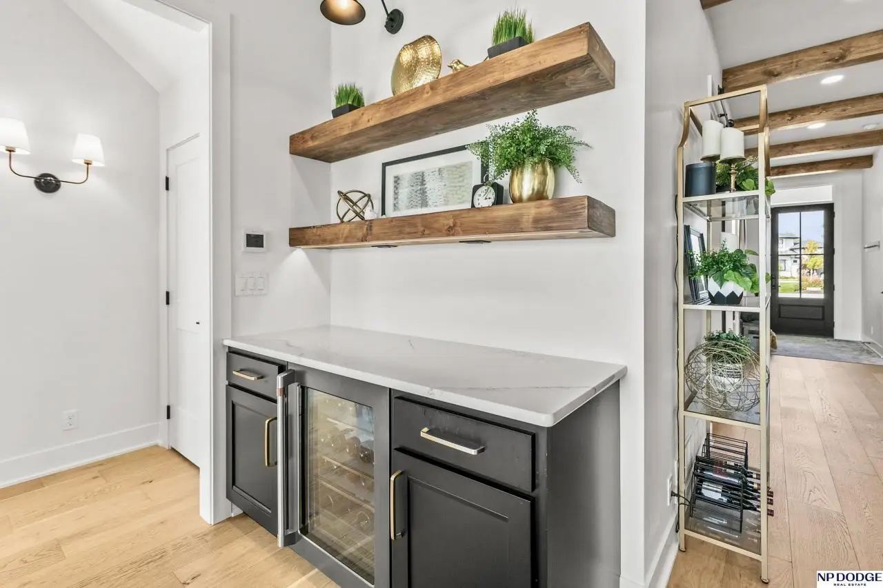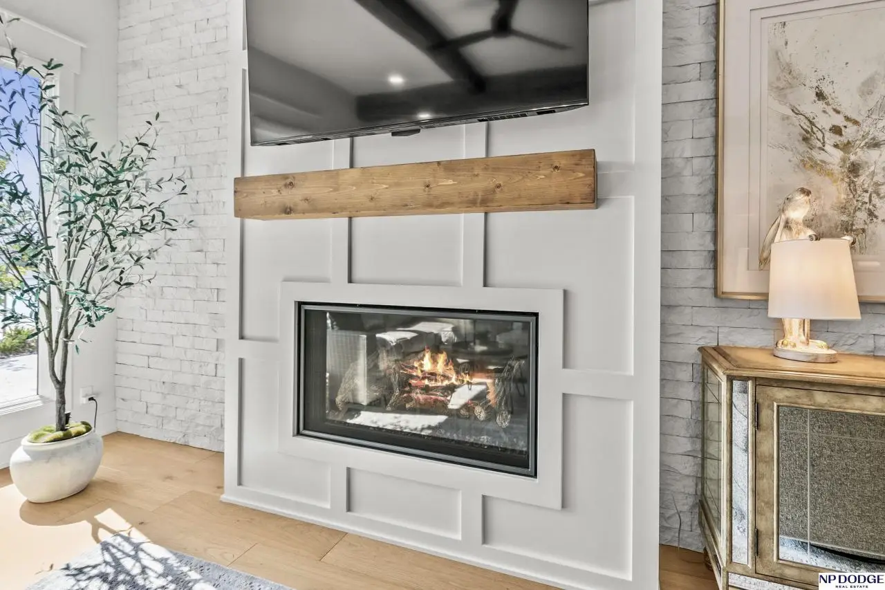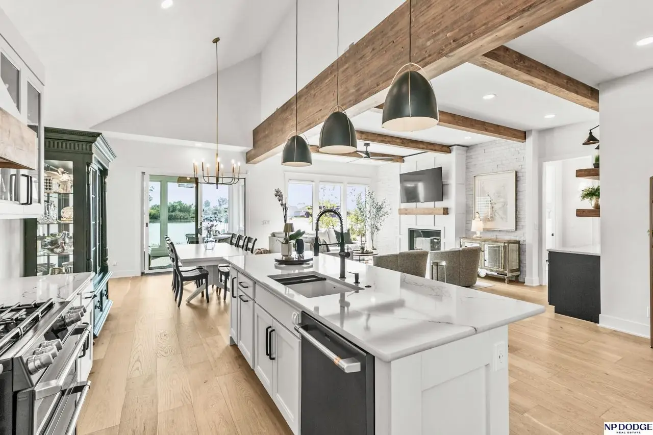 Experience the epitome of lakeside living in this former Street of Dreams custom home with sweeping views and timeless craftsmanship. A chef-inspired kitchen boasts an oversized island, hidden walk-in pantry with butcher block counter, custom hood, and coffee/wine bar with refrigerator. White oak floors, pine beams, vaulted ceilings, and a stone wall fireplace define the main living area, opening to a climate-controlled sunroom with fabulous views. The primary suite is a true retreat with lake access and a custom closet with laundry. A second main floor ensuite provides comfort and privacy for guests. Additional features include a second laundry, hidden storm shelter, outside lake bathroom, and heated garage. Outdoor living shines with a stamped patio, pergola with pull-down screens, stone fire pit landing, professional landscaping, and seawall. A Rhino Dock concrete deck and HydroHoist boat lift add seasonal enjoyment, while a gas generator provides peace of mind. AMA