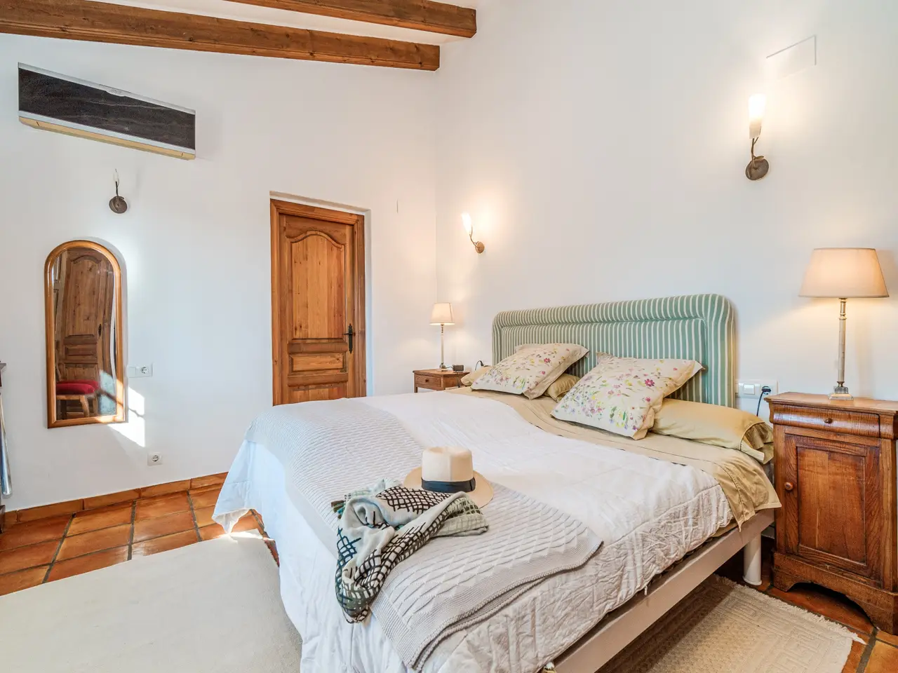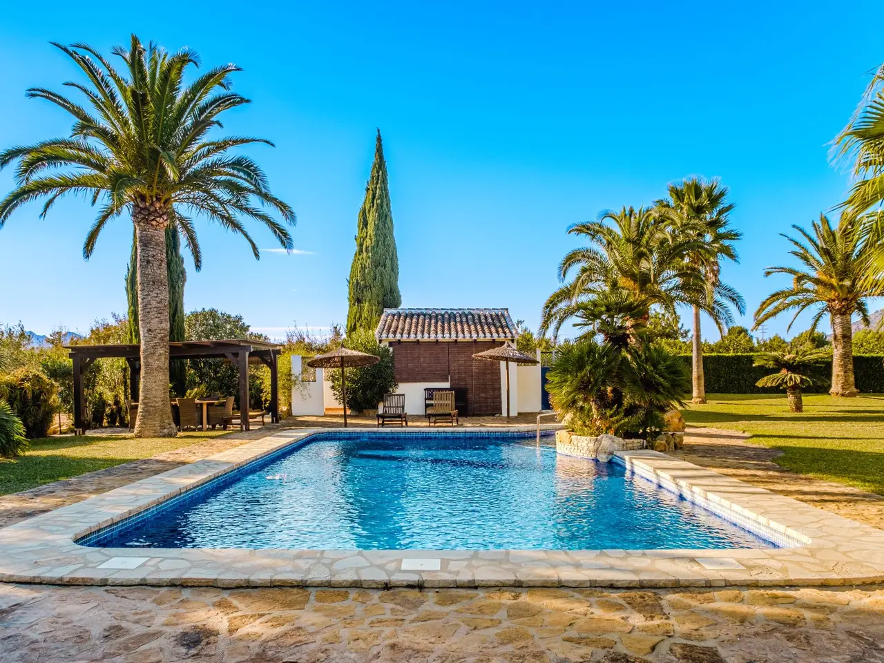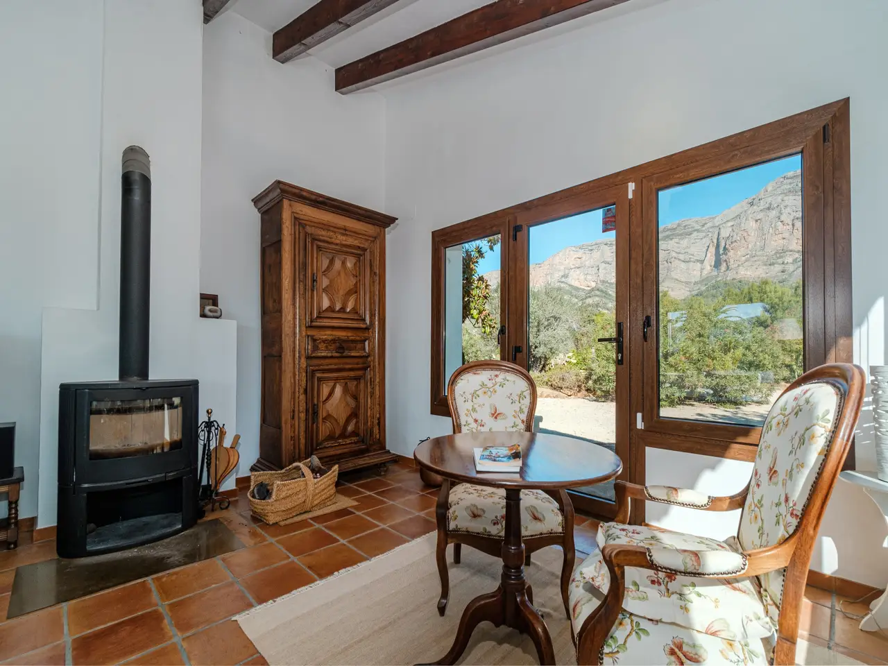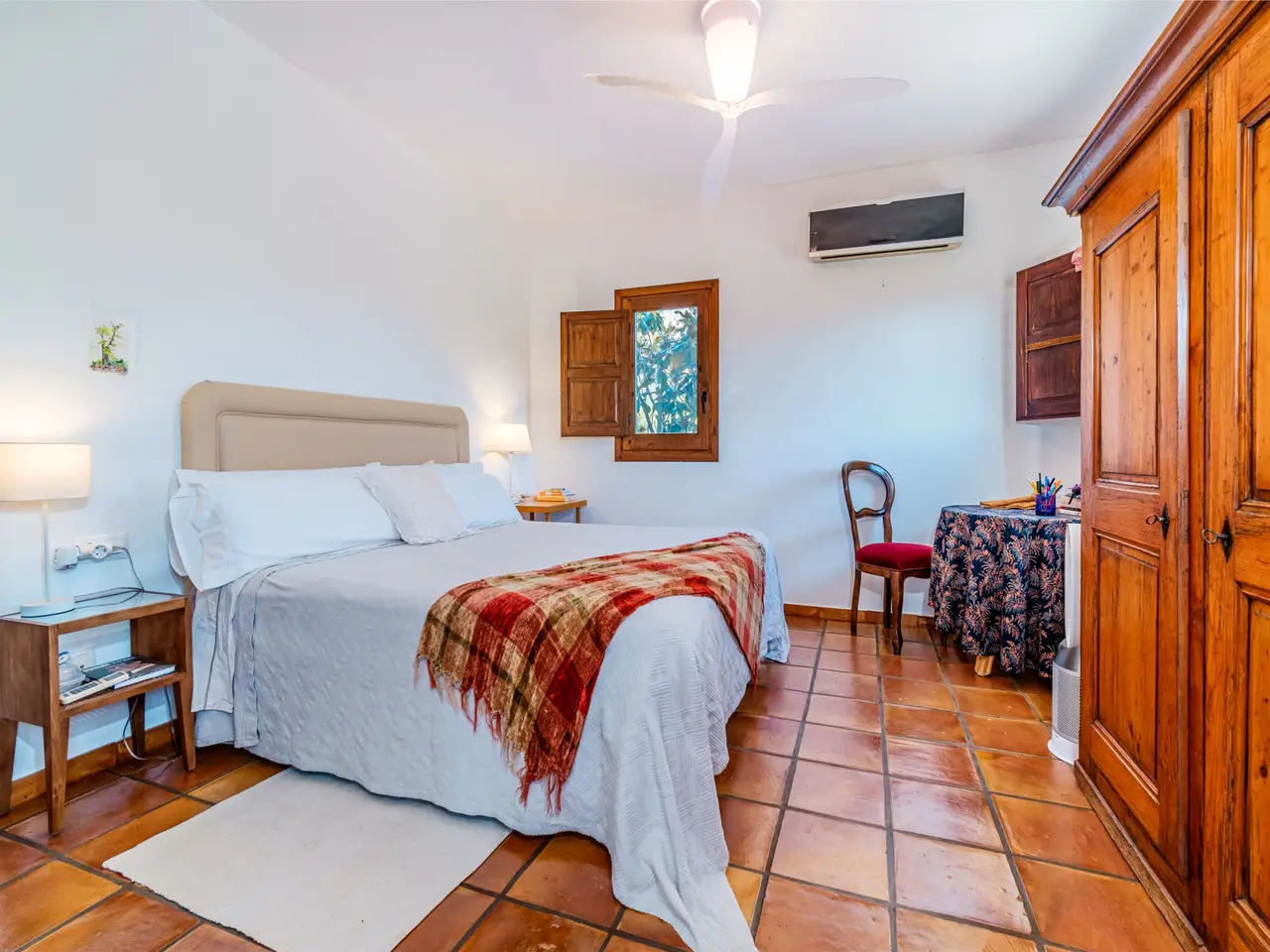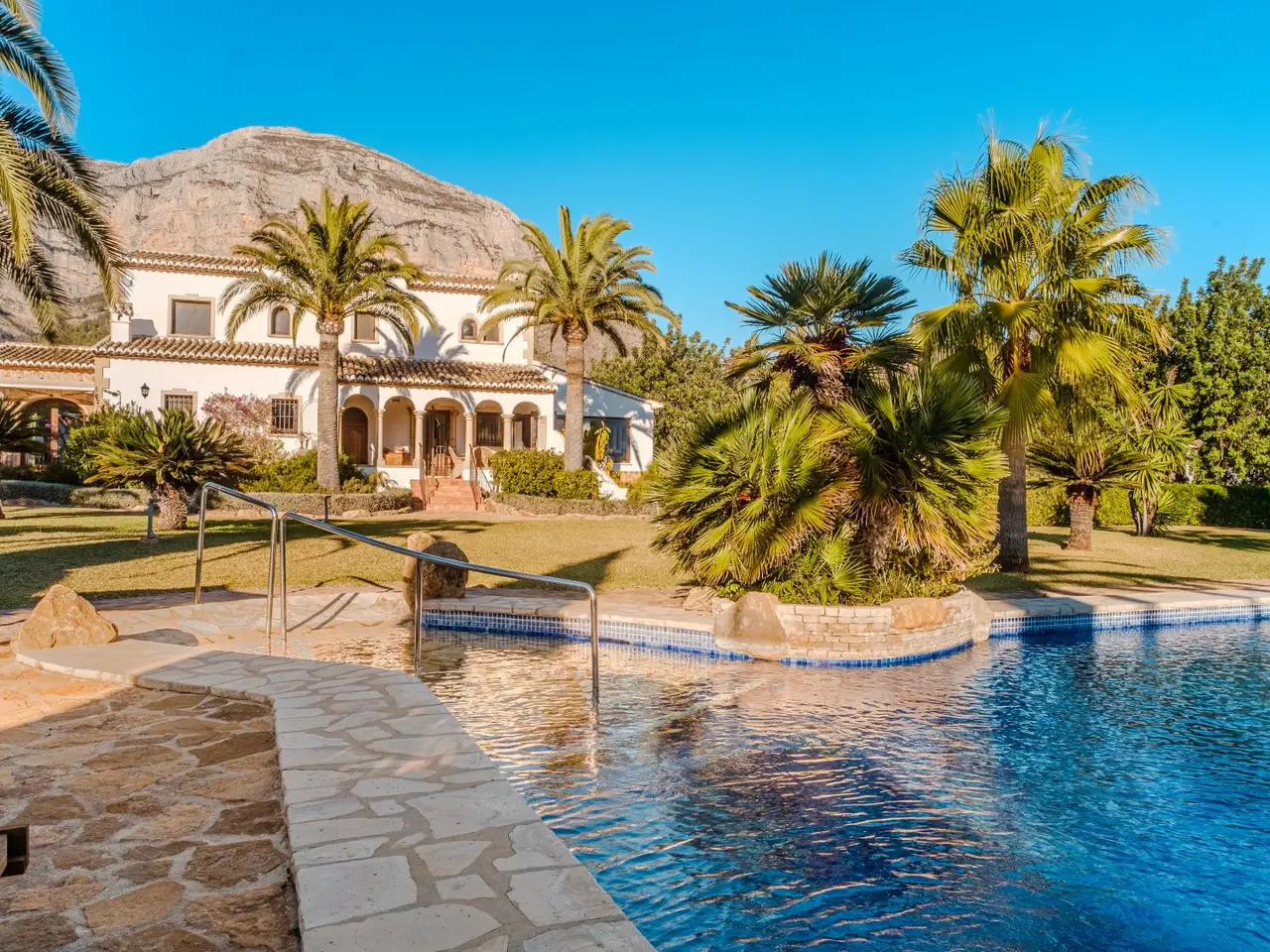 This charming traditional style villa is located in a fantastic residential area, just 3 km from Jávea. The beautiful house offers all the charm and wonderful natural surroundings of a true typical Spanish villa, set on a plot of approximately 16.000 m2, with its own vineyards, olive, grapefruit, almond and orange trees. In fact, this property has all the elements of the romantic ideal that attracts so many people to the Mediterranean region. The house covers a built area of 415m2, facing south and overlooking the Montgó. The main floor contains a charming dining room with fireplace, a fully equipped rustic kitchen, a bright living room, a TV room, two bedrooms with en-suite bathrooms and another living room/office. On the first floor you will find another bedroom with bathroom, the master bedroom, a rustic style suite with dressing room and a spacious bathroom. The basement level contains a wine cellar, pantry, laundry room and a spacious living room. The villa has terracotta floors and wooden doors, frames and beams, as well as modern facilities and comforts such as central heating, air conditioning and an automatic irrigation system. In addition, there is a separate casita consisting of a living room with fireplace and kitchen, 1 bedroom and 1 complete bathroom. In a property like this much of the focus is on the nature of the exterior, which adds to the quality of life. A feature to note is the large porch leading to the lawn, a green area flanked by a consolidated garden and a barbecue area with equipped summer kitchen. The epicentre of the garden is a 12x6 metre heated swimming pool (salt water) from where you can enjoy beautiful mountain views. The large private fenced plot has its own driveway leading to a patio and a pergola for three cars, a large storage room and a water deposit. Within a few minutes drive you can access the magnificent beaches and coves, protected natural areas and the beautiful old town of Jávea, as well as several golf courses, spa hotels and a wide range of water sports and horse riding. Charming rustic villa with modern facilities, exquisite gardens and a large swimming pool, surrounded by grapefruit, almond and orange groves, just 3 km from Jávea.