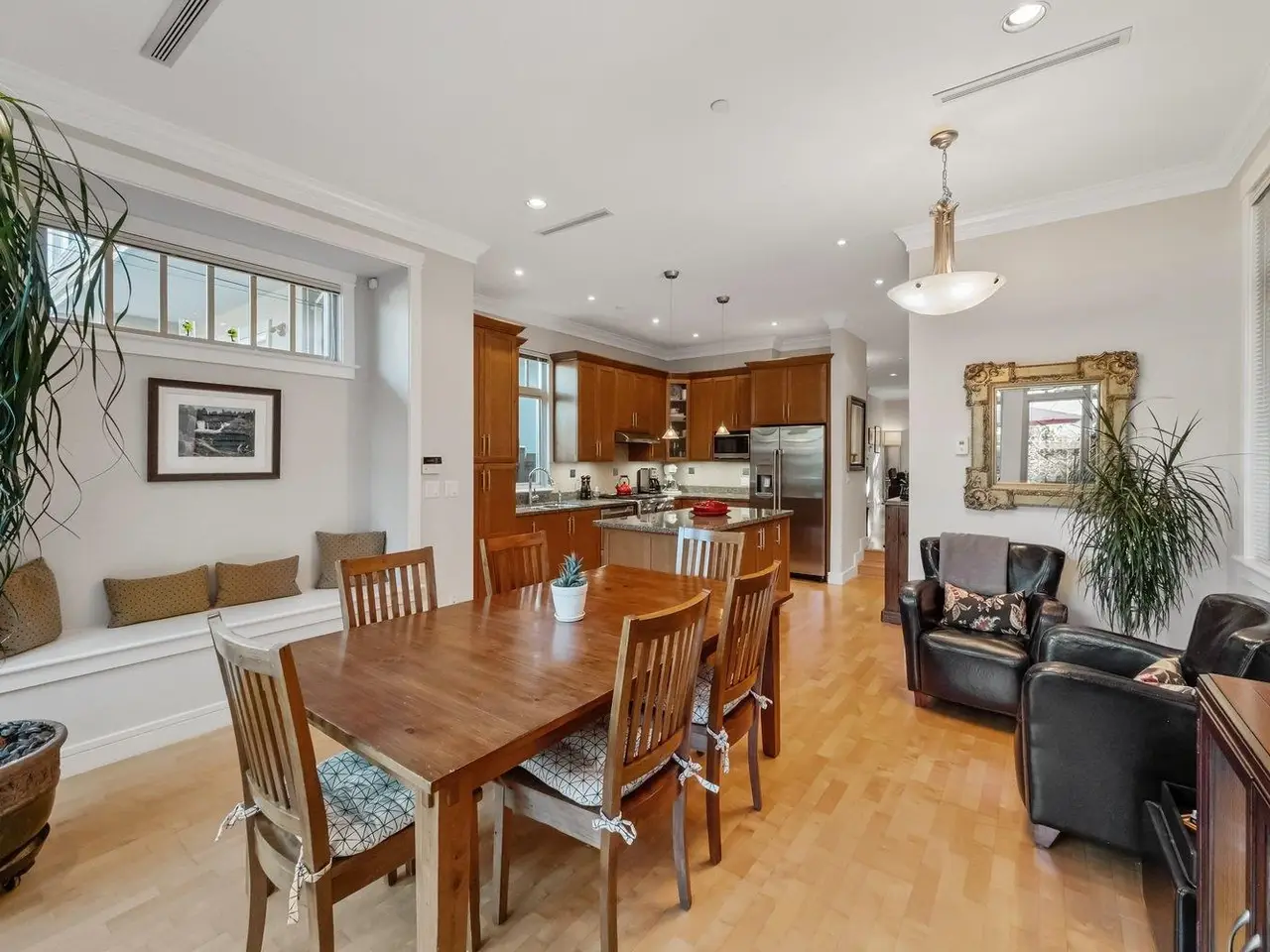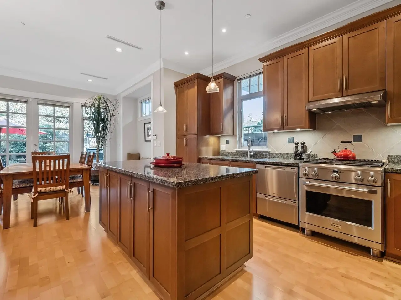 Perennial gardens lead to the front entry of this stately 4-bed, 4-bath, 3-storey Kerrisdale home. Open concept main w/ over-height ceilings, maple H/W floors, & architectural details throughout, including crown moulding, recessed bench seating in family rm, windows seat & gas F/P in living rm. Chef's kitchen w/ bespoke cabinets & island, granite counters, gas range, & S/S appliances. French doors lead to patio for seamless in/outdoor living. 2nd floor features: sprawling primary bed w/ ensuite, + 2 additional beds (one w/ vaulted ceiling), bath, & laundry. Potential 2nd primary suite on top floor w/ ensuite, W-I-C, skylight, & W-facing balcony. Serene backyard w/ professional hardscaping & custom pond.