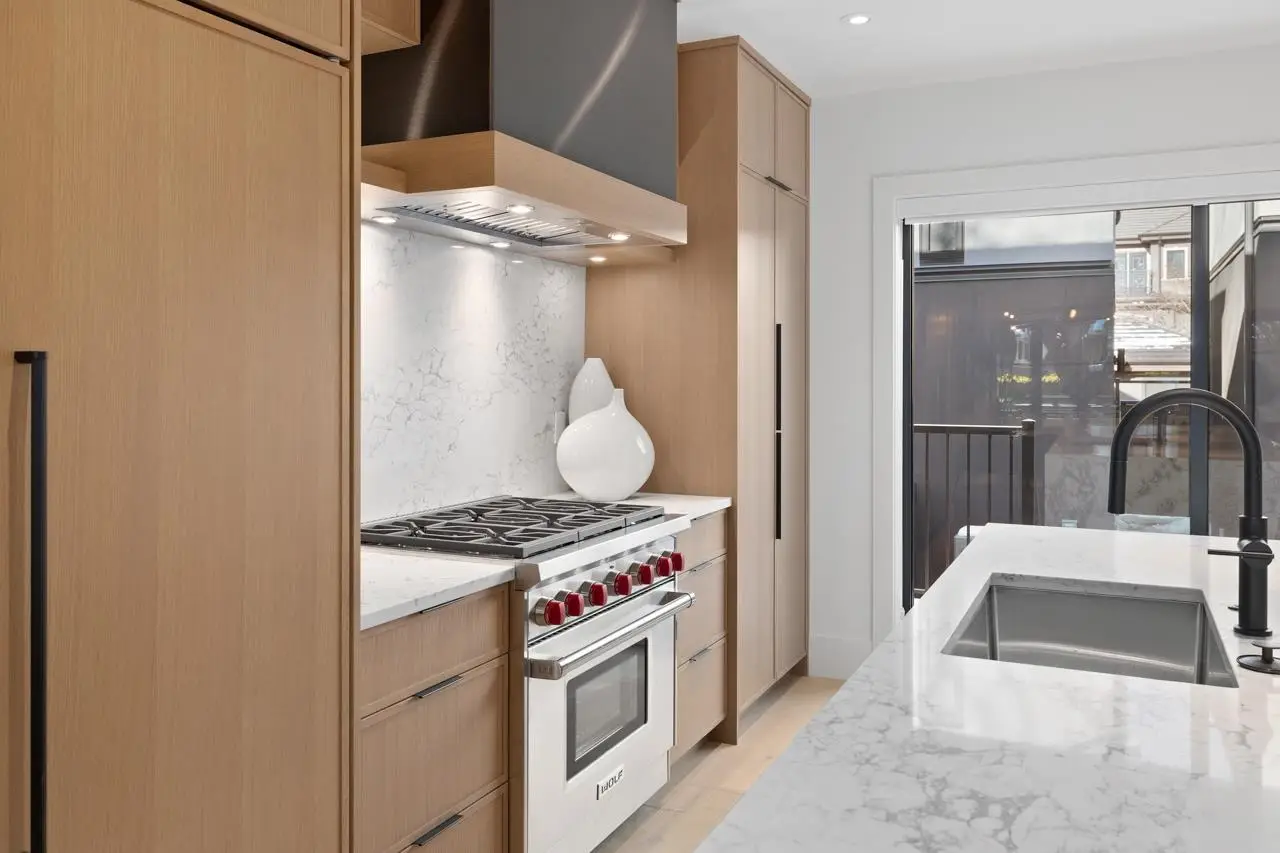 "The Heights" by Crossmark Projects offers this 3-bed+Den, 3.5-bath residence spanning 3 thoughtfully designed levels. The main floor boasts a spacious living room, a dining area perfect for family gatherings, and a gourmet kitchen with a 4'x10' island, custom oak cabinetry, integrated Sub-Zero fridge, Wolf 6-burner stove, and a large pantry. The upper level is a family retreat with 3 beds+ a primary suite with hotel-inspired ensuite. The versatile lower level includes a cozy theater/rec room, bedroom/office, and flexible gym space and exterior entry. Enjoy large front and back yards, parking, ample storage, and unbeatable walkability to all of Kerrisdale's amenities.