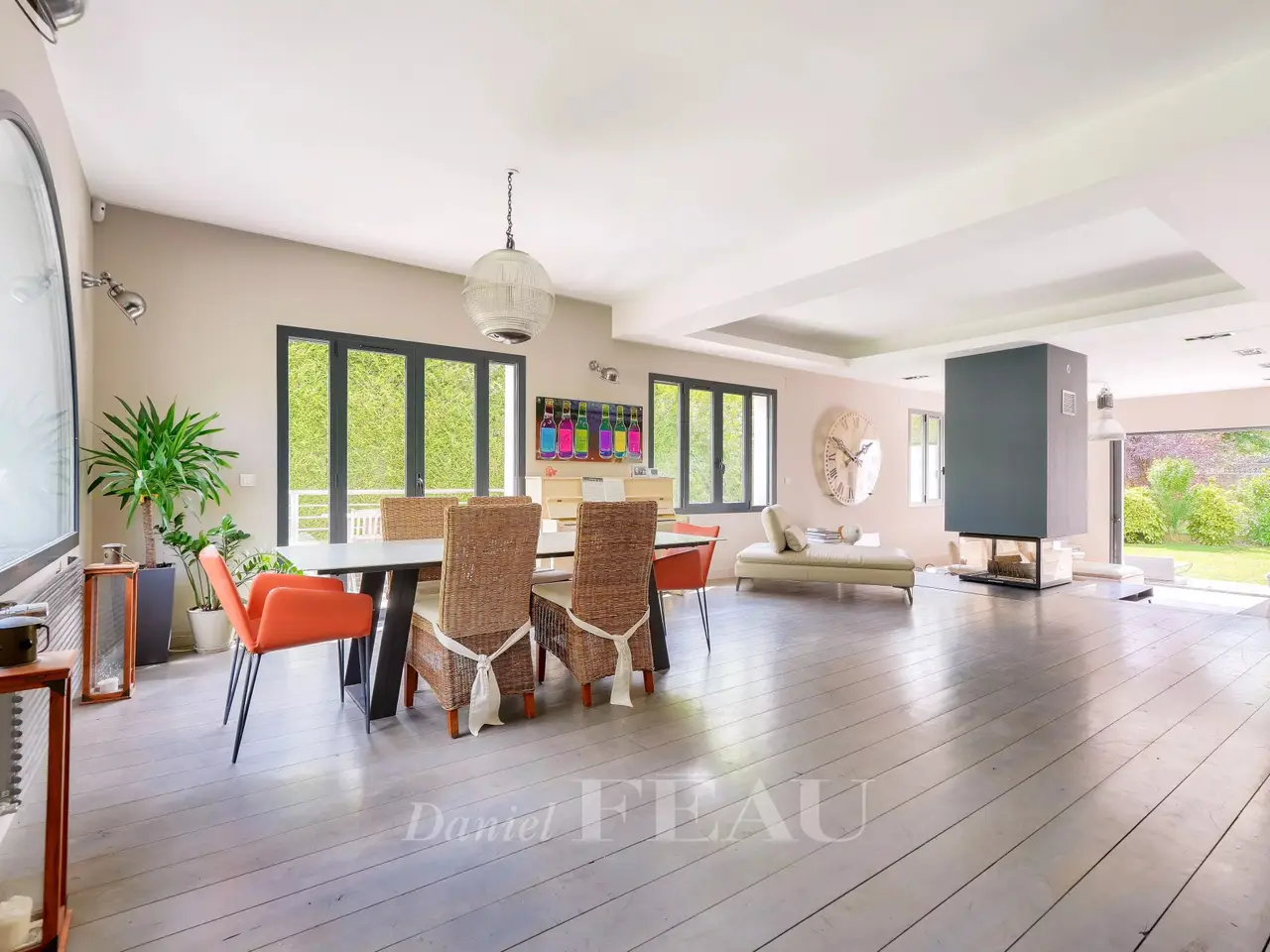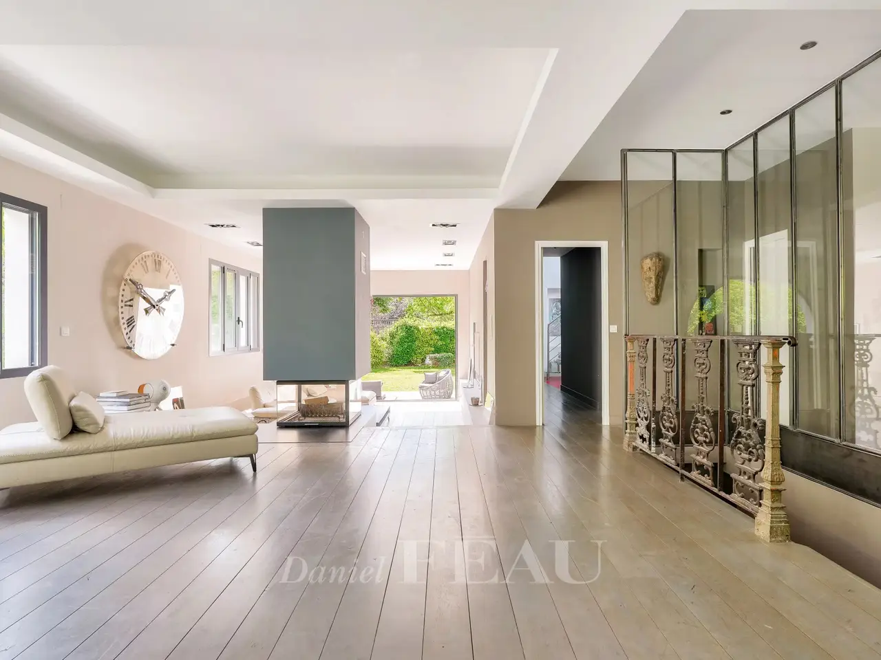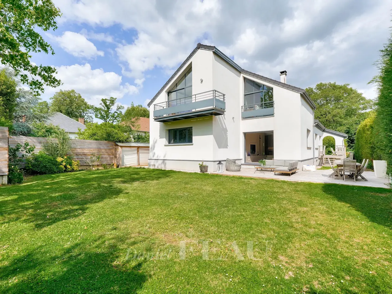 Sole Agent. This 1930s property extended in 2015 to offer 285 sqm of floor space and about 250 sqm of living space is set in a level 842 sqm plot. It includes a 70 sqm living/reception room with a fireplace accessing terraces, an equipped kitchen, a study, two bedrooms with shower rooms, and a guest wc. Upstairs are a spacious master suite with a bath/shower room, and a bedroom with a shower room, each opening onto a terrace. On an entresol with a guest bedroom with a shower room, a recreation room, a utility room and a garage. A 7/ minute walk from the station, the shops and the schools.