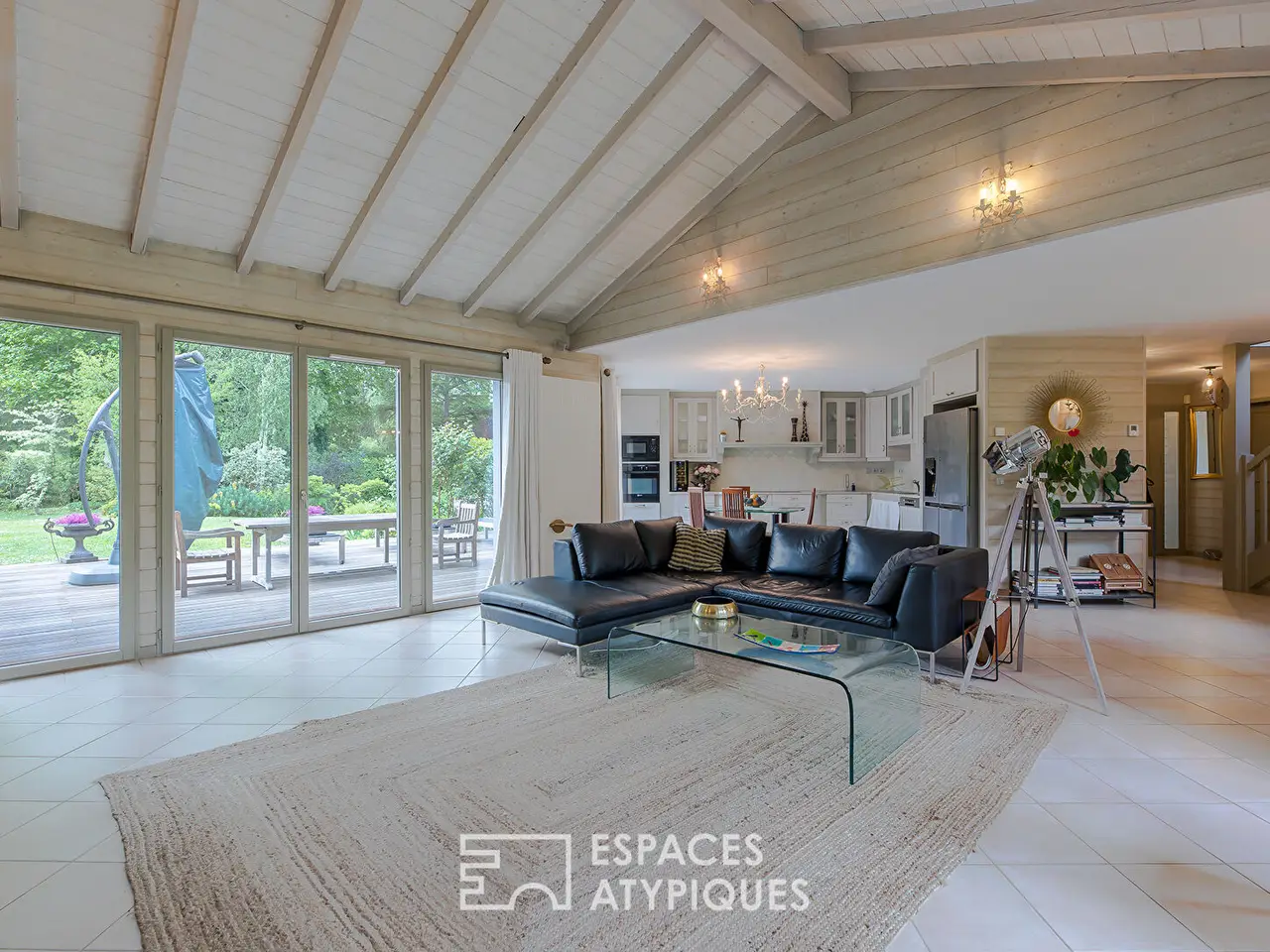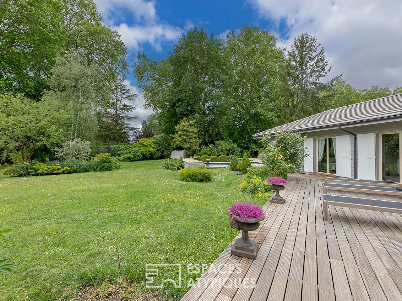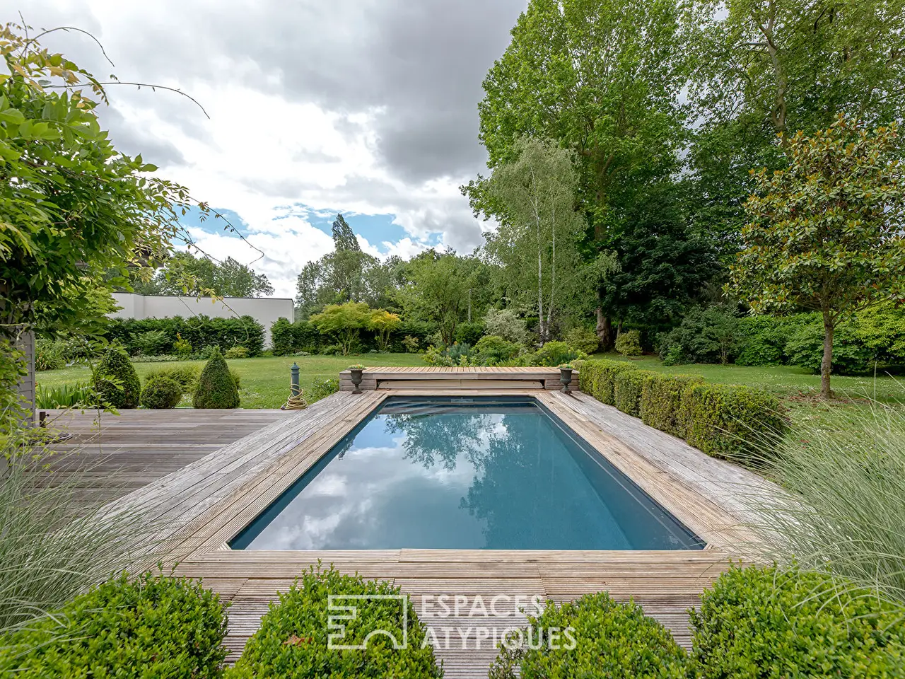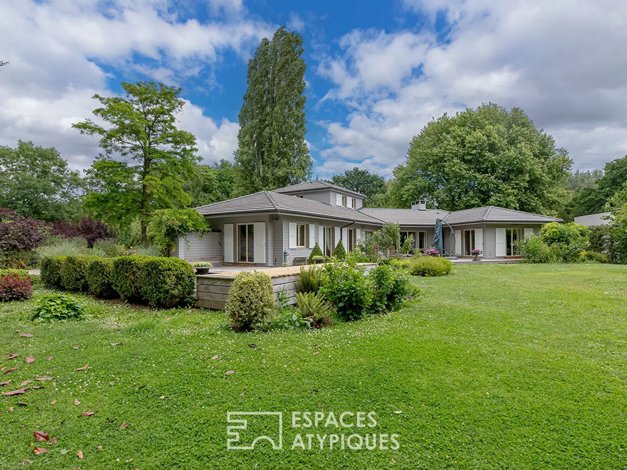 Like an air of Louisiana in Normandy: such is the promise of this incredible house nestled in one of the rare private estates in the Eure valley. Indeed, before accessing the property, you will have to 'show your credentials' at the gates of the Chateau park, a magnificent 70-hectare estate crossed by a river and within which around fifty residences with varied architecture are scattered. Without a doubt, this property is undoubtedly one of the most original and of the highest standard. Born in 2002 from the hand of an inspired architect, the 'V'-shaped architectural house immediately displays a unique character and arouses curiosity thanks to its almond green cladding that is both romantic and contemporary. Continuing, the interior atmosphere is soft and relaxing. A large entrance leads directly to the main room, the large cathedral living room and the adjoining American kitchen. Nearly 65 m2 dedicated to the reception, by the fireplace or by opening the bay windows opening directly onto the beautiful wooden terrace and the swimming pool with counter-current swimming. Each season has its pleasures with only one constant: 'well-being'! The master suite adjoining the living room is no less astonishing: 45 m2 made up of 2 beautiful rooms: one serving as a bedroom and the other which can be transformed into a dressing room or office as desired. An elegant bathroom and a library corridor complete the ensemble. In the other wing of the house, 3 pretty bedrooms, a bathroom, a shower room and separate toilets will welcome family and friends in complete peace and quiet. Upstairs, in the 'turret', 2 additional rooms (bedroom and office) with adjoining shower room and toilet make up almost an independent mini-studio. A pantry and laundry room connect the entrance to the house with the garage, now converted into a workshop and technical room. Heating of the whole is provided by a geothermal heat pump. Outside, the garden designed by a renowned landscaper, who collaborated in the design of the Jardin des Tuileries), is a true enchantment in all seasons; robotic lawn mowers and automatic watering will allow you to enjoy it without constraints and without being overlooked. Double carport with charging station, garage and garden shed complete the premises. For those who find this cocoon too narrow, simply go through the gate to go for a walk in the paths of the estate, near the lake or along the Eure; unless you prefer to perfect your backhand on one of the 3 tennis courts open to the co-ownership. This incredible gem is located 1 hour from Paris and 6km from Pacy-sur-Eure! Louisiana is definitely at your doorstep! CLASSE ENERGIE : C / CLASSE CLIMAT : A Montant moyen estime des depenses annuelles d'energie pour un usage standard, etabli a partir des prix de l'energie de l'annee 2023 : entre 1730€ et 2380€ Les informations sur les risques auxquels ce bien est expose sont disponibles sur le site Georisques : www.georisque.gouv.fr REF. 9232EAE Additional information * 8 rooms * 6 bedrooms * 4 bathrooms * 2 shower rooms * Floor : 1 * 2 floors in the building * Outdoor space : 2635 SQM * Parking : 3 parking spaces