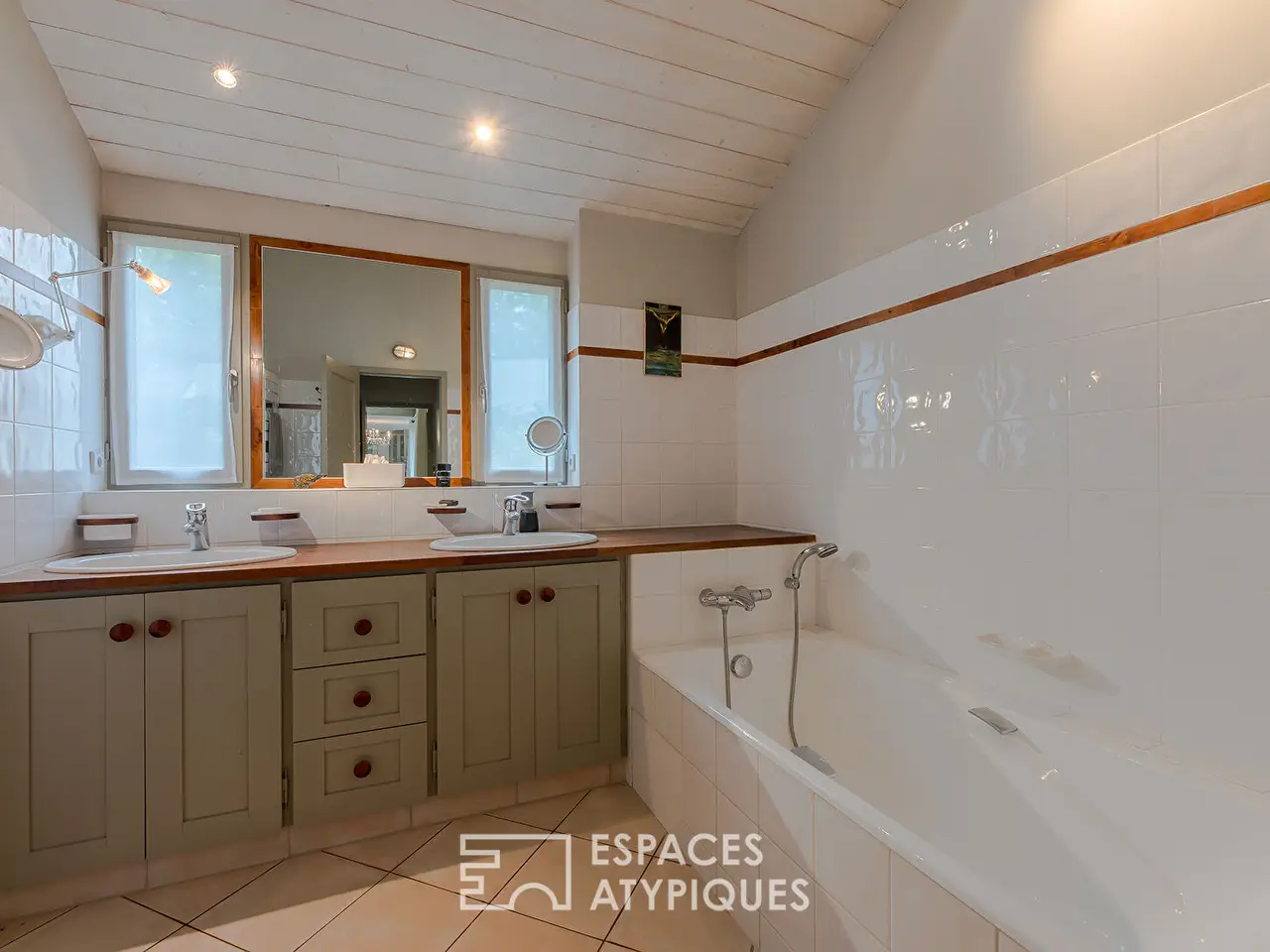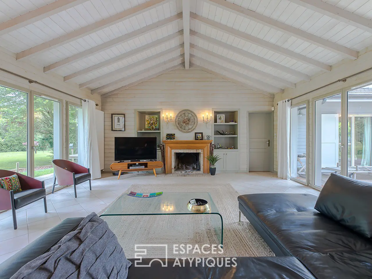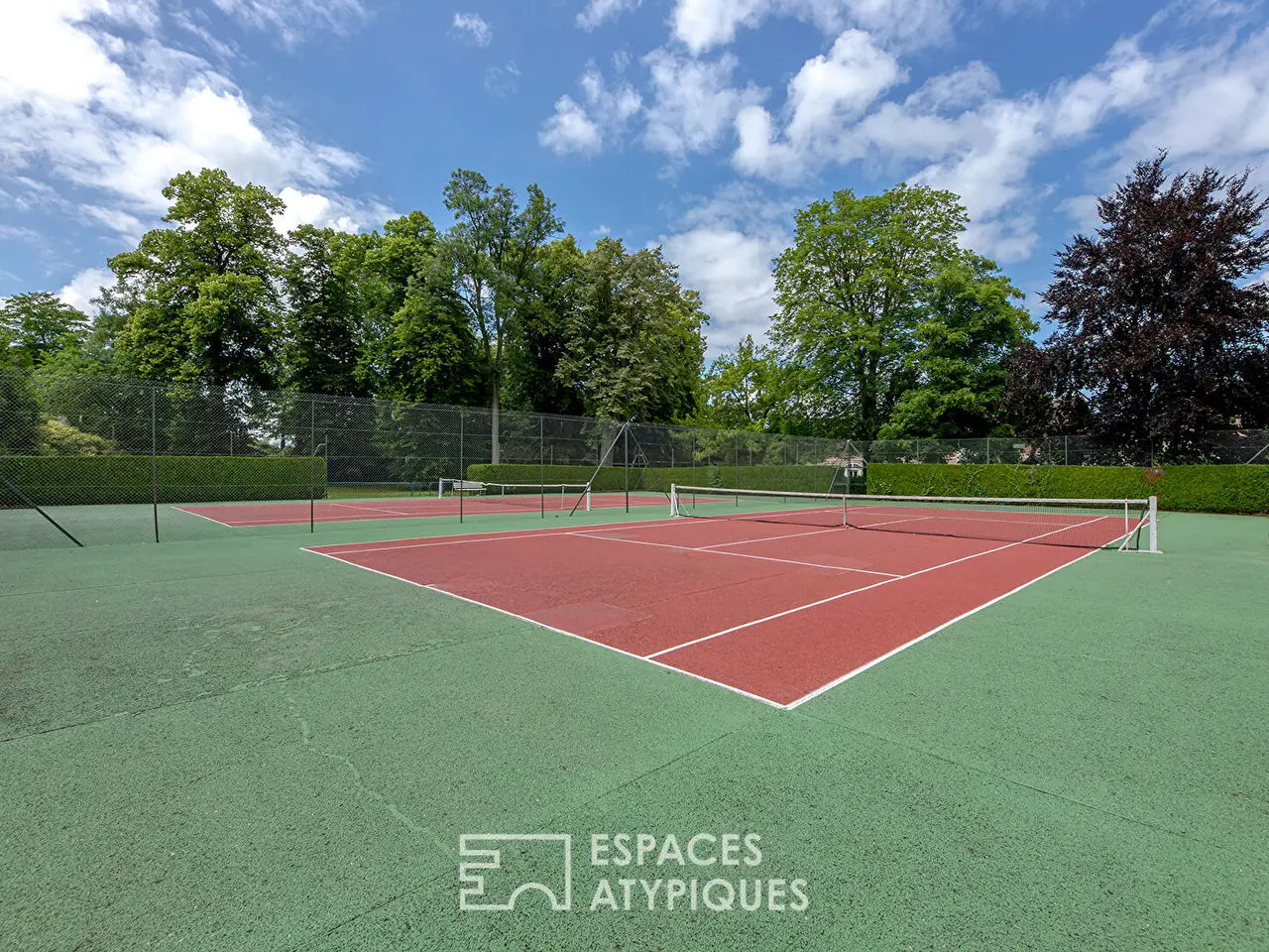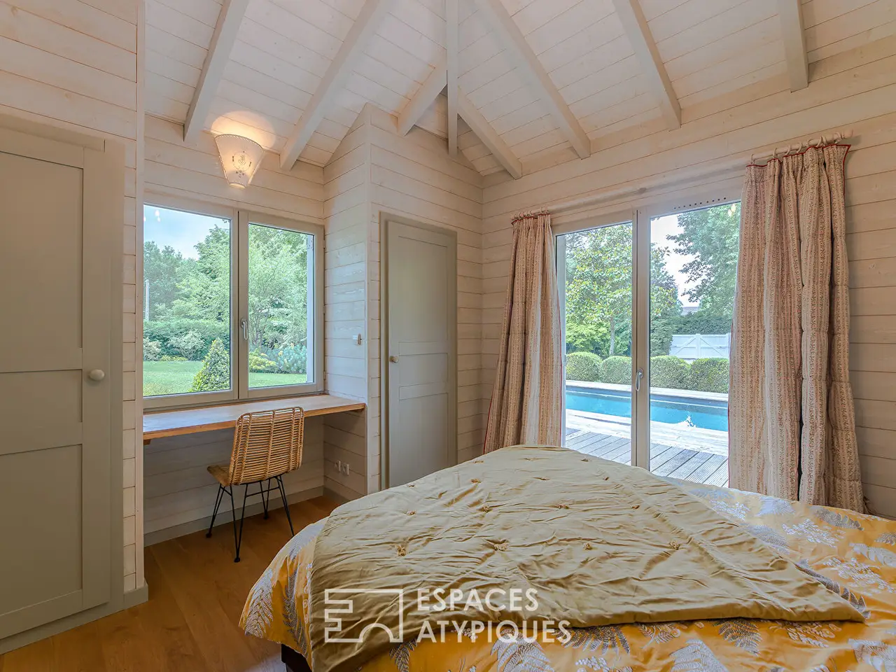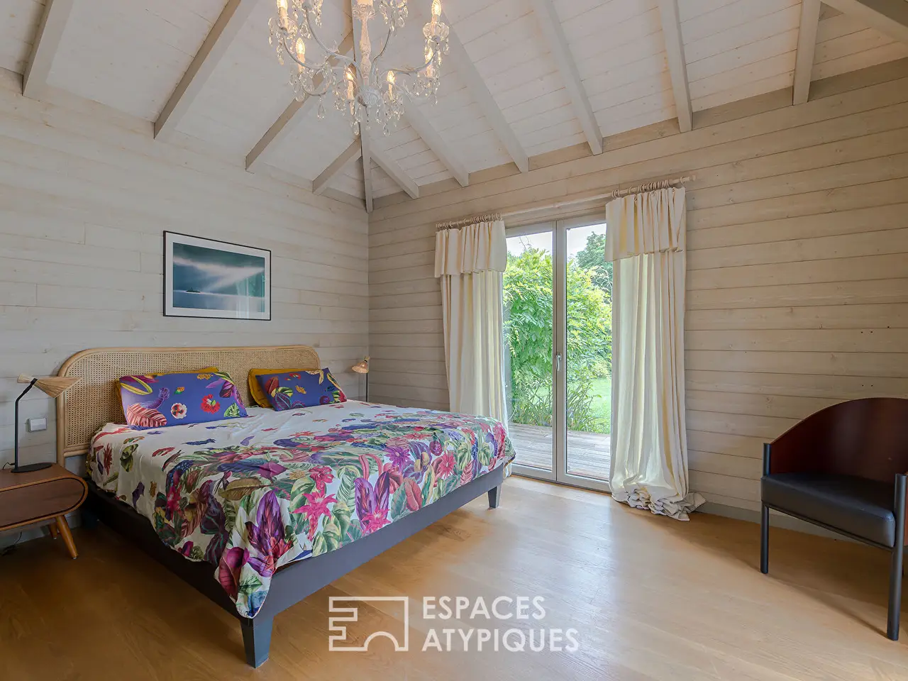 Like an air of Louisiana in Normandy: such is the promise of this incredible house nestled in one of the rare private estates in the Eure valley. Indeed, before accessing the property, you will have to 'show your credentials' at the gates of the Chateau park, a magnificent 70-hectare estate crossed by a river and within which around fifty residences with varied architecture are scattered. Without a doubt, this property is undoubtedly one of the most original and of the highest standard. Born in 2002 from the hand of an inspired architect, the 'V'-shaped architectural house immediately displays a unique character and arouses curiosity thanks to its almond green cladding that is both romantic and contemporary. Continuing, the interior atmosphere is soft and relaxing. A large entrance leads directly to the main room, the large cathedral living room and the adjoining American kitchen. Nearly 65 m2 dedicated to the reception, by the fireplace or by opening the bay windows opening directly onto the beautiful wooden terrace and the swimming pool with counter-current swimming. Each season has its pleasures with only one constant: 'well-being'! The master suite adjoining the living room is no less astonishing: 45 m2 made up of 2 beautiful rooms: one serving as a bedroom and the other which can be transformed into a dressing room or office as desired. An elegant bathroom and a library corridor complete the ensemble. In the other wing of the house, 3 pretty bedrooms, a bathroom, a shower room and separate toilets will welcome family and friends in complete peace and quiet. Upstairs, in the 'turret', 2 additional rooms (bedroom and office) with adjoining shower room and toilet make up almost an independent mini-studio. A pantry and laundry room connect the entrance to the house with the garage, now converted into a workshop and technical room. Heating of the whole is provided by a geothermal heat pump. Outside, the garden designed by a renowned landscaper, who collaborated in the design of the Jardin des Tuileries), is a true enchantment in all seasons; robotic lawn mowers and automatic watering will allow you to enjoy it without constraints and without being overlooked. Double carport with charging station, garage and garden shed complete the premises. For those who find this cocoon too narrow, simply go through the gate to go for a walk in the paths of the estate, near the lake or along the Eure; unless you prefer to perfect your backhand on one of the 3 tennis courts open to the co-ownership. This incredible gem is located 1 hour from Paris and 6km from Pacy-sur-Eure! Louisiana is definitely at your doorstep! CLASSE ENERGIE : C / CLASSE CLIMAT : A Montant moyen estime des depenses annuelles d'energie pour un usage standard, etabli a partir des prix de l'energie de l'annee 2023 : entre 1730€ et 2380€ Les informations sur les risques auxquels ce bien est expose sont disponibles sur le site Georisques : www.georisque.gouv.fr REF. 9232EAE Additional information * 8 rooms * 6 bedrooms * 4 bathrooms * 2 shower rooms * Floor : 1 * 2 floors in the building * Outdoor space : 2635 SQM * Parking : 3 parking spaces