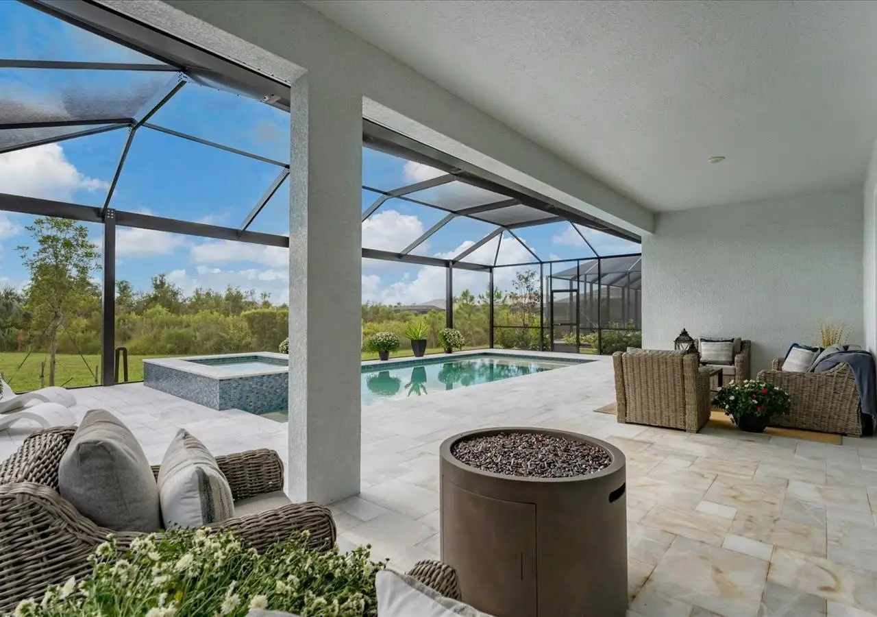 Travertine tile lanai with natural preserve backdrop