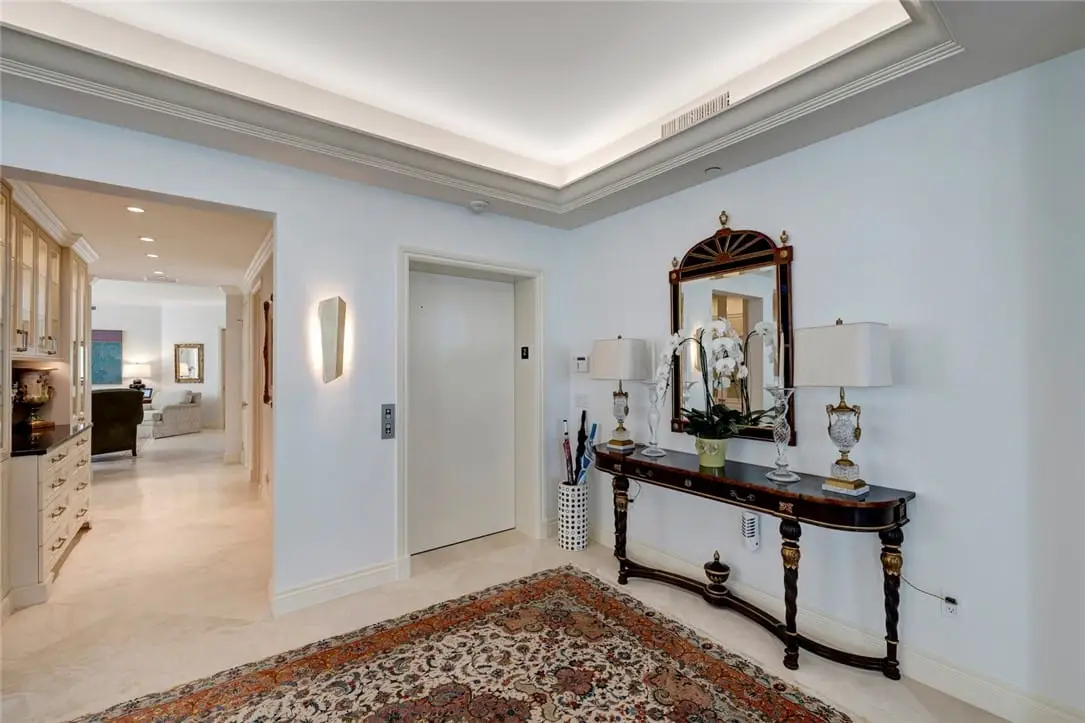 Experience luxury coastal living in this beautifully remodeled direct oceanfront residence. A private elevator opens to breathtaking ocean views that grace the living, dining, kitchen & primary suite. Enjoy a gas fireplace, family rm & chef's island kitchen w/top-of-the-line appliances. The primary suite w/his-and-her walk-in custom closets & spa-inspired baths. 1,400 sq. ft. of covered balconies w/private walking access to the beach, impact glass, 2 car air-conditioned garage. Resort-style amenities, including 24-hour security, a clubhouse, fitness room, heated pool, spa & private beach access.