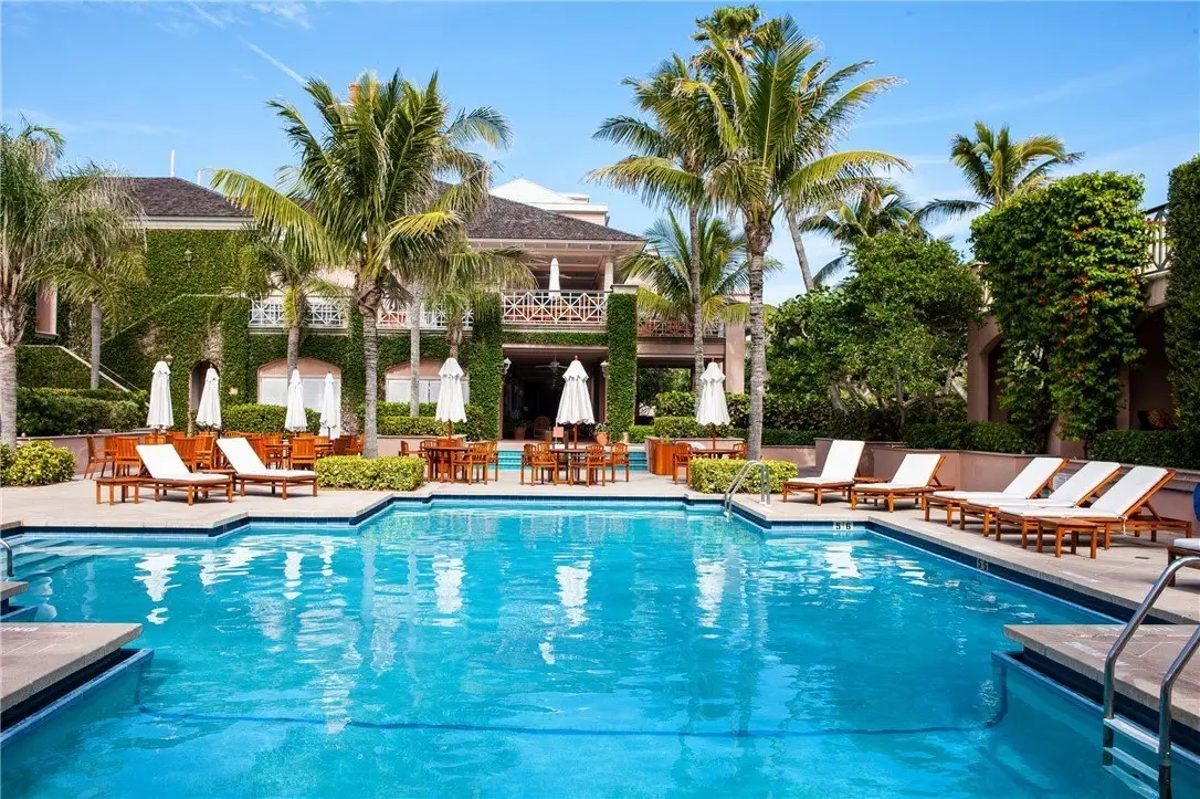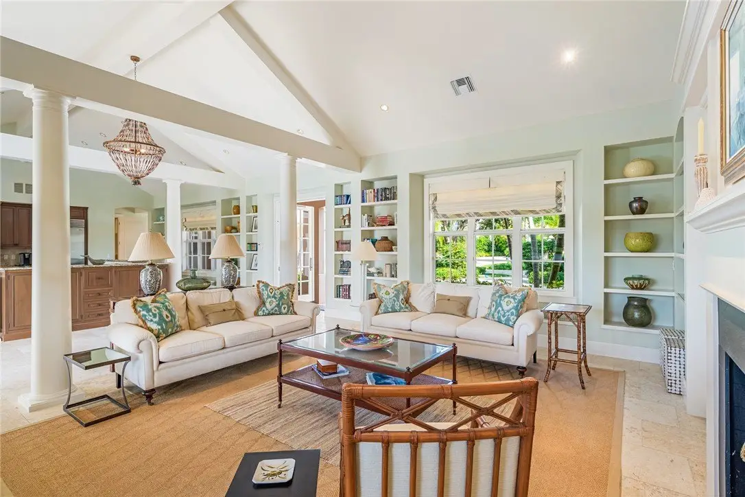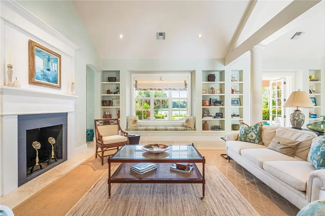 Designed by renowned architect Peter Moor, charming one of a kind 3br/3.5ba golf estate. Custom details include dramatic vaulted ceilings, fireplace, stone flooring, expansive primary suite with luxurious bath and dual walk-in closets. Open great room plan with built-ins, grand eat-in island kitchen. Covered lanai overlooks the large lap pool and lush yard, all situated on one of Orchid Island's best estate size lots with beautiful lake and golf course views. Garaging for 3 cars plus golf cart. Room sizes approximate.