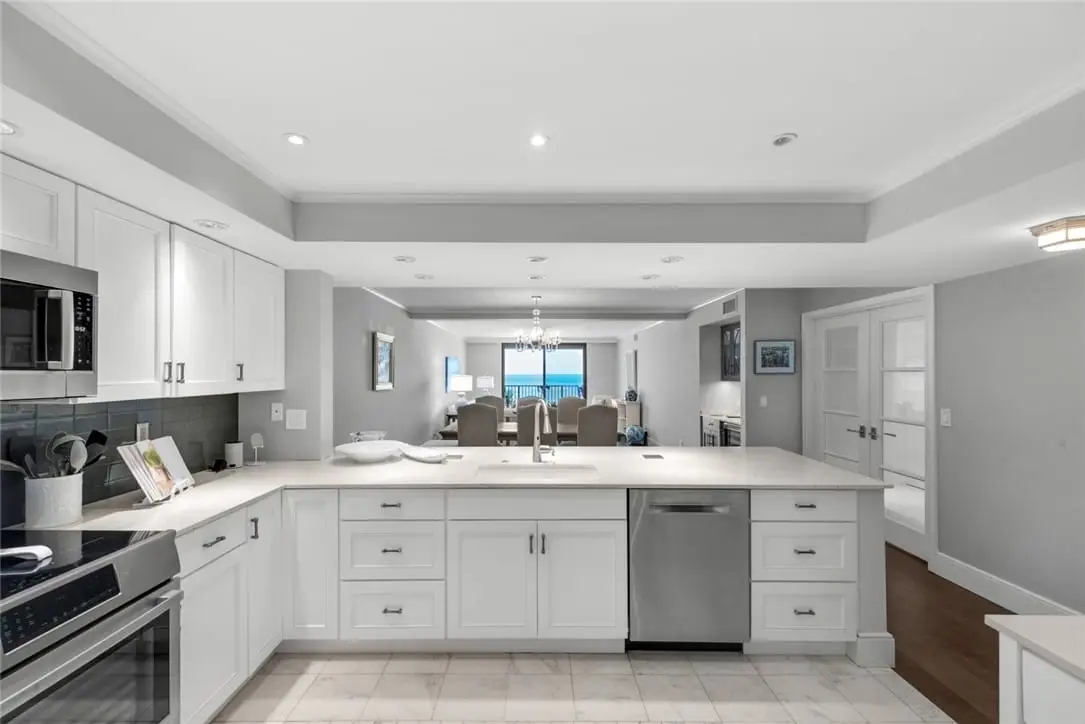 Experience the epitome of luxury with this oceanfront condo! Elegantly designed throughout. The modern kitchen features bright cabinetry, Quartz counters, marble floors & stylish recessed lighting. A bar area with a marble counter & wine cooler. The primary bedroom offers stunning ocean views & access to a oceanfront balcony. Den/office off guest suite. Step out onto the covered balcony & soak in the breathtaking ocean views completing the ultimate coastal living experience. A/C 2023. Amenities include a private fishing pier, pool, game room & exercise room. Sizes approximate/subject to error.