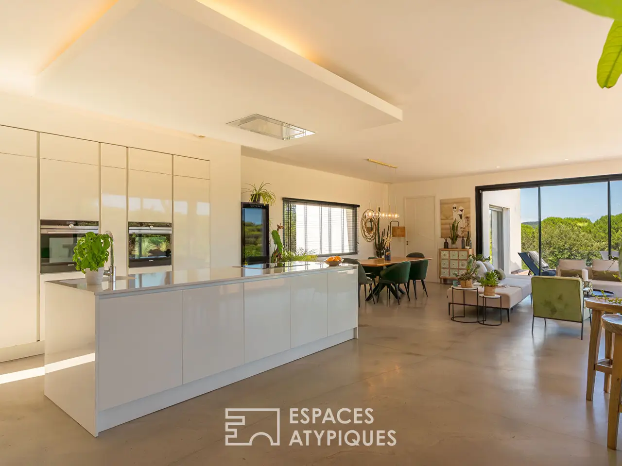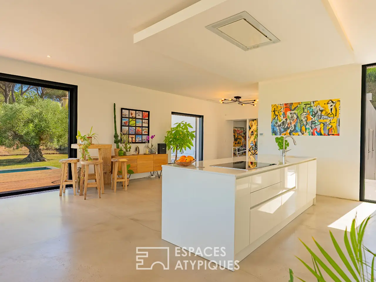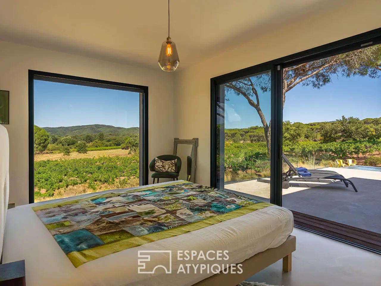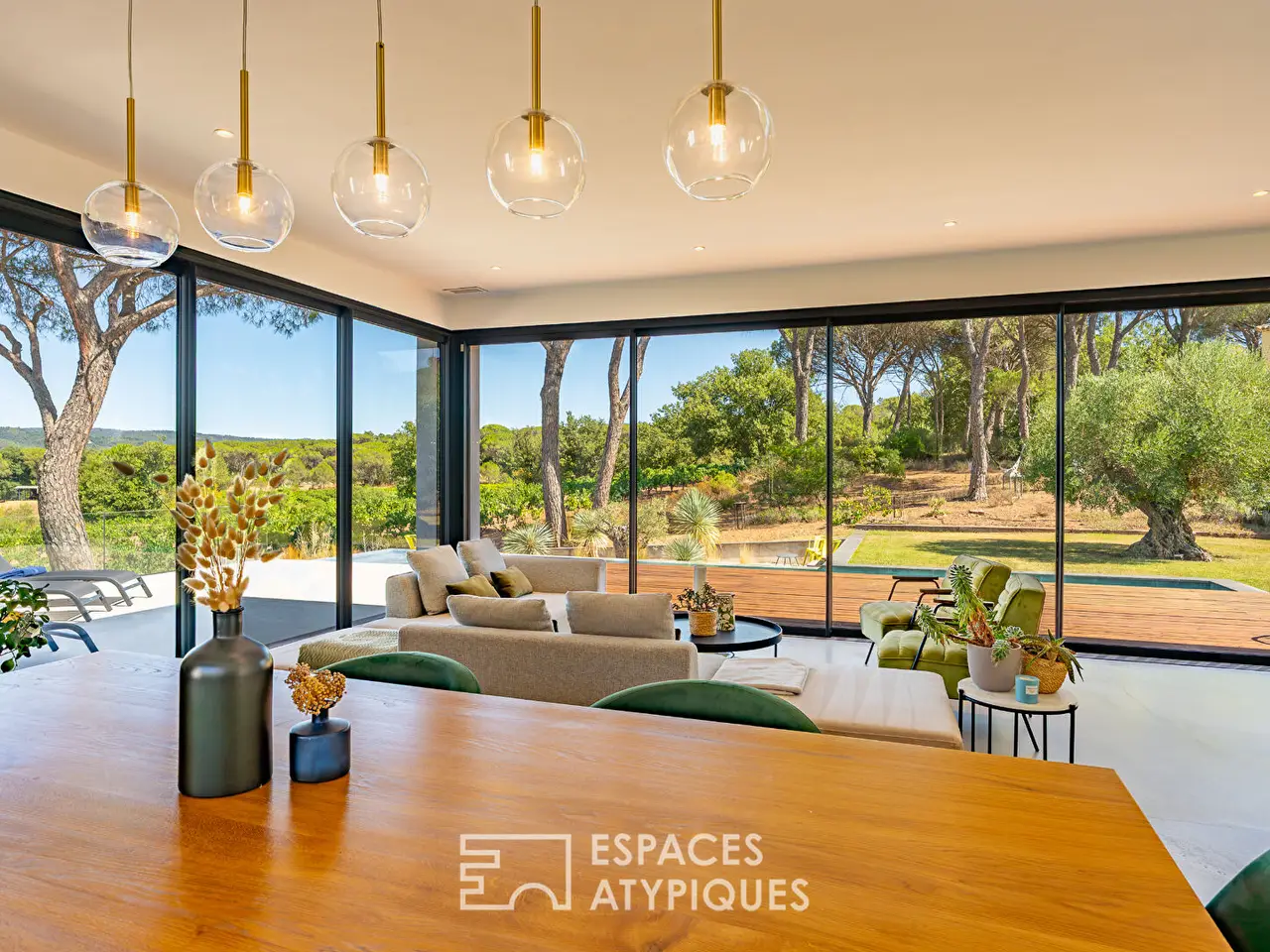Architect-designed villa in the heart of the vineyards - In the heart of a privileged residential environment, this contemporary architect-designed villa of approximately 180 sqm stands on a vast plot of over 2,600 sqm. In a peaceful setting, it offers an exceptional living environment in the vineyards, with a heated infinity pool and several furnished terraces, inviting relaxation and conviviality with views of the Massif des Maures. The interior design is distinguished by an optimized layout and generous volumes. The main living room of over 75 sqm, bathed in natural light thanks to large bay windows, opens onto the exterior. It offers an elegant living room, a spacious dining room, and a fully equipped open kitchen with a central island. The high-end materials, clean lines, and careful decoration contribute to creating an atmosphere of serenity and modernity. In the extension, a relaxation area with a television lounge and billiards table promises convivial moments. The sleeping area consists of two bedrooms, each with a private bathroom, as well as a spacious master suite with a dressing room. A separate 50sqm apartment with its own outdoor space, consisting of a living room-kitchen, a bedroom, and a bathroom, is a real asset for entertaining friends or family, or for rental income. Outside, the landscaped garden is a true invitation to well-being. The infinity pool surrounded by a wide wooden deck and several lounge areas is the focal point of this villa. The Mediterranean vegetation brings freshness and privacy, creating a true haven of peace. A 50m3 pool house, a double garage, and a laundry room complete the features of this property. Close to all amenities, yet sheltered from view, this property is a prestigious residence rare on the market. This architect-designed villa embodies the perfect blend of design, functionality, and elegance. Its unique architecture and high-end services make it an exceptional property, a prime address for a life combining luxury and comfort. ENERGY CLASS: A (57 kWh/m2/year) / CLIMATE CLASS: A (1 kg CO2/m2/year). Estimated annual energy expenditure for standard use between EUR1,070 and EUR1,520 indexed to the years 2021, 2022 and 2023 (subscription included)REF. 12243Additional information* 7 rooms* 4 bedrooms* 4 shower rooms* 1 floor in the building* Outdoor space : 2635 SQM* Parking : 4 parking spaces* Property tax : 3 575 €Energy Performance CertificatePrimary energy consumptiona : 57 kWh/m2.yearHigh performance housing*57kWh/m2.year1*kg CO2/m2.yearA*B*C*D*E*F*GExtremely poor housing performance* Of which greenhouse gas emissionsa : 1 kg CO2/m2.yearLow CO2 emissions*1kg CO2/m2.yearA*B*C*D*E*F*GVery high CO2 emissionsEstimated average annual energy costs for standard use, indexed to specific years 2021, 2022, 2023 : between 1070 € and 1520 € Subscription IncludedAgency feesThe fees include VAT and are payable by the vendorMediatorMediation Franchise-Consommateurswww.mediation-franchise.com29 Boulevard de Courcelles 75008 ParisInformation on the risks to which this property is exposed is available on the Geohazards website : www.georisques.gouv.fr