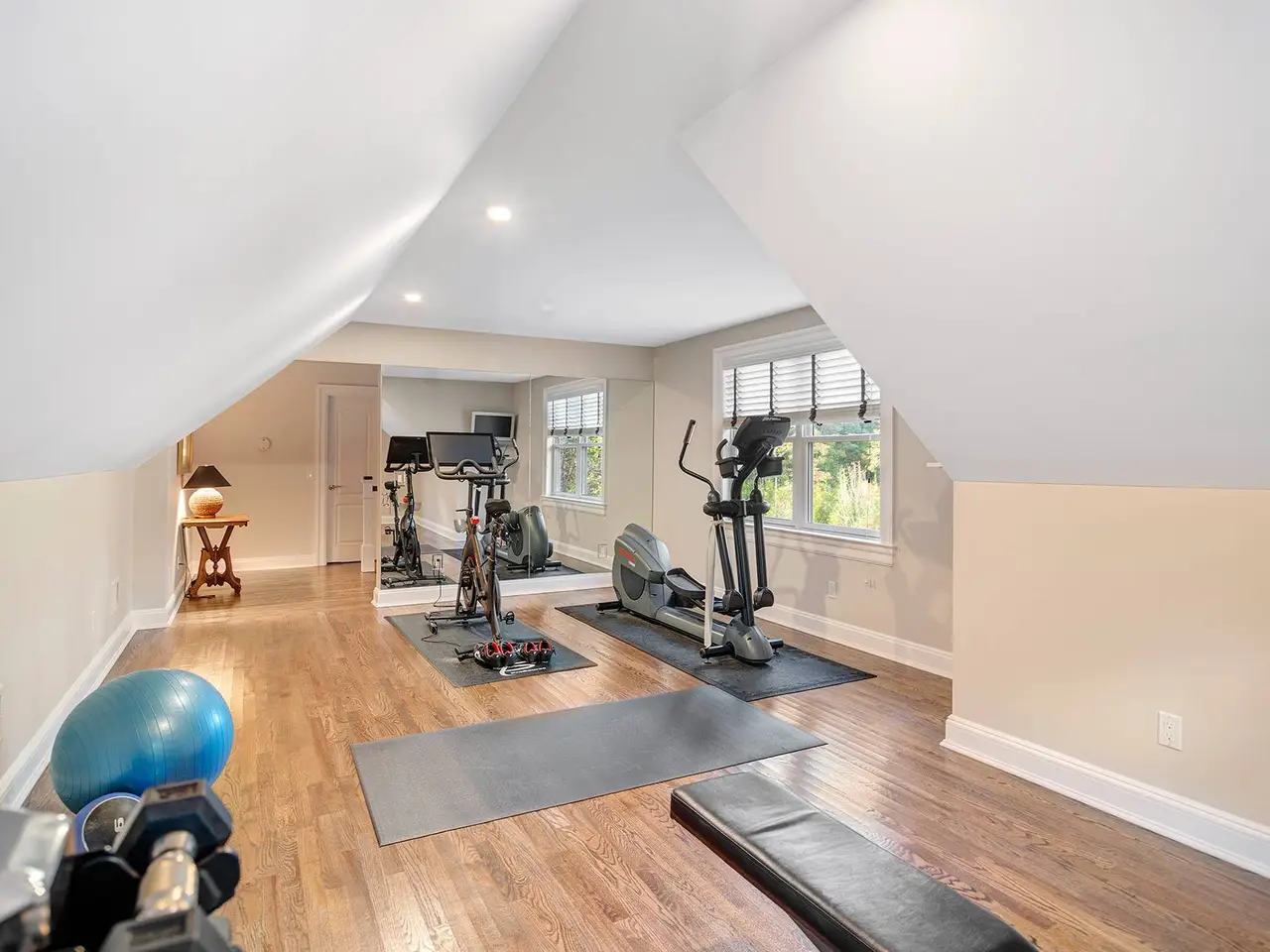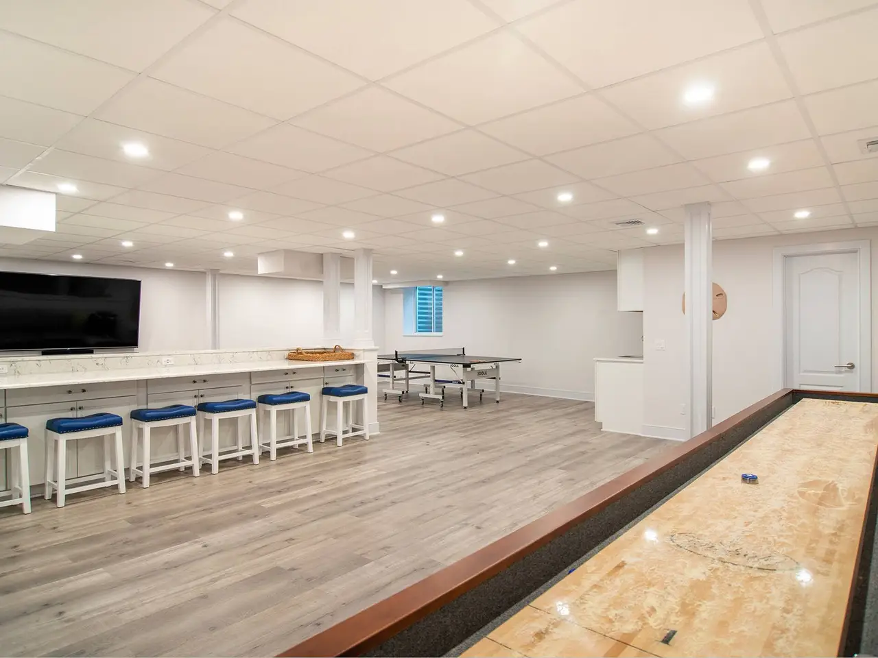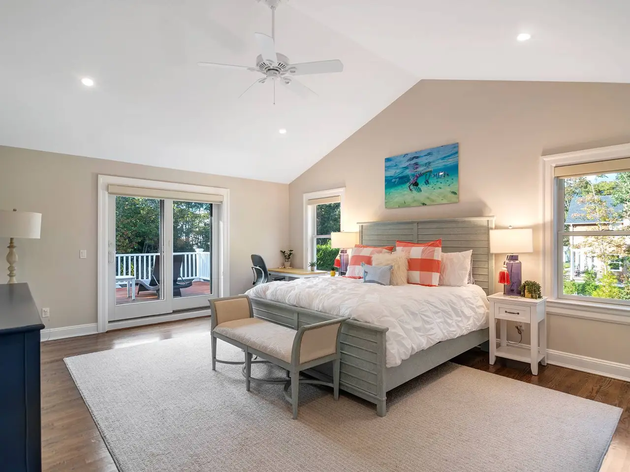 Located on a private 1.2+/- acre in Quogue Village, this 4662 sq. ft. Post Modern home greets you with a grand 2-story entryway that leads to a great room with a vaulted ceiling, wood-burning fireplace and built-in bookshelves and cabinetry. A wall of sliders brings in lots of light and opens to the expansive mahogany deck, heated gunite pool and Har-tru tennis court. The open floor plan includes a formal dining room, and a chef's kitchen with top of the line appliances, Caesarstone countertops, wine refrigerator, and an oversized center island. The breakfast area opens to the screened porch that overlooks onto the backyard. The first floor primary suite includes a gas fireplace, two walk-in closets and a newly renovated spa bath with separate shower and a soaking tub. Upstairs there are three additional en suite guest bedrooms and a junior primary suite with its own private deck. In addition, there is a gym with a Peloton bike, elliptical machine and free weights. The newly finished basement includes a full bath and a game room with a ping pong table, shuffleboard table, and a wet bar. Access to the Quogue Village Beach completes the perfect summer vacation home. Listing ID #738013