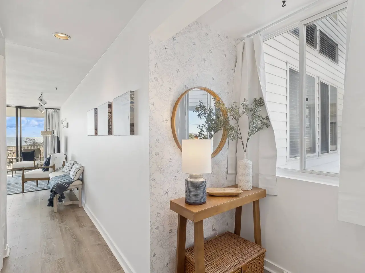 Open sun-lit living room, dining room, and kitchen