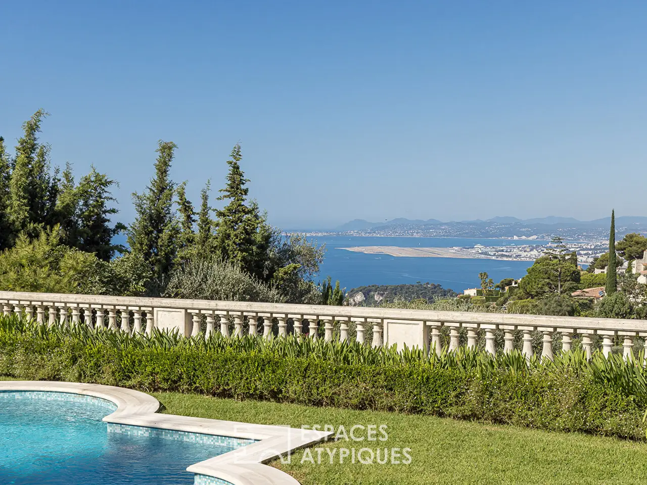 Perched in an idyllic setting, this sumptuous property with Palladian architecture exudes all the charm of a Mediterranean lifestyle. It is set in the heart of a landscaped park of approximately 2,300 sqm, a true haven of serenity where nature expresses itself in complete freedom. Bathed in light, this luxury villa offers 402 sqm of elegant interiors, designed to combine refinement, comfort, and generous volumes. From the ground floor, the 80 sqm living spaces open harmoniously onto the exterior. A large, bright living room, a cozy dining room with a fireplace, and a fully equipped kitchen naturally extend to a large terrace offering unobstructed sea views. Upstairs, five spacious bedrooms, some with direct access to the panoramic terrace, are served by four elegantly appointed bathrooms, combining modern comfort and quality materials. The lower level houses a vast 203sqm garage that can accommodate 6 to 8 vehicles, as well as a separate studio, ideal for guests or staff, and an office. This space can also be transformed into a reception room to host private events in an exclusive setting. High-end amenities enhance this residence: an elevator serving all levels, reversible air conditioning, a sophisticated alarm system, video surveillance, and a heated swimming pool inviting you to relax all year round. ENERGY CLASS: B / CLIMATE CLASS: A Estimated average annual energy expenditure for standard use, based on prices for the years 2021, 2022, 2023, is between EUR1,840 and EUR2,550. Information on the risks to which this property is exposed is available on the Georisques website: www.georisques.gouv.fr REF. 11971 Additional information * 7 rooms * 5 bedrooms * 5 bathrooms * 2 floors in the building * Outdoor space : 2311 SQM * Parking : 8 parking spaces Energy Performance Certificate Primary energy consumption b : 70 kWh/m2.year High performance housing