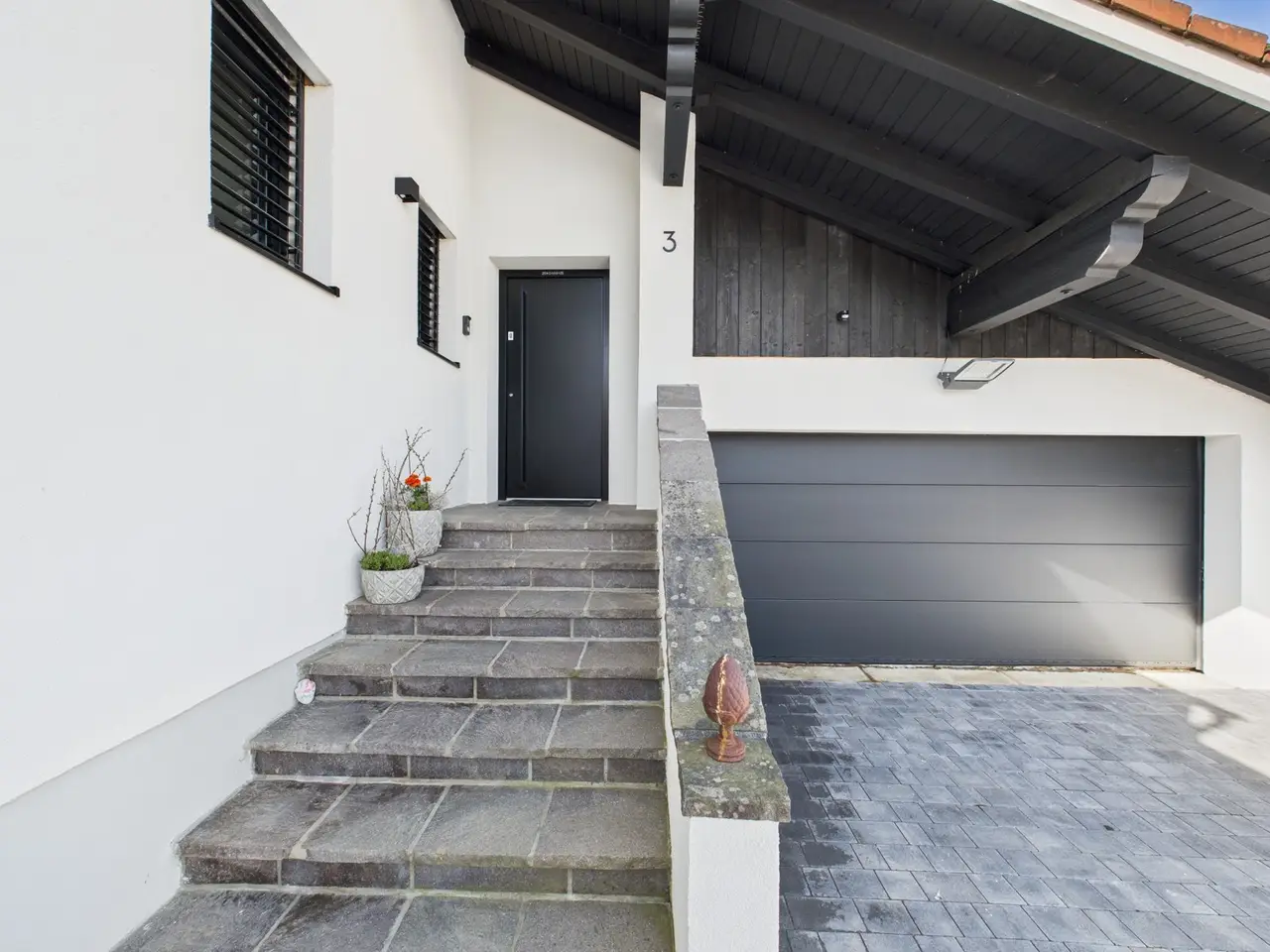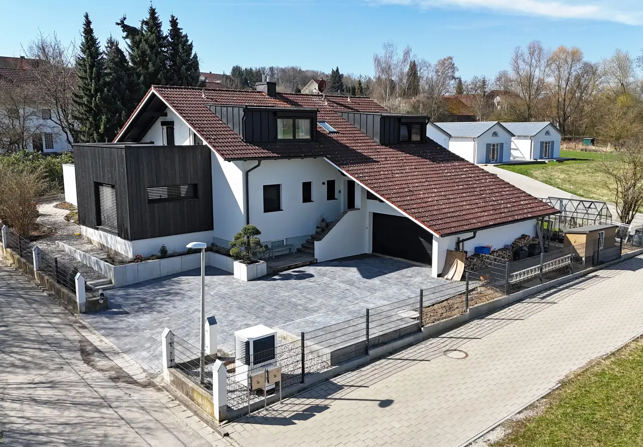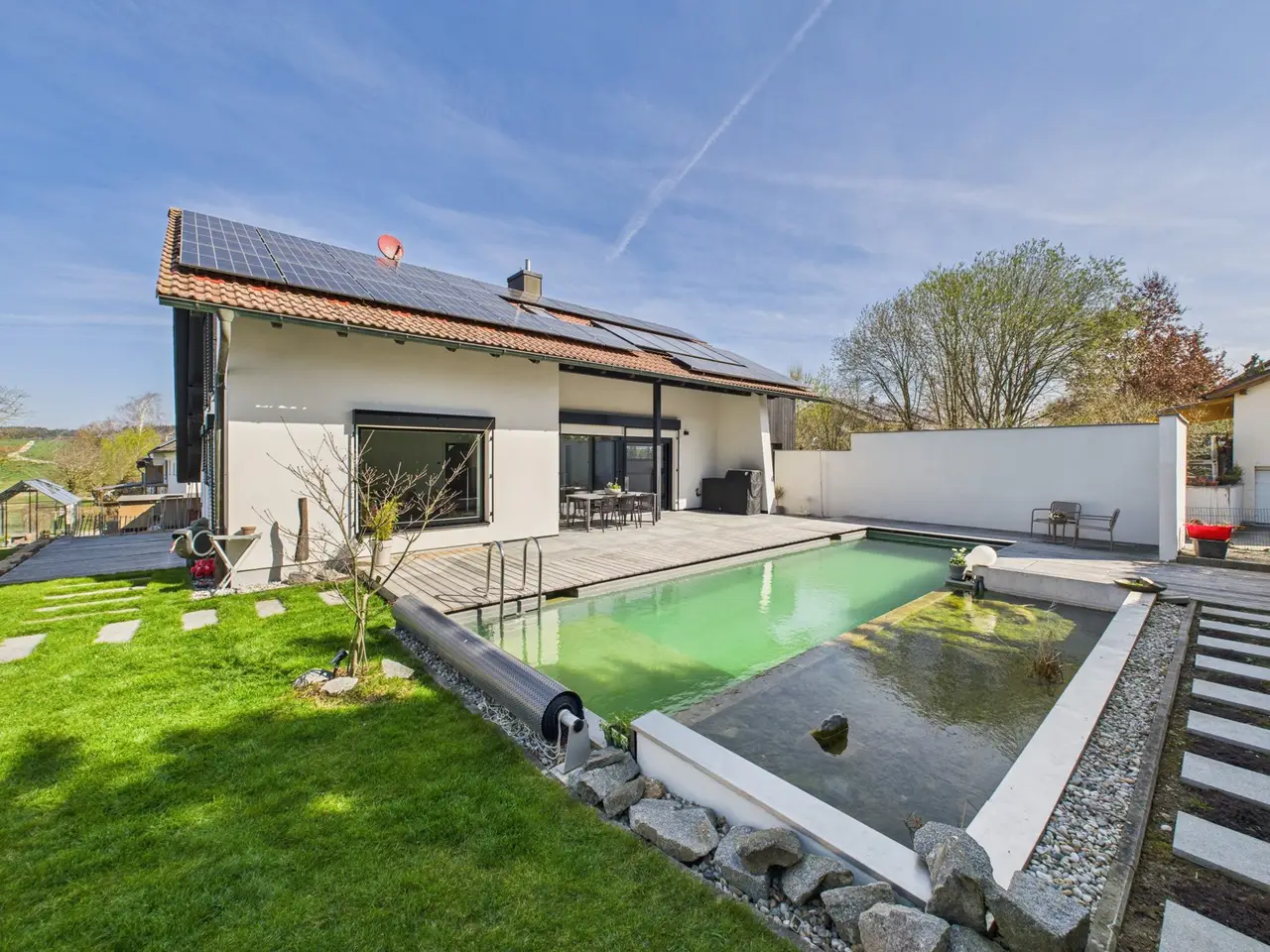 A place that provides a sense of security, radiates clarity and offers space for new stories: This high-quality renovated detached house in Vilsheim / Langenvils combines rural idyll with modern living culture. Nestled in the tranquil natural surroundings of the Vils valley, yet close to the city, this home has a very special aura - harmonious, stylish and authentic. The property was extensively and sensitively renovated in 2021/22. The approx. 209 m² living space comprises six spacious rooms that impress with their open floor plans, natural lighting and clear design language. Fine materials and harmonious color schemes create a warm, inviting atmosphere. The custom-made kitchen by a carpenter with modern appliances and high-quality surfaces is not only a functional focal point, but also a meeting place. Floor-to-ceiling windows seamlessly connect the interior with the exterior - here, life opens up to the garden, to nature, to light. The plot of around 839 m² has been lovingly landscaped: A spacious terrace with fine natural stone, a near-natural swimming pond with wooden deck, outdoor shower and an automatic irrigation system make the outdoor area an oasis of relaxation. The house is also technically impressive with a modern, energy-efficient concept - including photovoltaics, solar support and intelligent control. High-quality windows, smart shading and harmonious fixtures underline the high standards. A well thought-out floor plan, a stylish bathroom with laundry chute, custom-made wardrobes, exposed screed and many other lovely details round off the overall picture. Three outdoor parking spaces and a garage offer ample space for vehicles. The quiet location on the outskirts promises privacy! This house is more than just four walls. It is a way of life. A home that radiates warmth, gives freedom and leaves room for the essentials.