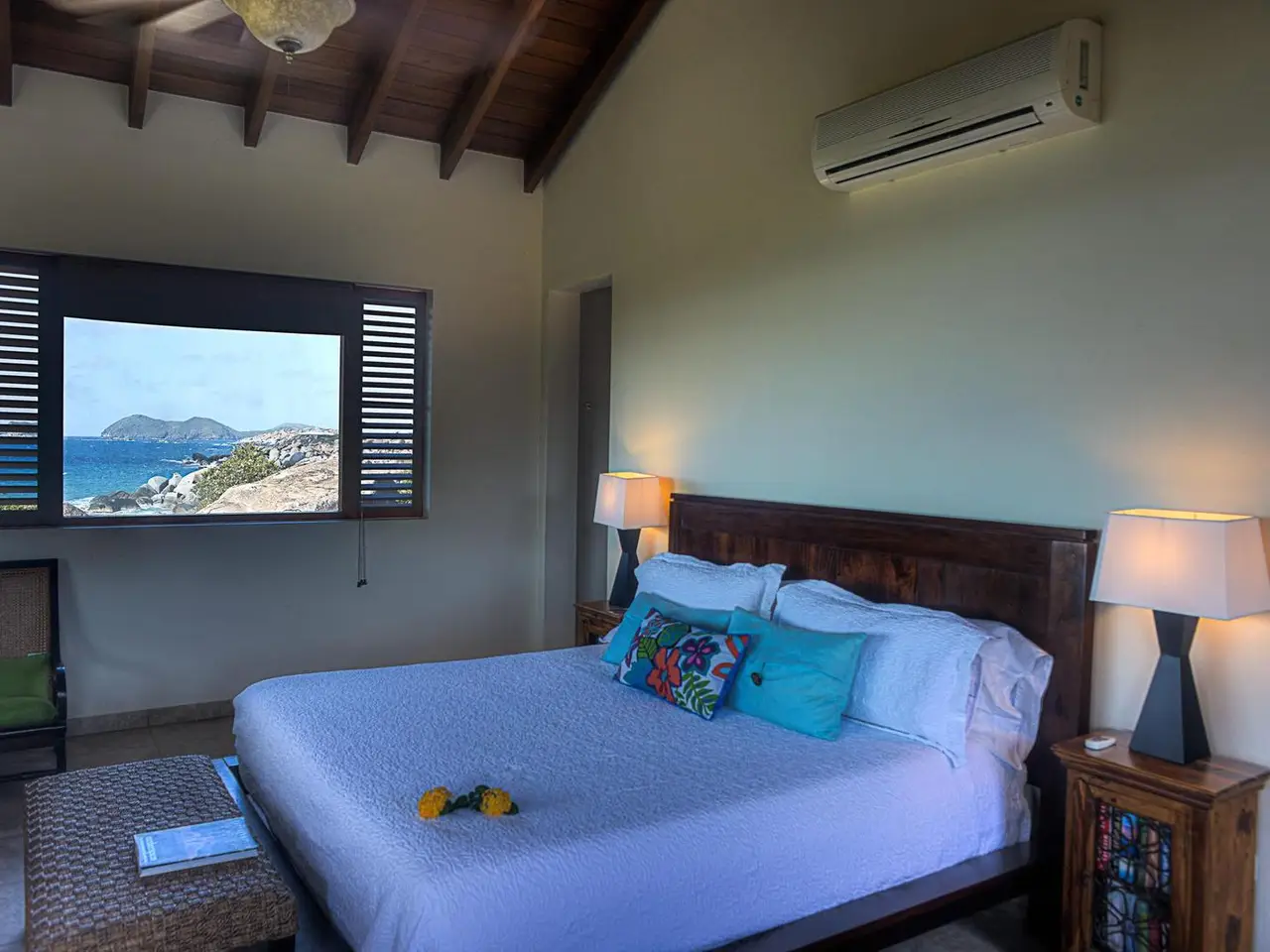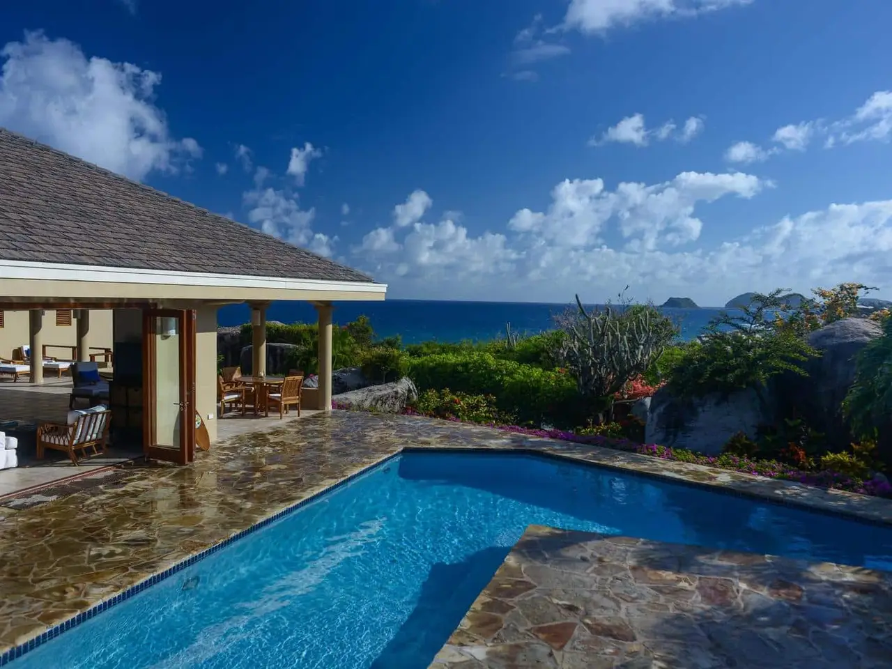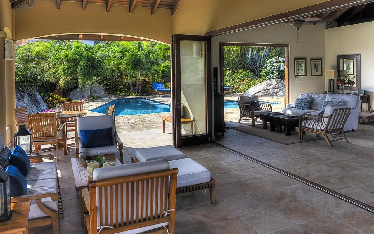 <iframe src="https://my.matterport.com/show/?m=CYJ1ds1XgV6" width="853" height="480" frameborder="0" allowfullscreen="allowfullscreen"></iframe><br /> <br /> <iframe src="https://my.matterport.com/show/?m=hQyUWGdqvtw" width="853" height="480" frameborder="0" allowfullscreen="allowfullscreen"></iframe><br /> <br /> ‘Calypso Villa’ is one of Virgin Gorda’s finest luxury villas; fully renovated in 2018. Quietly nestled among magnificent boulders and beautiful vegetation, the property is very private and welcoming. Built on a large land lot, the property is very private and peaceful.<br /> <br /> The house was designed and situated on the property to take advantage of prevailing trade winds and to maximize the panoramic views of the Caribbean Sea. Calypso’s thoughtful design provides numerous shaded porches where guests can escape the mid-day heat as well as a sun drenched pool deck that is the ideal spot for fun in the sun.<br /> <br /> Calypso’s living spaces feature walls of folding glass doors that allow for the very best in Caribbean indoor-outdoor living. Calypso’s outdoor spaces feature high quality teak furniture with plenty of seating options. As you soak up the sun or relax in the shade you will be surrounded by the villa’s mature tropical gardens filled with flowers, cacti, and fruit trees. A few hours spent chilling in Calypso’s pool is the perfect way to take in all this incredible property has to offer.<br /> <br /> Calypso Villa has a fully equipped chef’s kitchen with granite countertops and stainless steel appliances. You can also enjoy gas and charcoal BBQ grills on the pool deck. This house is particularly well equipped and as a result makes for a truly comfortable vacation experience.<br /> <br /> Calypso Villa is a 3-bedroom, 3½ bathroom house featuring large interiors and expansive outdoor decks and patios.<br /> Each bedroom has it’s own private bathroom and outdoor spaces feature high quality teak furniture with plenty of seating options.<br /> <br /> This house is great for sharing because each bedroom is like a master suite. Two of the bedrooms feature king-sized mattresses and two of the bathrooms have additional outdoor showers. The third bedroom has two queen-sized beds. This configuration offers lots of flexibility for families with children. All of the bedrooms are equipped with air conditioning and have flat panel televisions.<br /> <br /> Calypso Villa is a fenced and gated property located in the exclusive residential neighborhood of Crooks Bay near the Baths in Virgin Gorda. The house is a short walk to the beach at Crook’s Bay. This villa is ideally located within a 5 minutes drive from a dozen restaurants, the Virgin Gorda Yacht Harbor, all of the island’s grocery stores, and a ½ dozen world-class beaches including The Baths, Spring Bay, and Little Trunk Bay. The location is ideal for enjoying the very best of Virgin Gorda. We know you will love it at Calypso Villa!!
