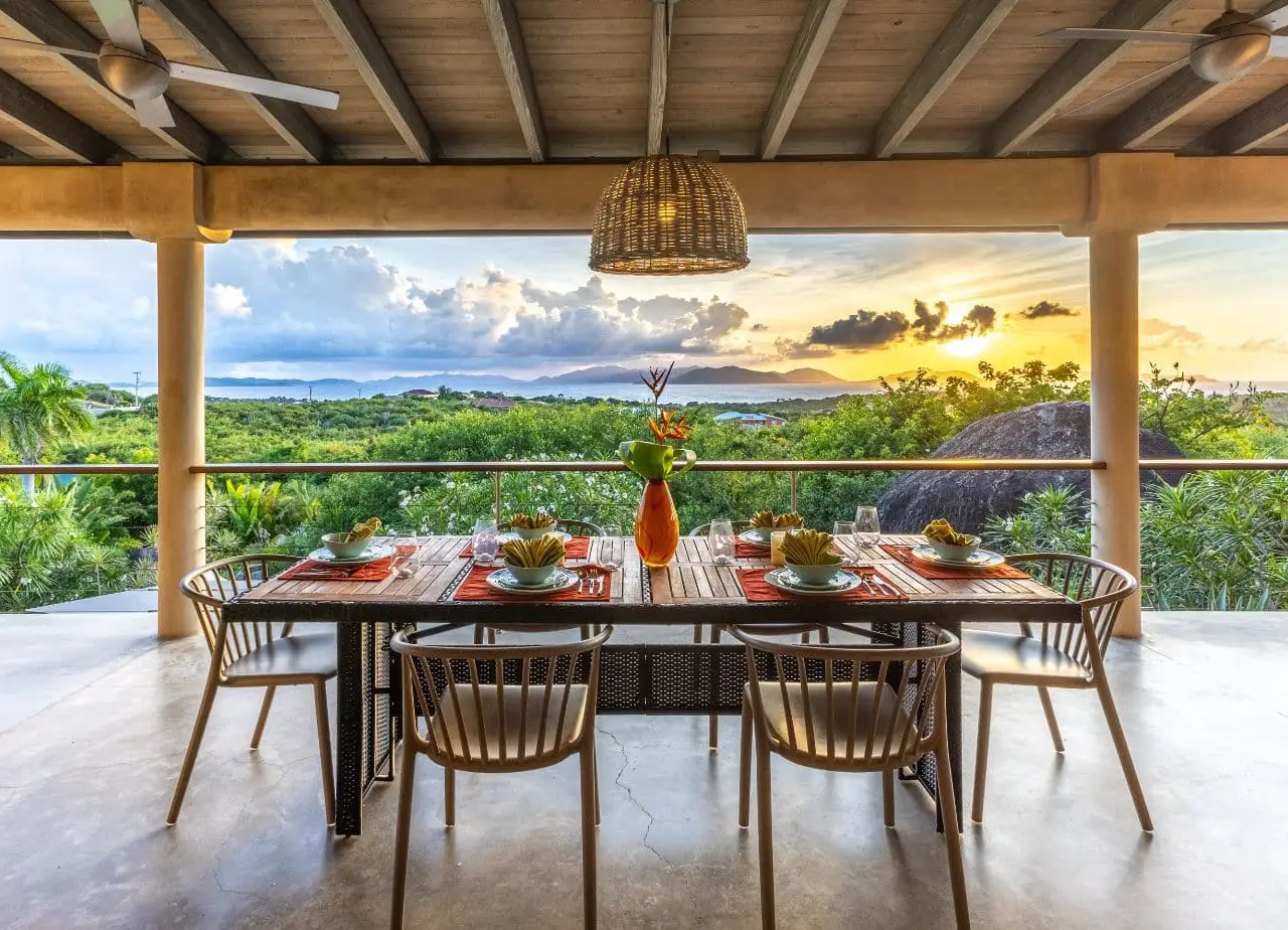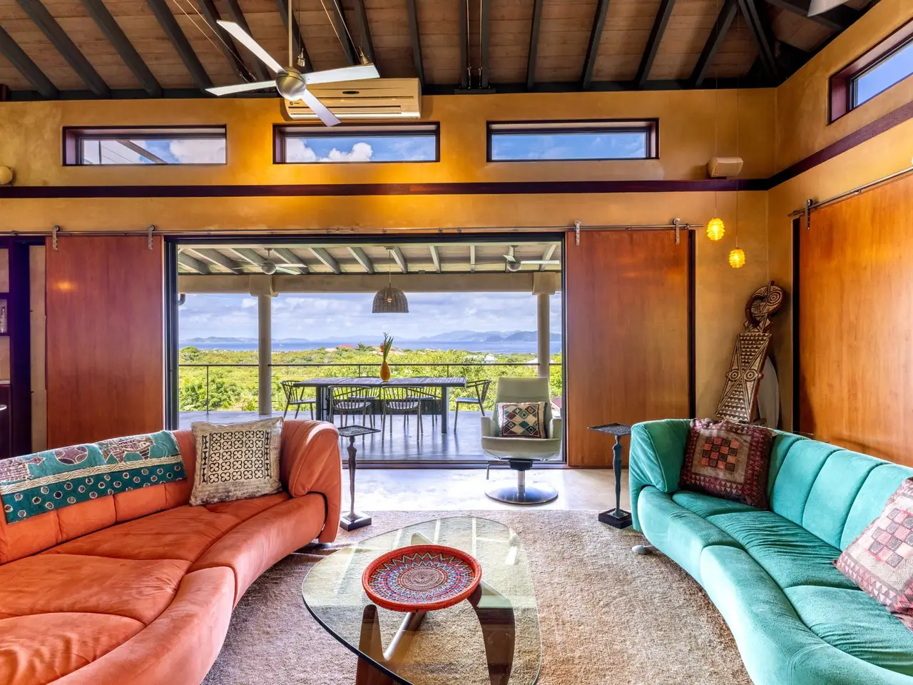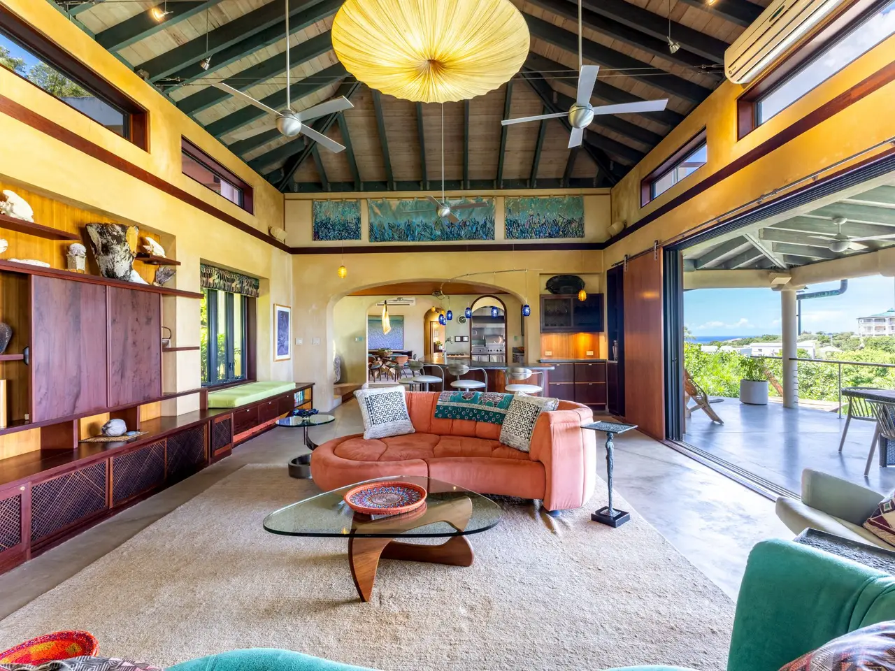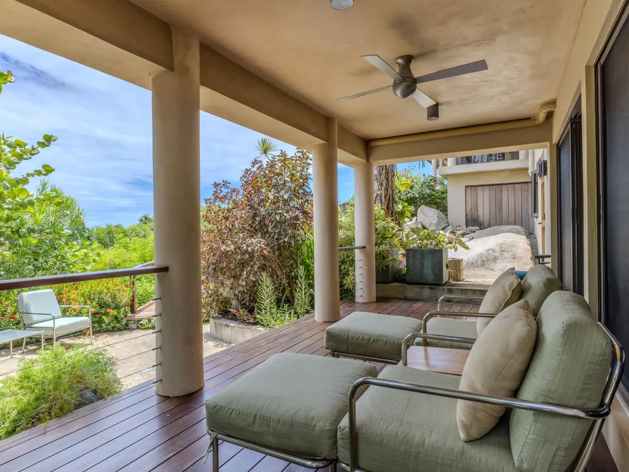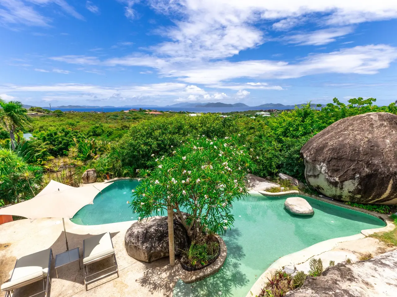 Symbio Villa exists in perfect symbiotic harmony with the natural elements of Virgin Gorda. Rich exotic timbers, lush tropical trees, vast ocean views, gigantic boulders, and gorgeous sunsets create the splendour of this beautiful home. Symbio is minutes away from pristine white beaches, The Baths and the historic Coppermine. It is set within Princess Quarters, a private estate less than a five minutes’ drive to the airstrip, yacht harbour and ferry terminal. Symbio, built with three levels, has a sunny salt-water swimming pool surrounded by tropical palms and flowering plants. On the entry level is the sophisticated Great Room that unites modern elegance and traditional Caribbean charm. Elegant dining and entertainment areas, a fully equipped kitchen with Viking appliances, and a secondary screened-in grill kitchen are on the main level. Wide open verandas, with clusters of couches surround this main level. Also on the entry level is an ensuite bedroom with open-air shower, and a covered patio, furnished for privacy and relaxation. Occupying the entire upper level of this Virgin Gorda villa is the luxurious master suite. With an open floor plan, the king bedroom flows seamlessly into the spacious bath with alfresco shower. A secluded lounge area with views of the neighbouring islands makes this suite private and inviting. On the lowest level of the villa is the third bedroom. Strolling across the arched wooden bridge, and the sheltered porch is this beautiful bedroom with a sunken bathroom done in a nautical theme. Symbio Villa is an exclusive retreat perfect for the discerning buyer seeking a private oasis in one of the world’s most desirable vacation destinations. Additional Details: Electricity-Generator: Main power is provided by BVI Electricity Corporation. Back-up power provided by 45KW Propane Generator. Air Condition: The three bedrooms and Great Room have air-conditioning and are each controlled separately. Landscaping: Professionally designed and landscaped with a multi-zone drip irrigation system provides generously for gardens. Water Supply: Government mains and cistern (approximately 15,800 gallons.