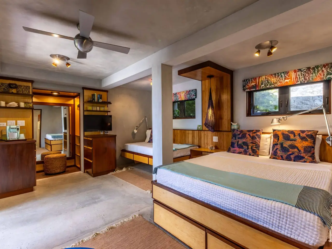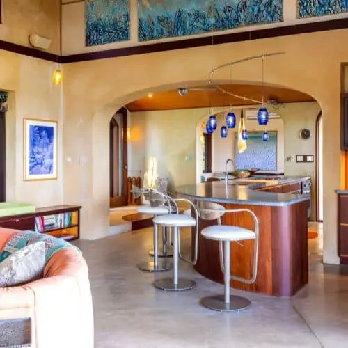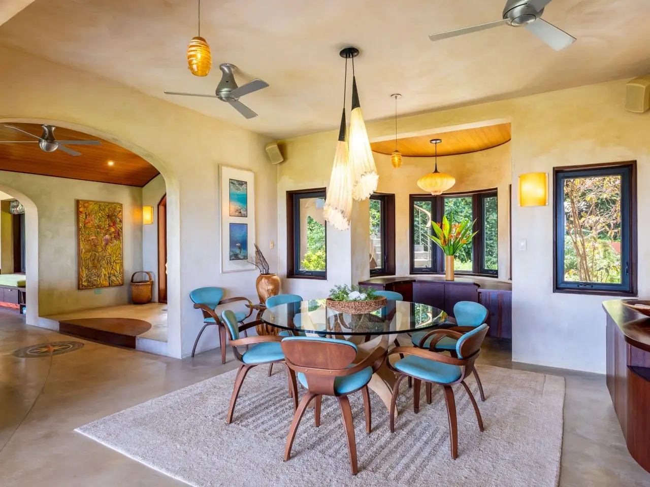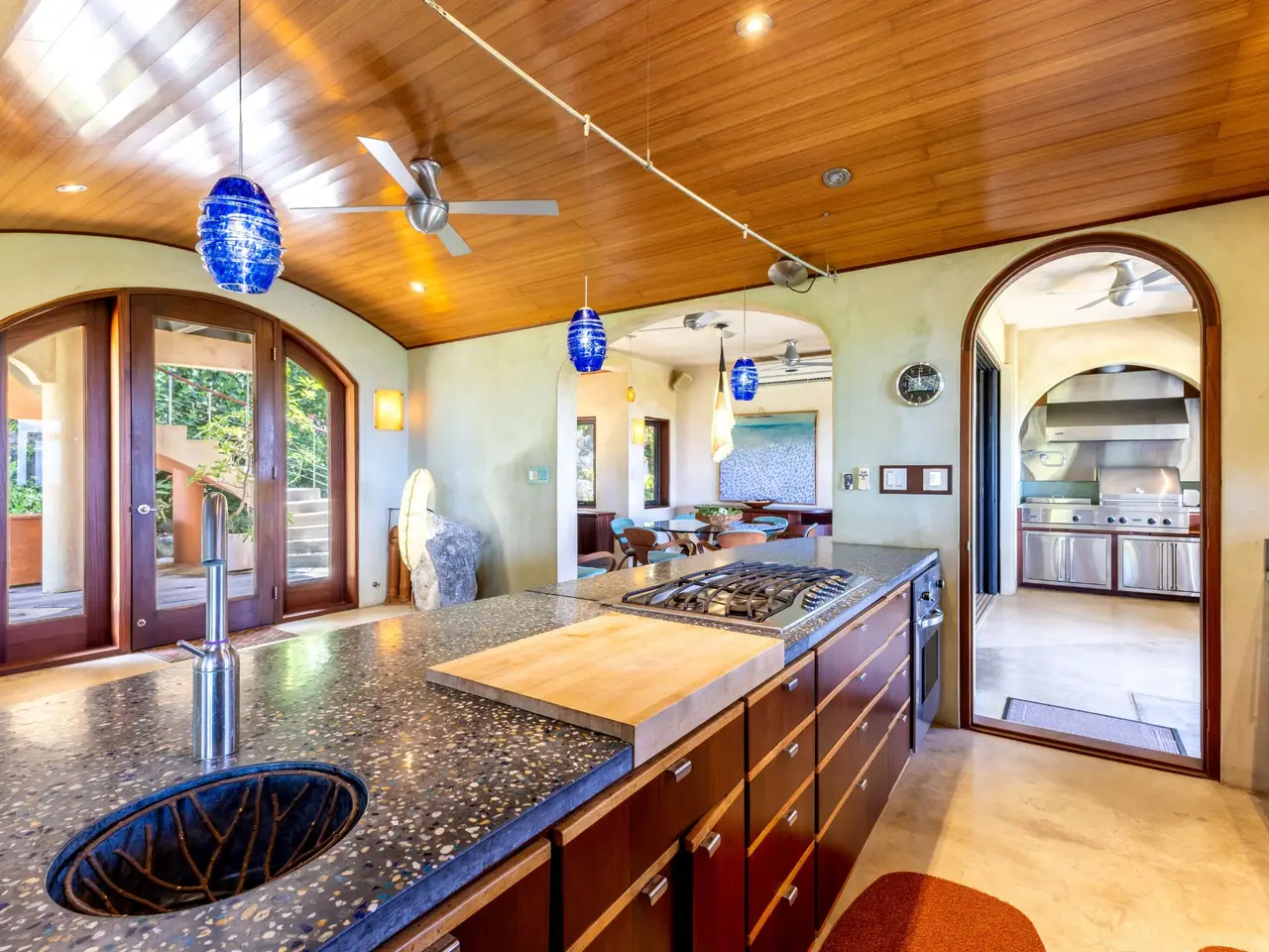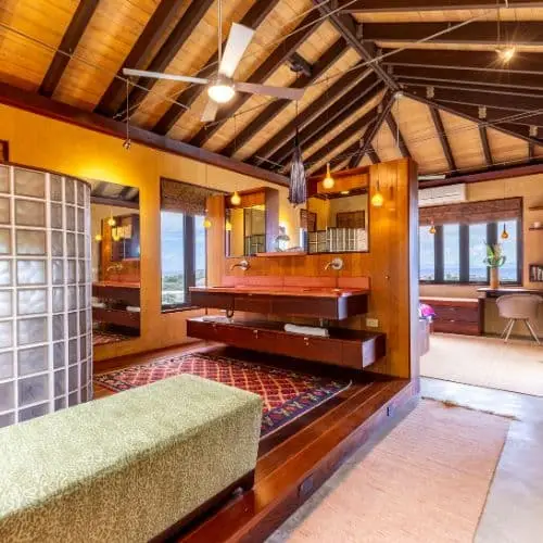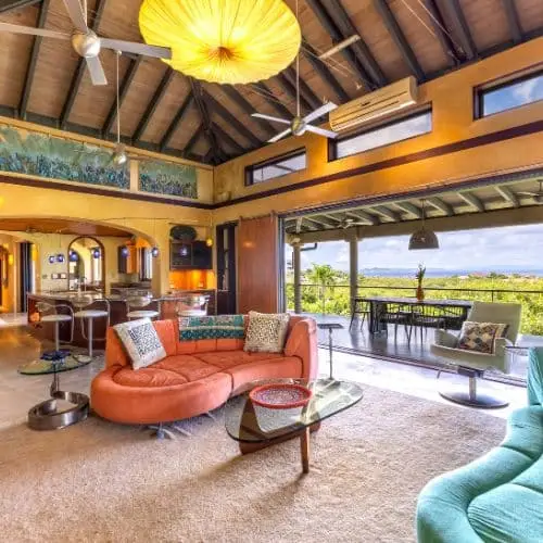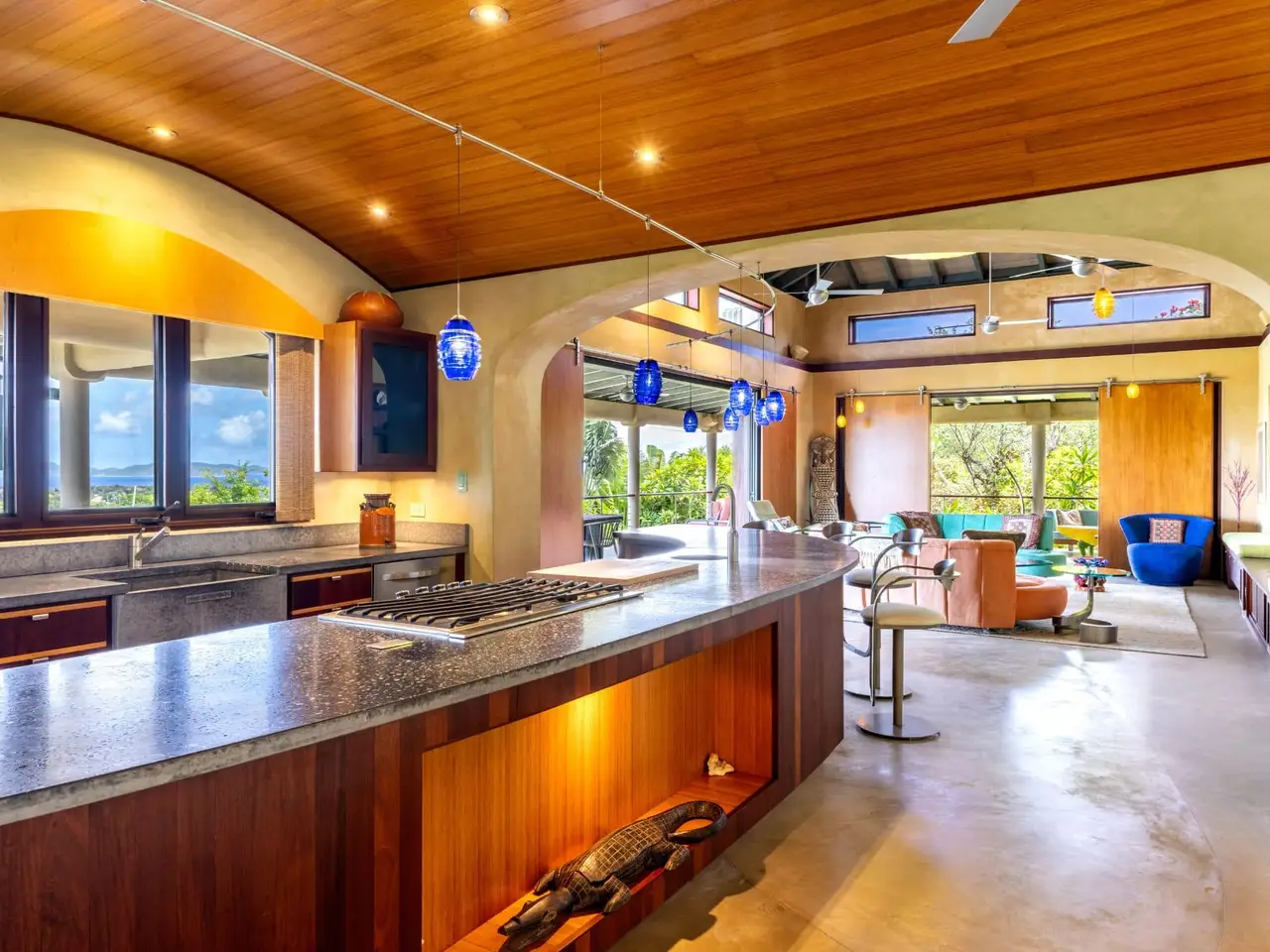 Symbio Villa exists in perfect symbiotic harmony with the natural elements of Virgin Gorda. Rich exotic timbers, lush tropical trees, vast ocean views, gigantic boulders, and gorgeous sunsets create the splendour of this beautiful home. Symbio is minutes away from pristine white beaches, The Baths and the historic Coppermine. It is set within Princess Quarters, a private estate less than a five minutes’ drive to the airstrip, yacht harbour and ferry terminal. Symbio, built with three levels, has a sunny salt-water swimming pool surrounded by tropical palms and flowering plants. On the entry level is the sophisticated Great Room that unites modern elegance and traditional Caribbean charm. Elegant dining and entertainment areas, a fully equipped kitchen with Viking appliances, and a secondary screened-in grill kitchen are on the main level. Wide open verandas, with clusters of couches surround this main level. Also on the entry level is an ensuite bedroom with open-air shower, and a covered patio, furnished for privacy and relaxation. Occupying the entire upper level of this Virgin Gorda villa is the luxurious master suite. With an open floor plan, the king bedroom flows seamlessly into the spacious bath with alfresco shower. A secluded lounge area with views of the neighbouring islands makes this suite private and inviting. On the lowest level of the villa is the third bedroom. Strolling across the arched wooden bridge, and the sheltered porch is this beautiful bedroom with a sunken bathroom done in a nautical theme. Symbio Villa is an exclusive retreat perfect for the discerning buyer seeking a private oasis in one of the world’s most desirable vacation destinations. Additional Details: Electricity-Generator: Main power is provided by BVI Electricity Corporation. Back-up power provided by 45KW Propane Generator. Air Condition: The three bedrooms and Great Room have air-conditioning and are each controlled separately. Landscaping: Professionally designed and landscaped with a multi-zone drip irrigation system provides generously for gardens. Water Supply: Government mains and cistern (approximately 15,800 gallons.