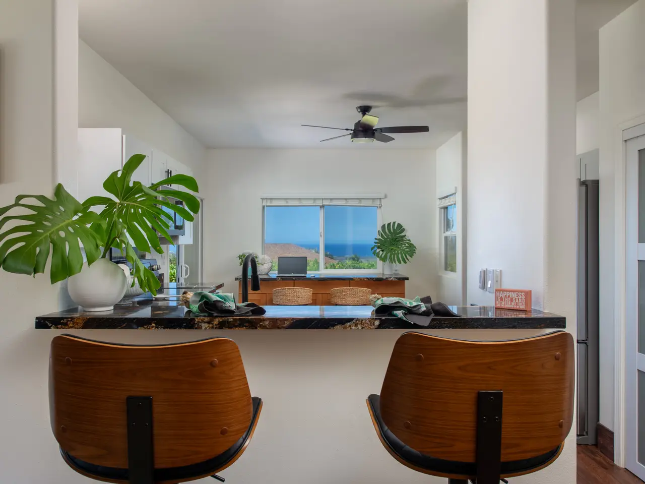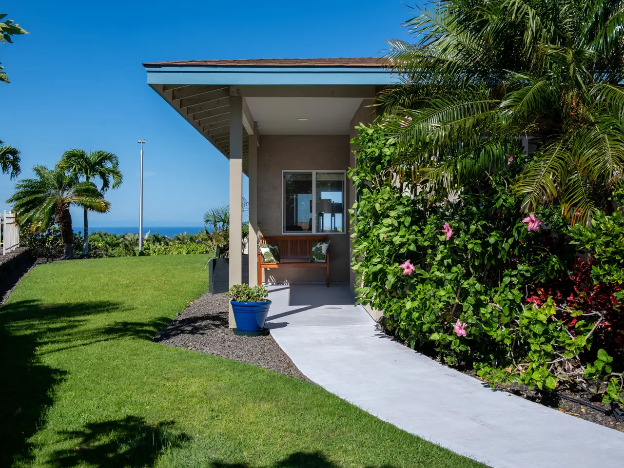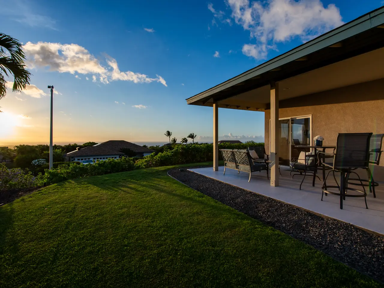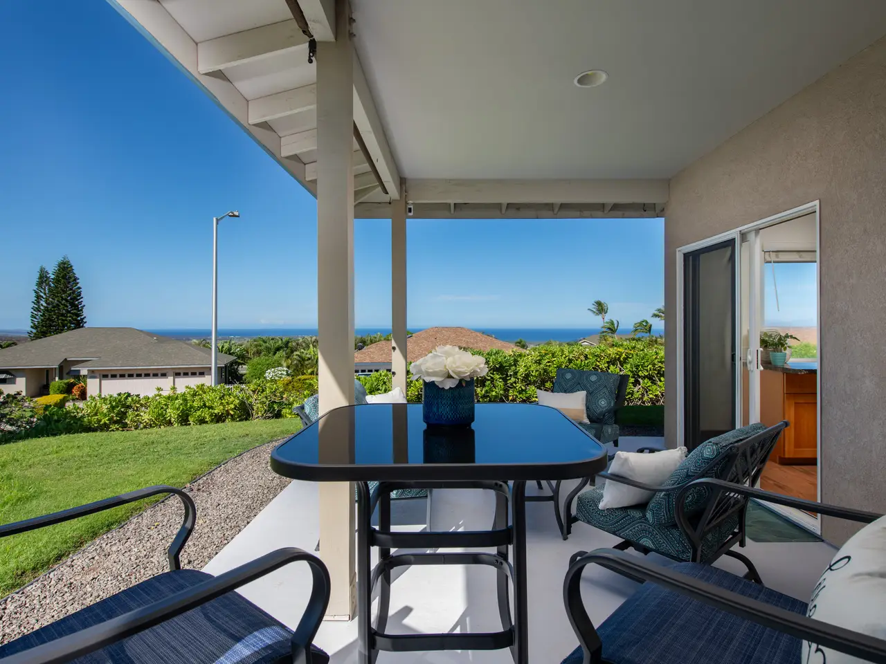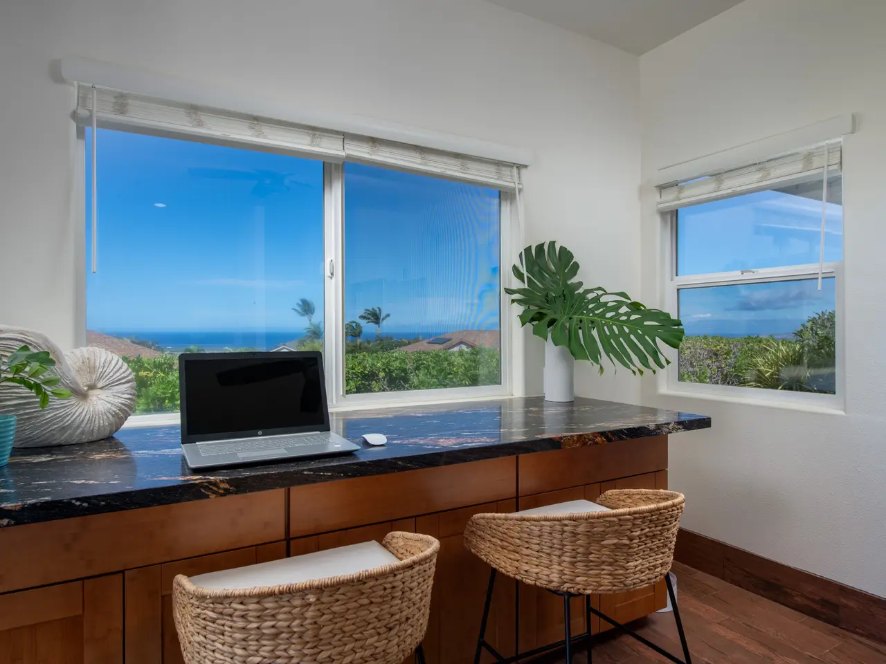 With sweeping 180-degree ocean views and a backdrop of 5 volcanoes, this home captures the beauty and balance of Big Island life. Located in the desirable Sunset Ridge neighborhood of Waikoloa Village, this single-level, move-in-ready residence blends thoughtful design, energy efficiency, and modern convenience. Highlights: Energy Smart Living: 24 fully owned solar panels with Powerwall battery backup keep electric bills around $50 a month. Views from Every Angle: Ocean and coastline views from the kitchen, primary suite, and covered lanais. Single-Level Ease: Flat front and backyards make everyday living simple and accessible. Tropical Surrounds: Mature fruit trees, vibrant flowering plants, and extra storage. 3-Car Garage: 660 sq. ft. with workstation and organized tool storage. EV Ready: Plug-in ChargePoint charger on a dedicated 240-volt circuit. Interior Details: The kitchen is the heart of the home, featuring Magma Black granite counters, modern appliances, an expanded pantry, and a new breakfast bar with storage—all perfectly positioned to take in ocean views, creating an easy indoor-outdoor flow. The primary suite is private and light-filled, with ocean views, a private lanai, dual vanities, a walk-in shower, and a generous walk-in closet. Both bathrooms have been upgraded with Costa Smeralda green granite and tiled walk-in showers. Additional Improvements: New septic tank & line, New lava rock wall with concrete base & drainage, rebuilt sprinkler system with new controller, Fujitsu Split Air Conditioning Located in Waikoloa Village. This Sunset Ridge home sits on a quiet cul-de-sac surrounded by wide streets and sidewalks. Residents enjoy access to the 18-hole Golf Course, tennis courts, and a community pool, adding to the relaxed lifestyle of the neighborhood. Just minutes from shopping and dining, and only 20 minutes to Hawaii’s best beaches and world-class resorts.