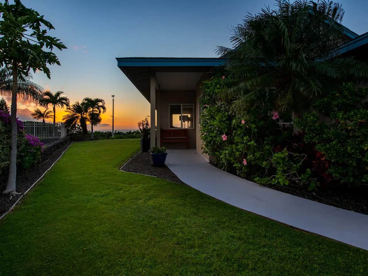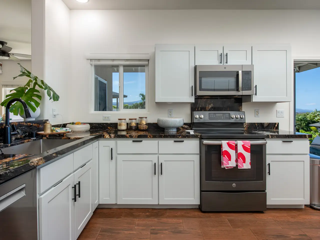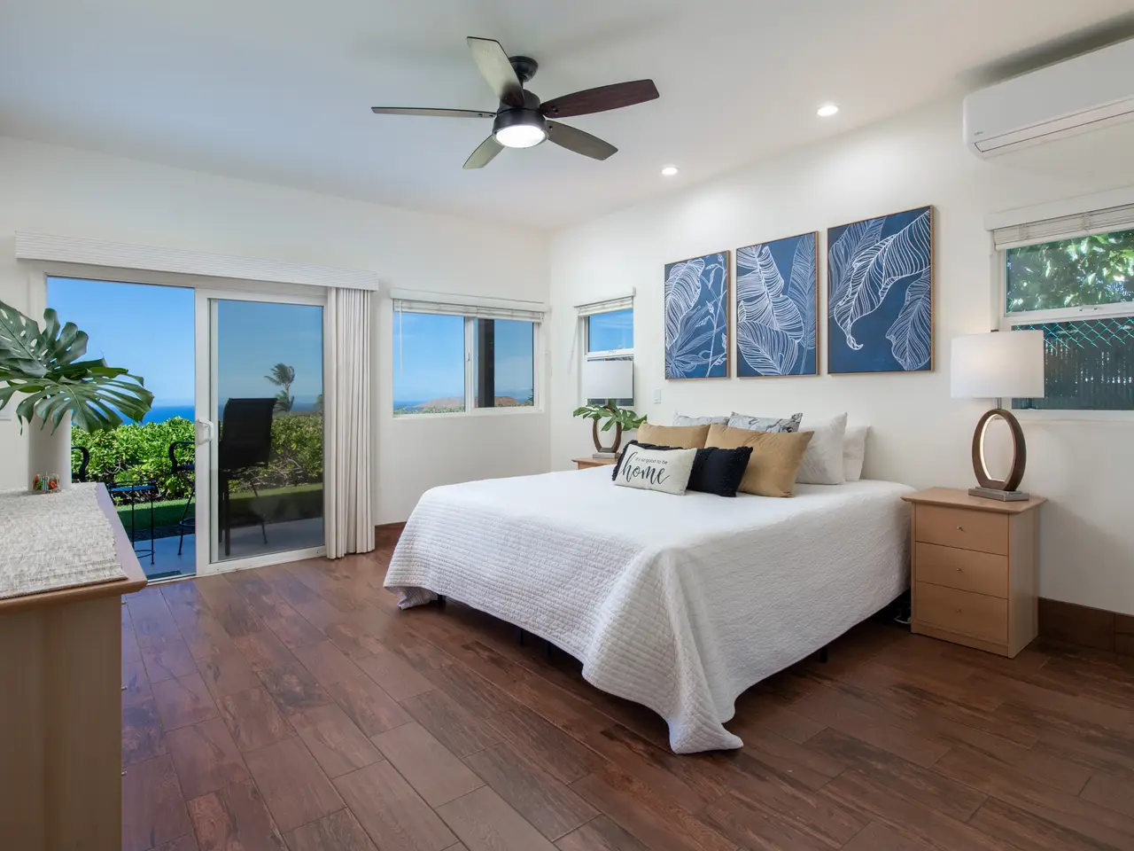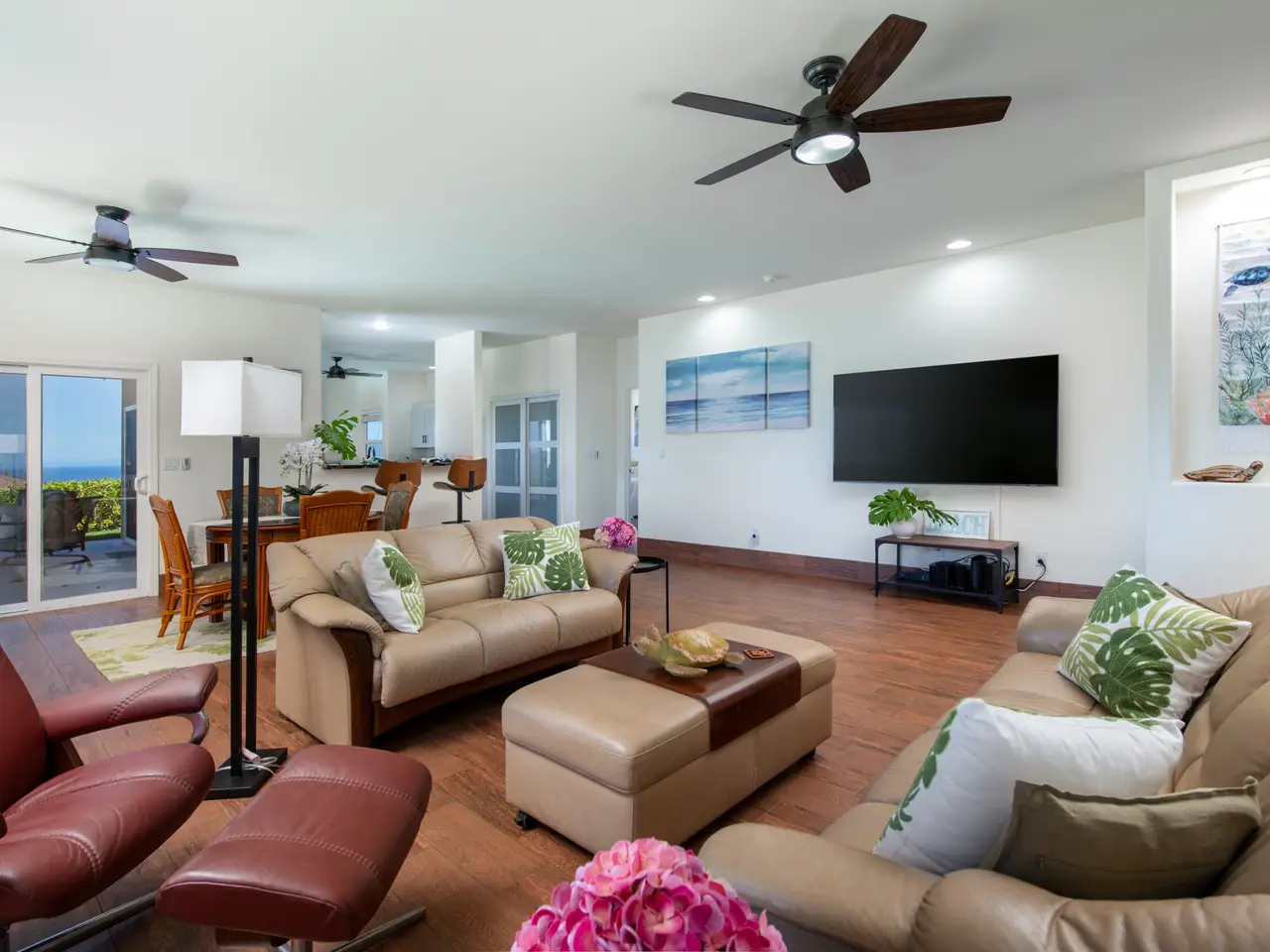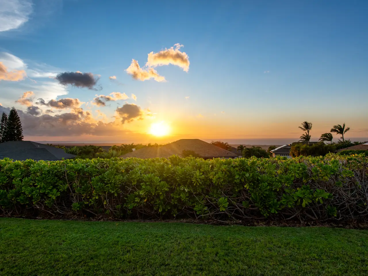 With sweeping 180-degree ocean views and a backdrop of 5 volcanoes, this home captures the beauty and balance of Big Island life. Located in the desirable Sunset Ridge neighborhood of Waikoloa Village, this single-level, move-in-ready residence blends thoughtful design, energy efficiency, and modern convenience. Highlights: Energy Smart Living: 24 fully owned solar panels with Powerwall battery backup keep electric bills around $50 a month. Views from Every Angle: Ocean and coastline views from the kitchen, primary suite, and covered lanais. Single-Level Ease: Flat front and backyards make everyday living simple and accessible. Tropical Surrounds: Mature fruit trees, vibrant flowering plants, and extra storage. 3-Car Garage: 660 sq. ft. with workstation and organized tool storage. EV Ready: Plug-in ChargePoint charger on a dedicated 240-volt circuit. Interior Details: The kitchen is the heart of the home, featuring Magma Black granite counters, modern appliances, an expanded pantry, and a new breakfast bar with storage—all perfectly positioned to take in ocean views, creating an easy indoor-outdoor flow. The primary suite is private and light-filled, with ocean views, a private lanai, dual vanities, a walk-in shower, and a generous walk-in closet. Both bathrooms have been upgraded with Costa Smeralda green granite and tiled walk-in showers. Additional Improvements: New septic tank & line, New lava rock wall with concrete base & drainage, rebuilt sprinkler system with new controller, Fujitsu Split Air Conditioning Located in Waikoloa Village. This Sunset Ridge home sits on a quiet cul-de-sac surrounded by wide streets and sidewalks. Residents enjoy access to the 18-hole Golf Course, tennis courts, and a community pool, adding to the relaxed lifestyle of the neighborhood. Just minutes from shopping and dining, and only 20 minutes to Hawaii’s best beaches and world-class resorts.