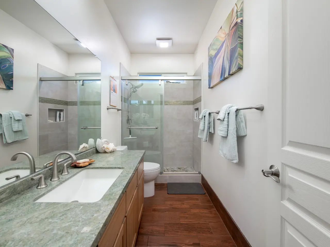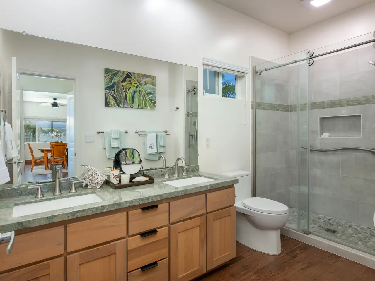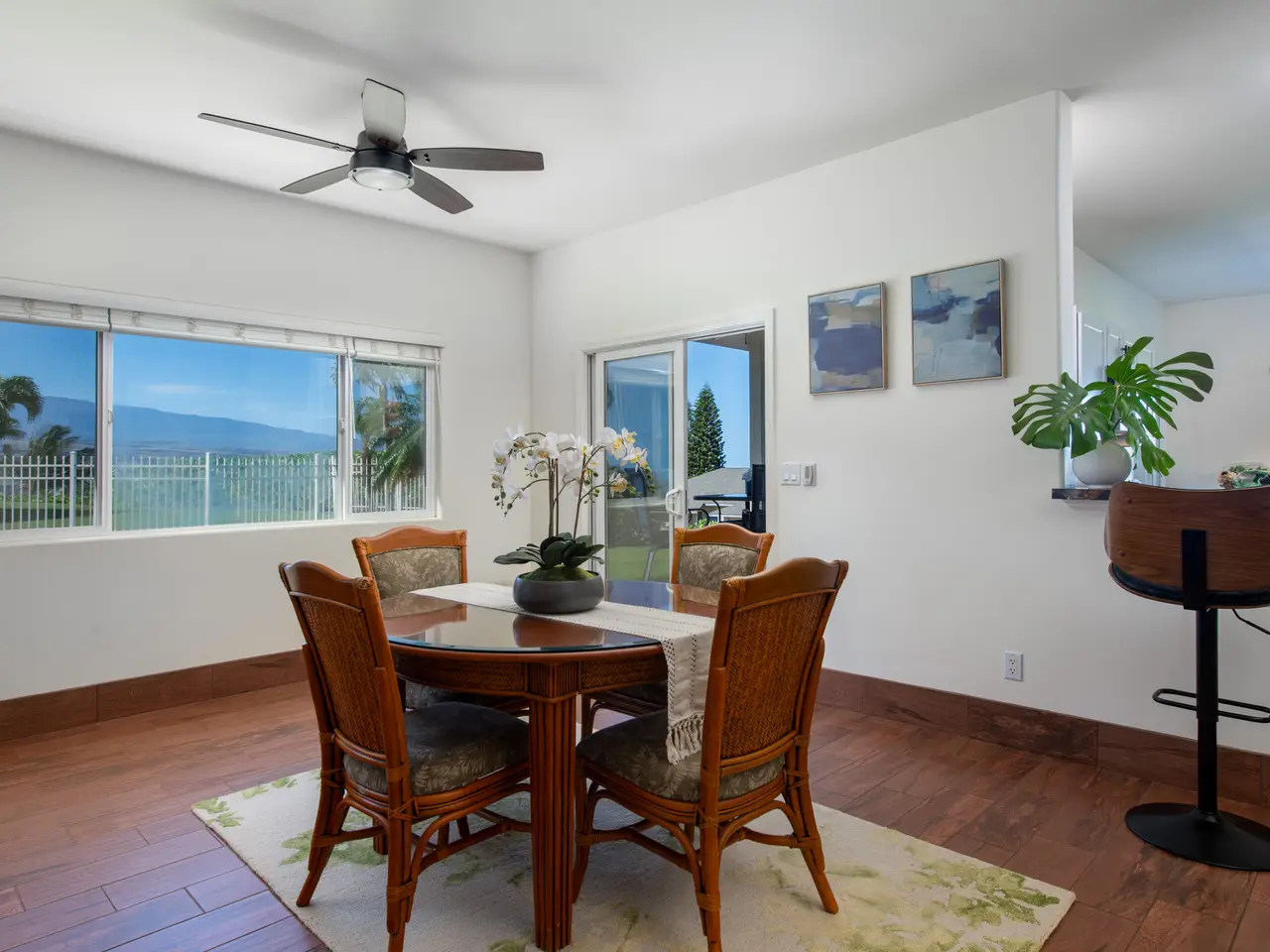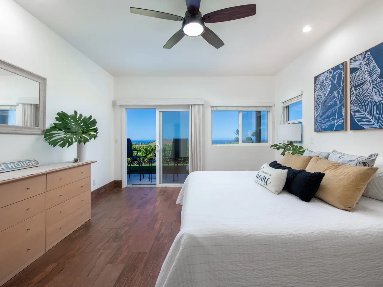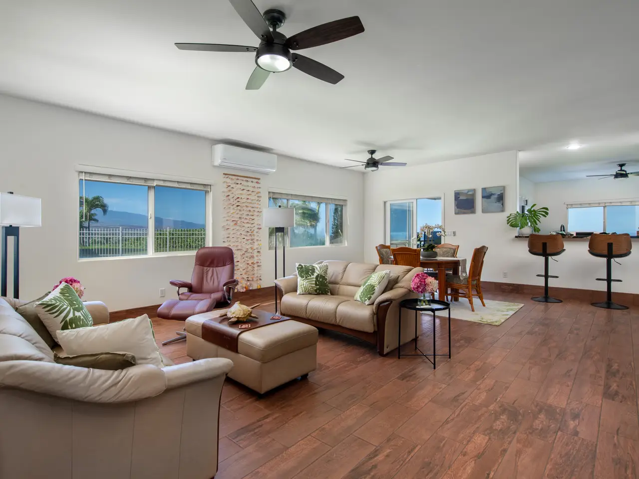 With sweeping 180-degree ocean views and a backdrop of 5 volcanoes, this home captures the beauty and balance of Big Island life. Located in the desirable Sunset Ridge neighborhood of Waikoloa Village, this single-level, move-in-ready residence blends thoughtful design, energy efficiency, and modern convenience. Highlights: Energy Smart Living: 24 fully owned solar panels with Powerwall battery backup keep electric bills around $50 a month. Views from Every Angle: Ocean and coastline views from the kitchen, primary suite, and covered lanais. Single-Level Ease: Flat front and backyards make everyday living simple and accessible. Tropical Surrounds: Mature fruit trees, vibrant flowering plants, and extra storage. 3-Car Garage: 660 sq. ft. with workstation and organized tool storage. EV Ready: Plug-in ChargePoint charger on a dedicated 240-volt circuit. Interior Details: The kitchen is the heart of the home, featuring Magma Black granite counters, modern appliances, an expanded pantry, and a new breakfast bar with storage—all perfectly positioned to take in ocean views, creating an easy indoor-outdoor flow. The primary suite is private and light-filled, with ocean views, a private lanai, dual vanities, a walk-in shower, and a generous walk-in closet. Both bathrooms have been upgraded with Costa Smeralda green granite and tiled walk-in showers. Additional Improvements: New septic tank & line, New lava rock wall with concrete base & drainage, rebuilt sprinkler system with new controller, Fujitsu Split Air Conditioning Located in Waikoloa Village. This Sunset Ridge home sits on a quiet cul-de-sac surrounded by wide streets and sidewalks. Residents enjoy access to the 18-hole Golf Course, tennis courts, and a community pool, adding to the relaxed lifestyle of the neighborhood. Just minutes from shopping and dining, and only 20 minutes to Hawaii’s best beaches and world-class resorts.