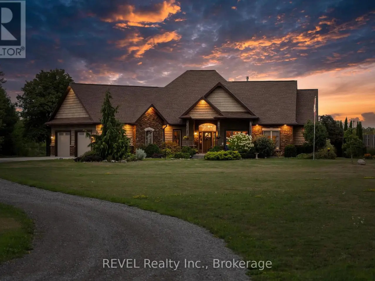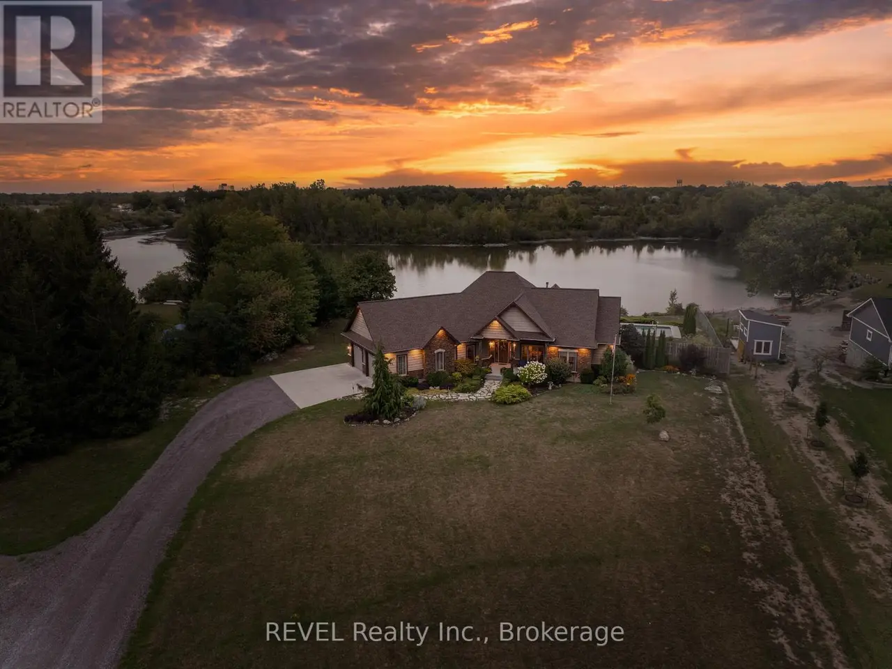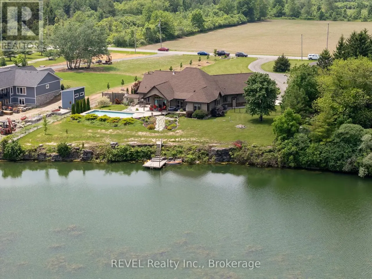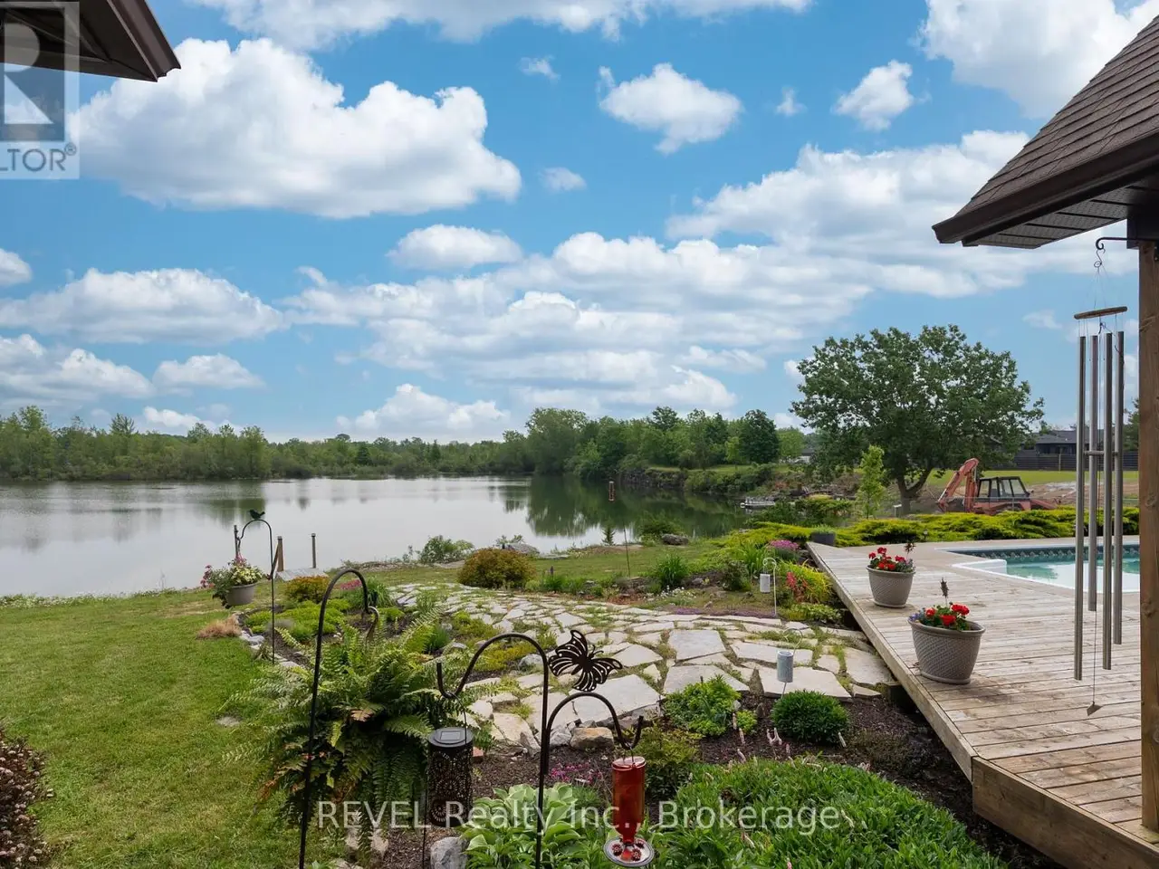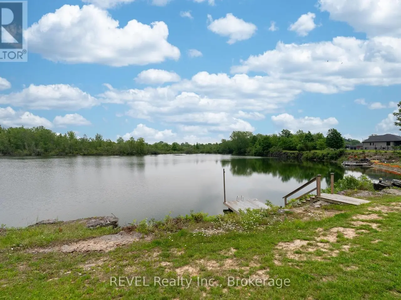 Located just outside the City of Port Colborne with sweeping Wainfleet views, this beautifully appointed bungalow backs onto the serene Port Colborne Quarry Pond and includes .5 acres of owned underwater land, offering an unmatched setting for water recreation and peaceful living. The home blends cottage charm with modern comfort, featuring four bedrooms and two bathrooms, including a private primary suite overlooking the pond with a luxurious 5-piece ensuite boasting a tile walk-in shower, soaker tub, and walk-in closet. The open-concept main floor is designed for both relaxation and entertaining, with vaulted ceilings in the living room, a striking stone gas fireplace, and large windows that frame the stunning quarry views. The kitchen is well-equipped with quartz countertops, a large island with bartop seating, stainless steel appliances, and a generous pantry, flowing seamlessly into the living and dining areas with rich hardwood flooring and real wood doors throughout. Two additional main-floor bedrooms, a full 4-piece bathroom, and an office that can serve as a fourth bedroom provide ample space for family or guests. A large covered rear deck with a vaulted roof extends your living space outdoors, overlooking an eight-year-old inground pool with a new pump and filter ideal for summer enjoyment. Additional highlights include a main-floor laundry room, an extra-large attached two-car garage, a 35x40-foot detached shop with full vehicle lift and air compressor, and a 5-foot height unfinished basement for storage. With a cistern water supply and a location that offers a true Muskoka-like experience just minutes from all local amenities, this home delivers the ultimate blend of lifestyle, privacy, and practicality.
