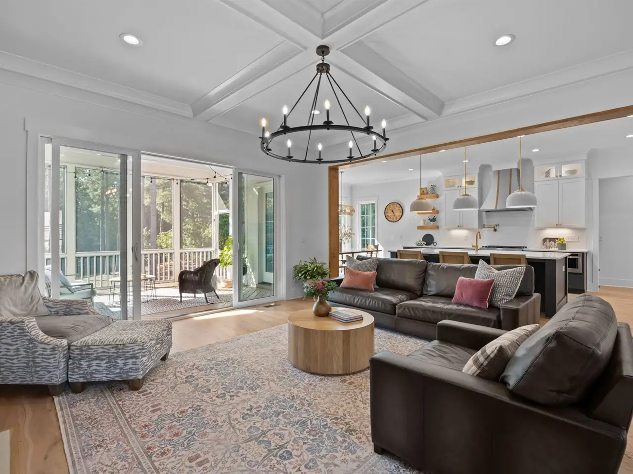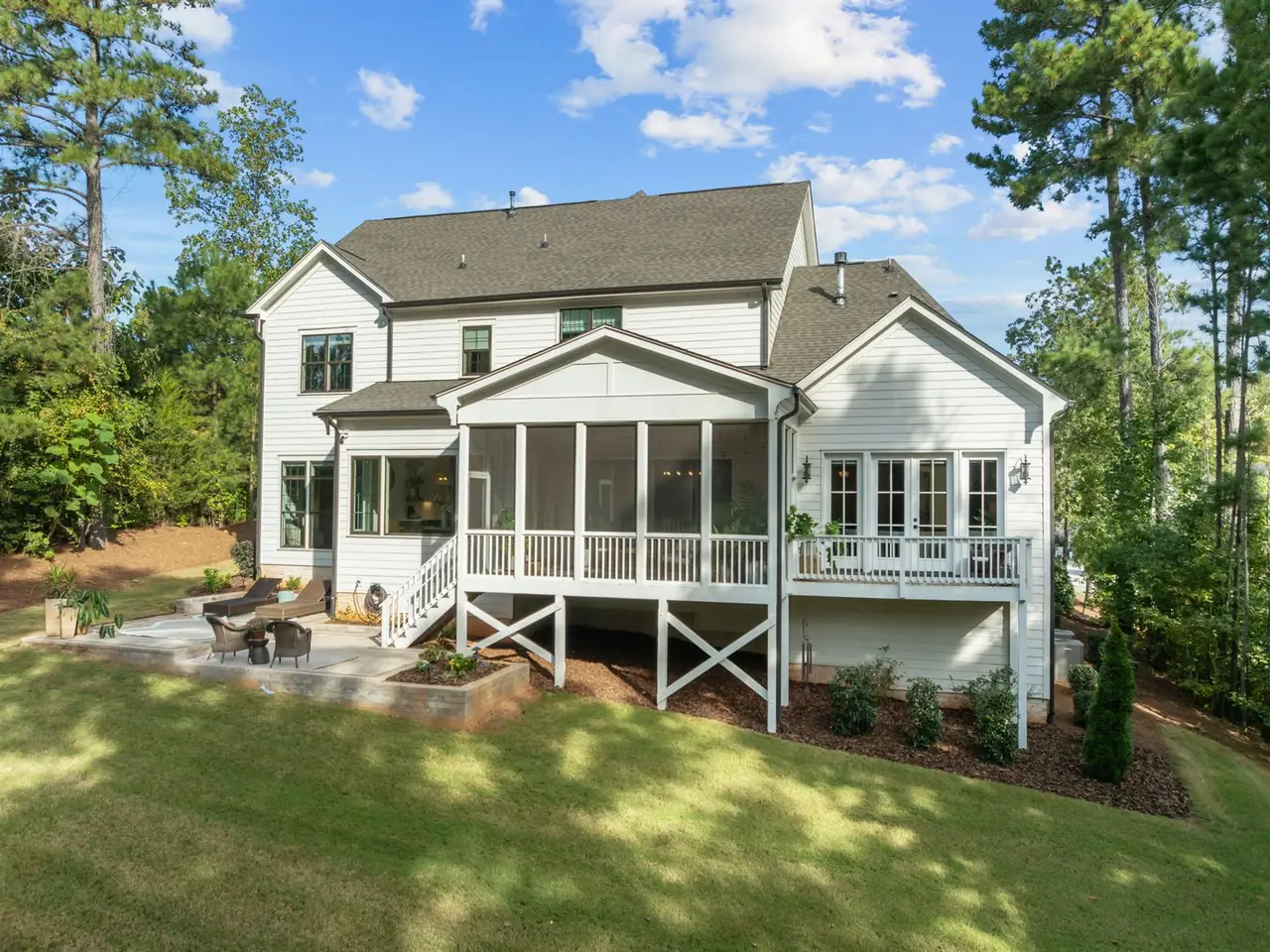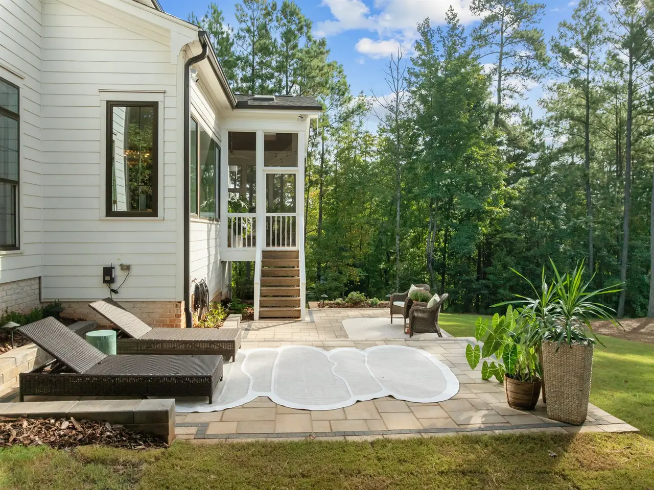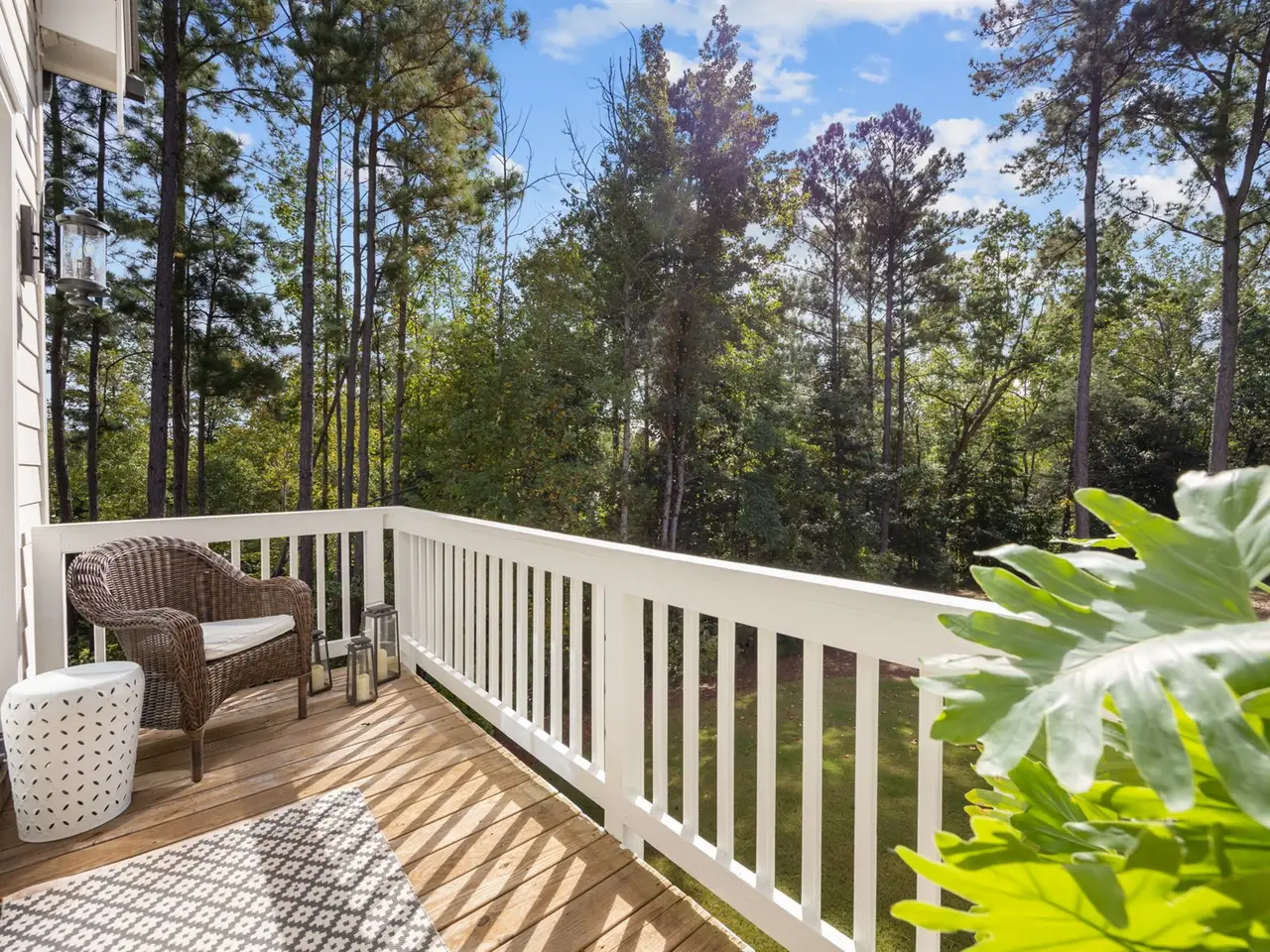 Southern charm meets modern luxury in this stunning home on a spacious 1.29-acre lot! From the moment you enter, you'll appreciate the hardwood floors throughout (Tile in baths) and custom finishes. The open-concept family room flows seamlessly into a gourmet kitchen featuring a large center island, quartz countertops, an impressive walk-in pantry, and a gas range-perfect for everyday living and entertaining. 1st floor office (can easily be used as guest suite) has walk-in closet and private full Bath. Enjoy the tranquil screened porch overlooking the expansive backyard with brand new patio. The main-level primary bedroom is a true retreat with vaulted ceilings accented by wood beams, private balcony, a spa-like bathroom with a walk-in shower, soaking tub, dual vanities, and a spacious walk-in closet with a convenient stackable washer/dryer hookup. Upstairs offers 3 additional bedrooms, 2 full baths (ensuite and jack and jill), a generous bonus room, gym, second laundry area, and two walk-in attic spaces for ample storage. The oversized 3 car garage completes the package. Located approximately one mile to Falls Lake and minutes to restaurants, shops-this home offers both convenience and serenity!